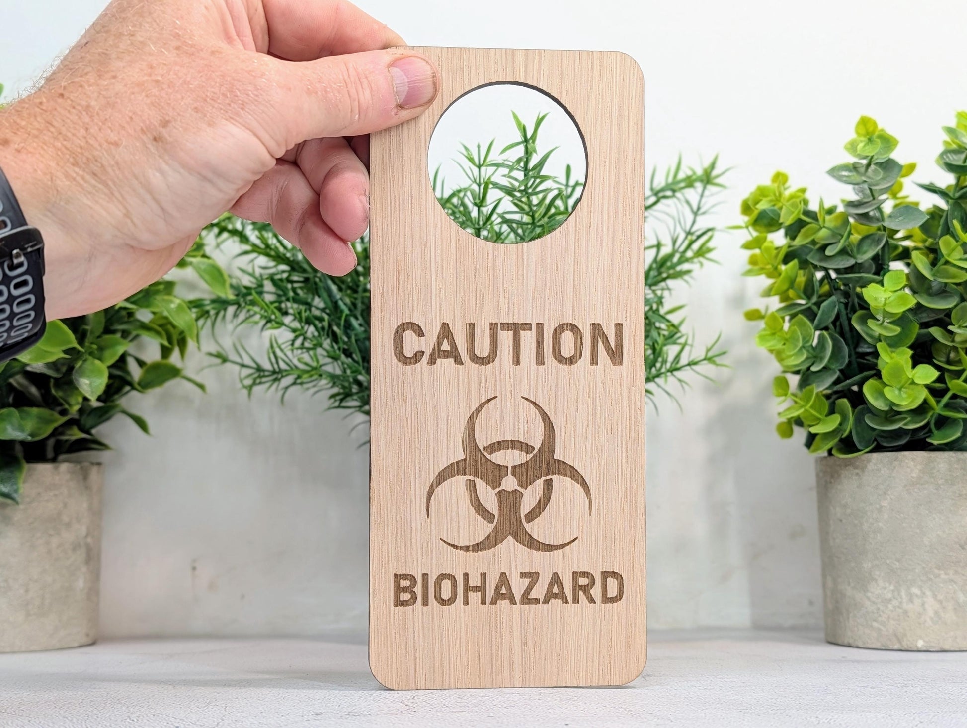 Caution Biohazard Door Hanger – Tall Oak Veneered Safety Sign, Wooden Single Sided, Handmade in Wales, Eco Packaging
