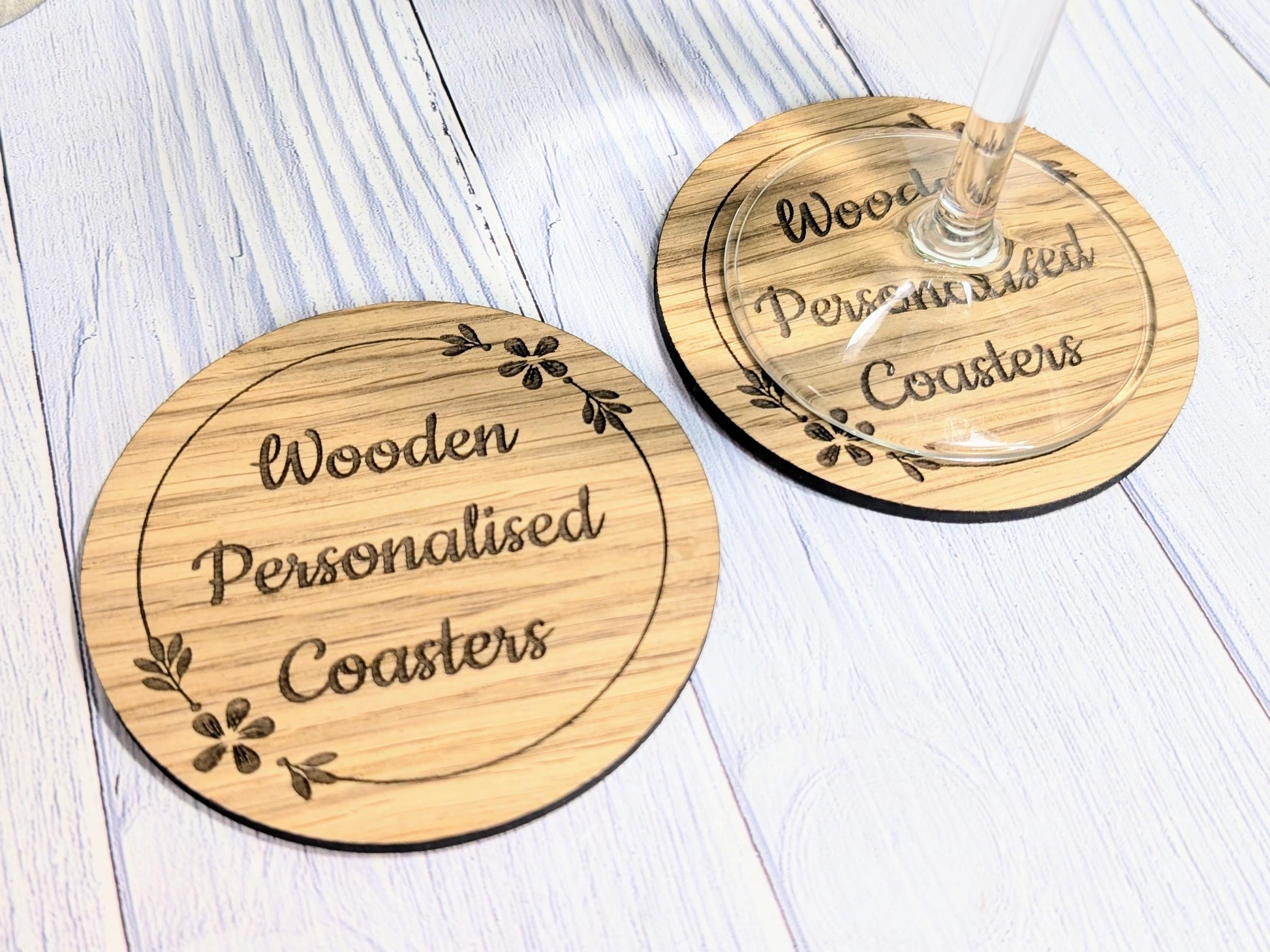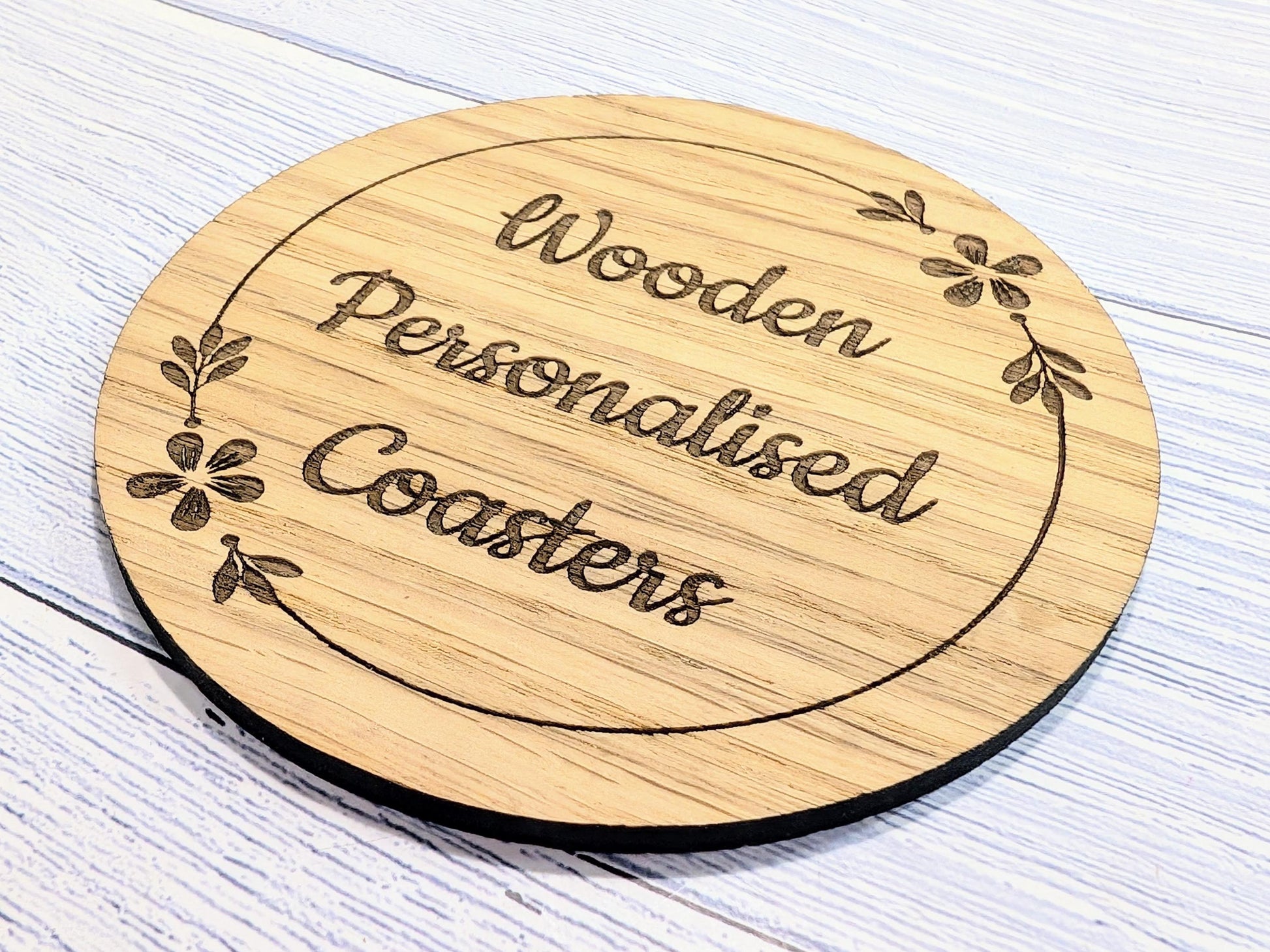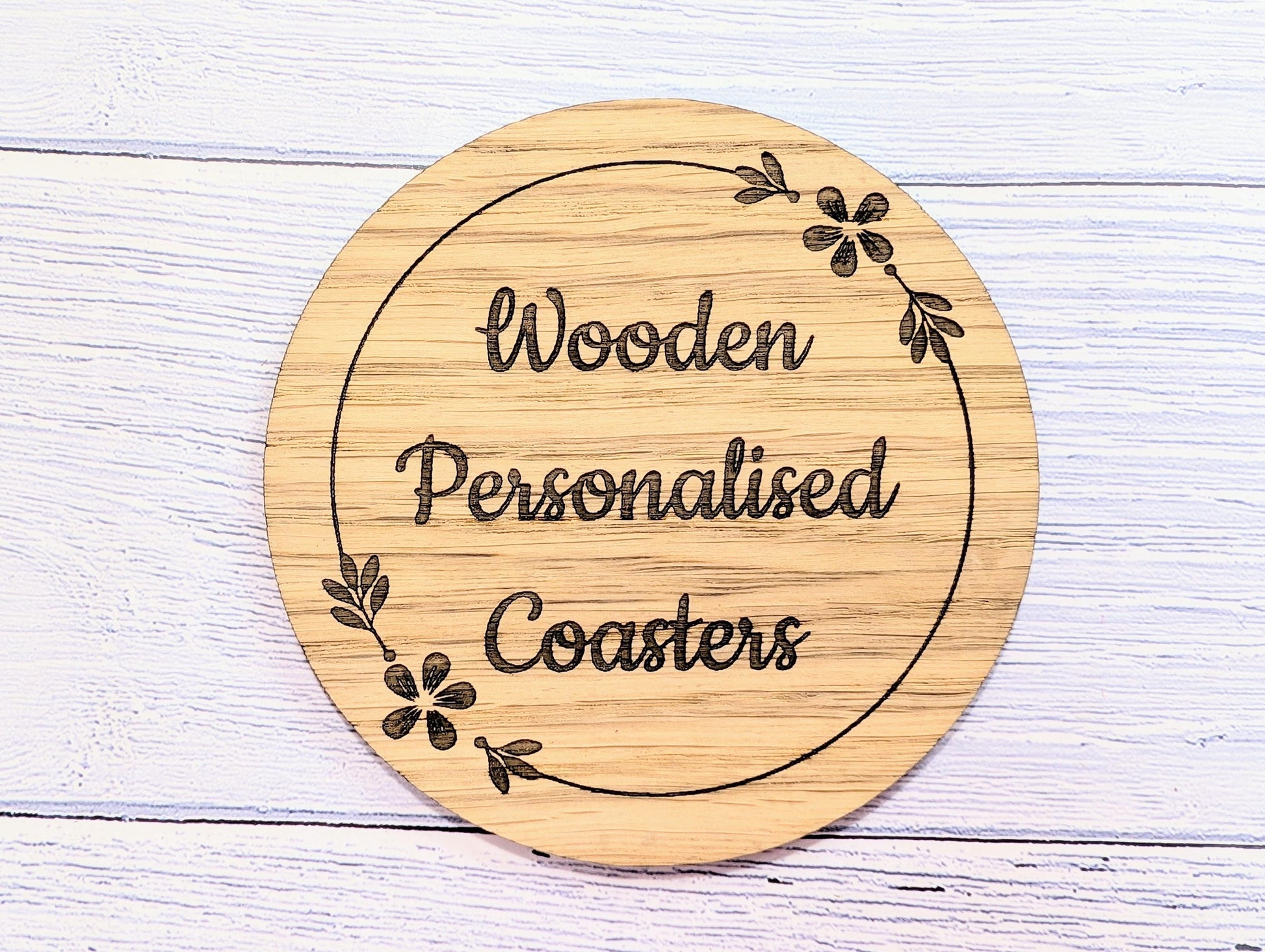 Custom Wooden Coasters – Eco-Friendly Gift, Personalised Text, Engraved Border – Bespoke Sustainable Craft, 100mm Diameter, Coffee & Tea