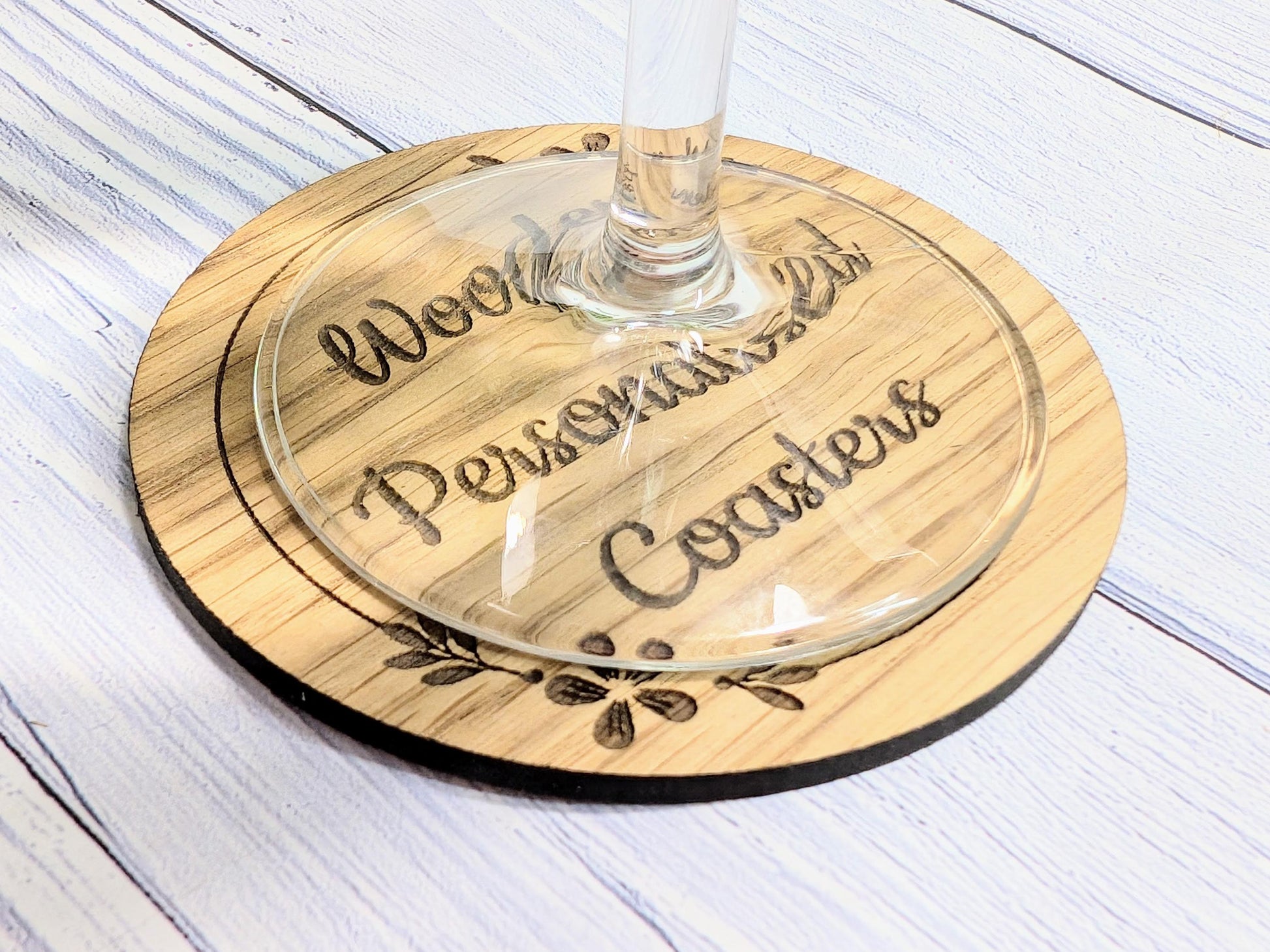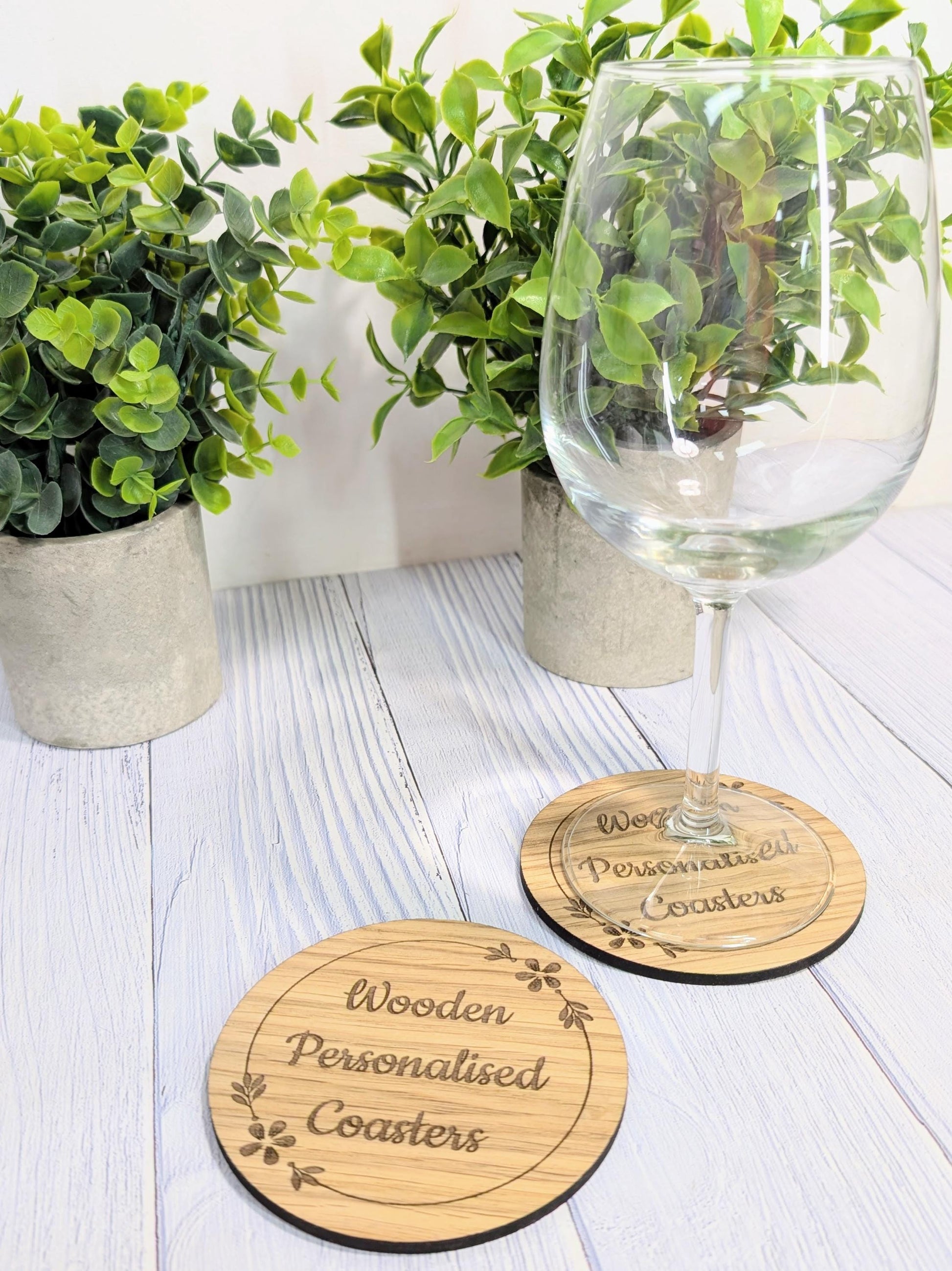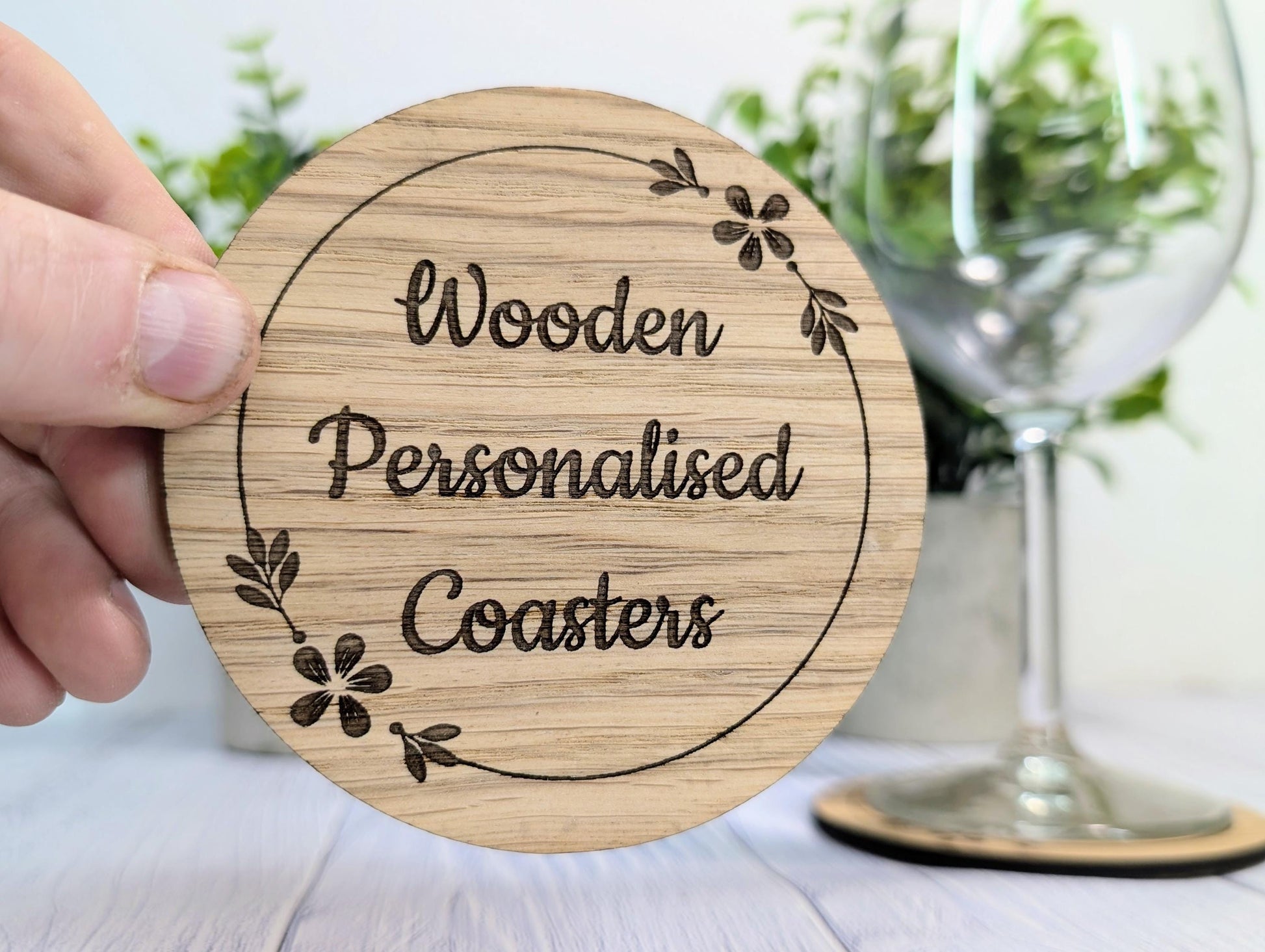 Custom Wooden Coasters – Eco-Friendly Gift, Personalised Text, Engraved Border – Bespoke Sustainable Craft, 100mm Diameter, Coffee & Tea