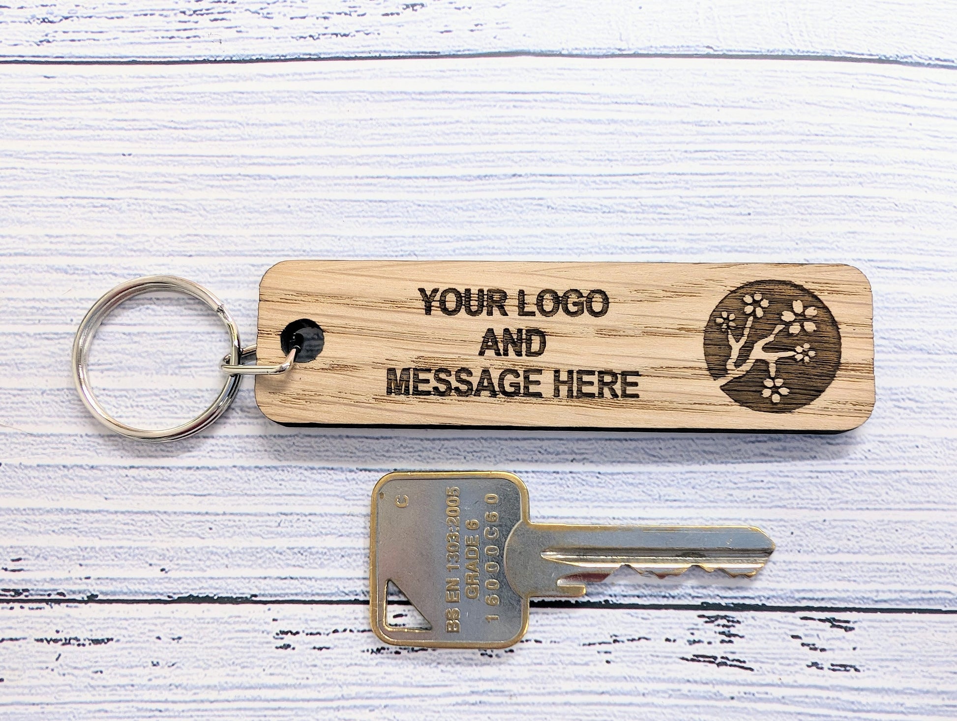 Customisable Double Sided Oak Keyring 90x25mm - Personalised Business Logo & Message | Bulk Orders, Corporate Gifts