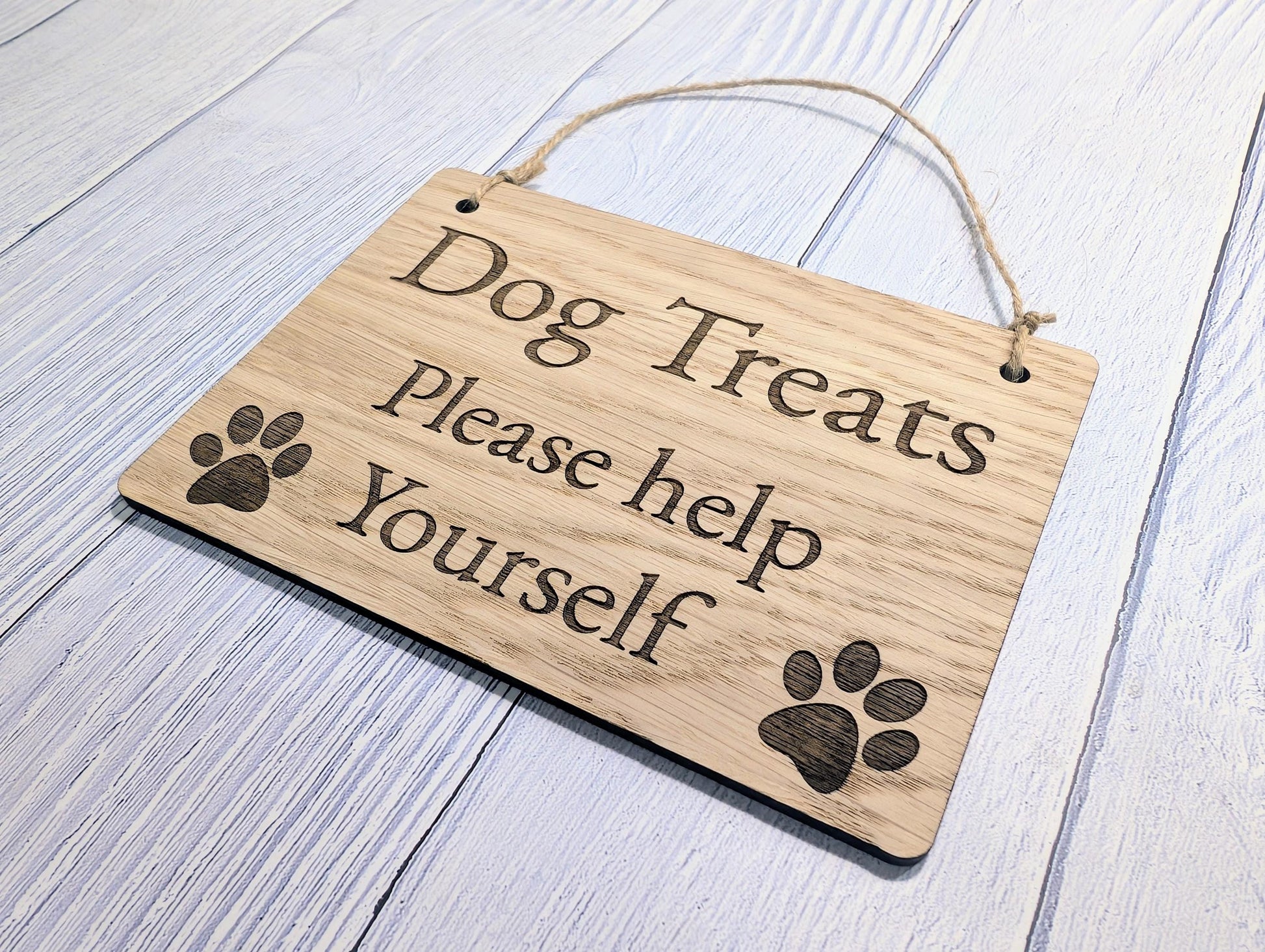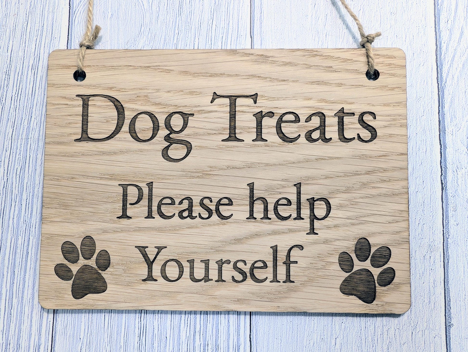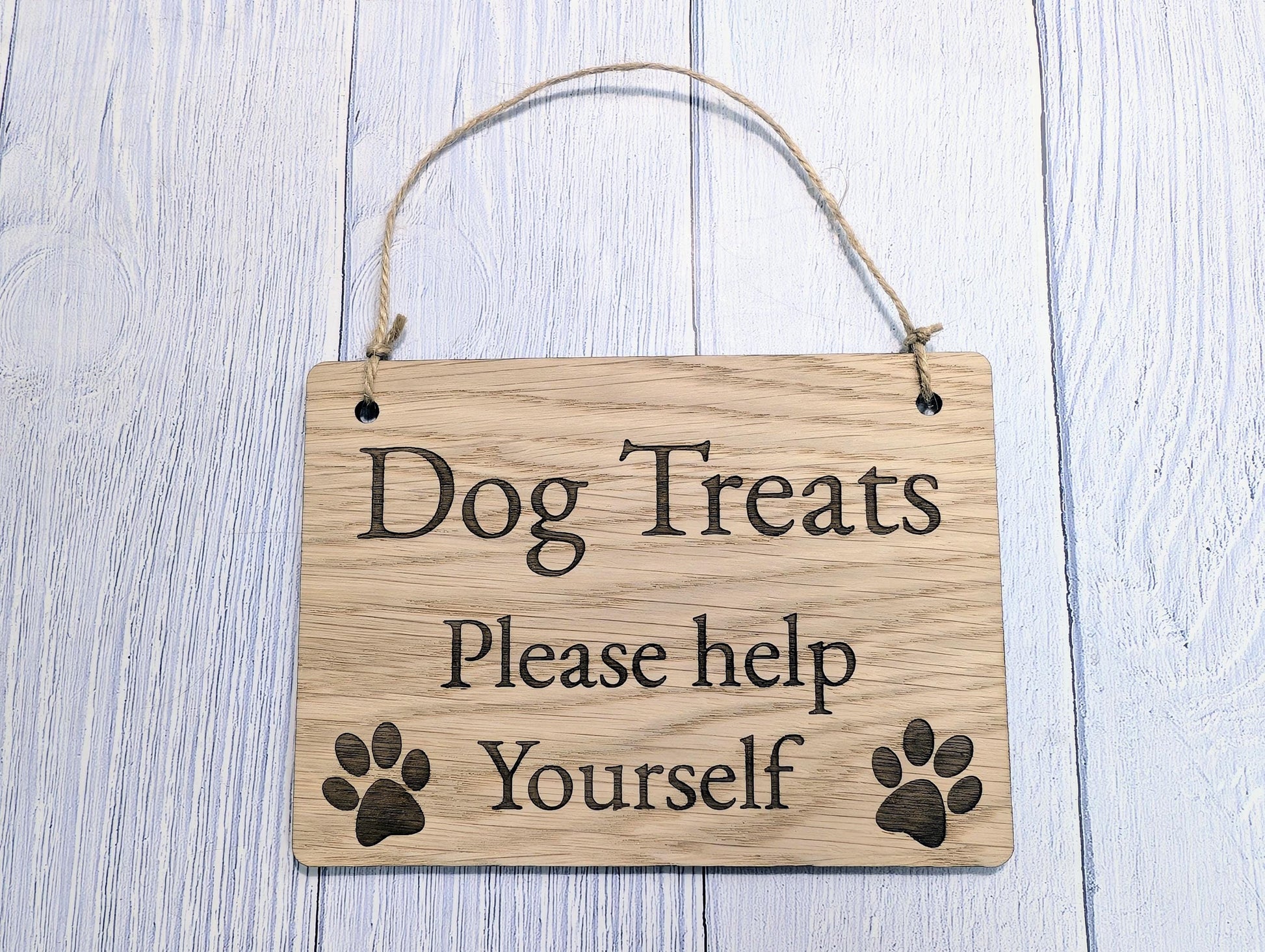 Dog Treats Please Help Yourself Sign – Solid Oak Plaque with Paw Prints – Rustic Wooden Dog Treat Station Sign – Handmade in Wales