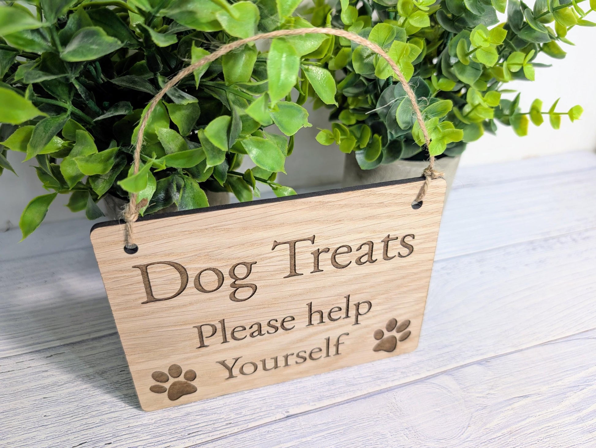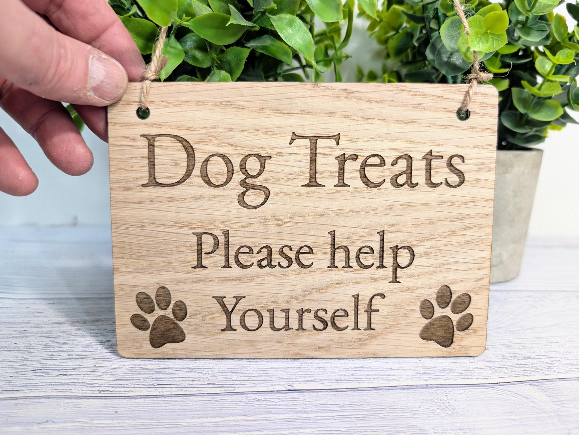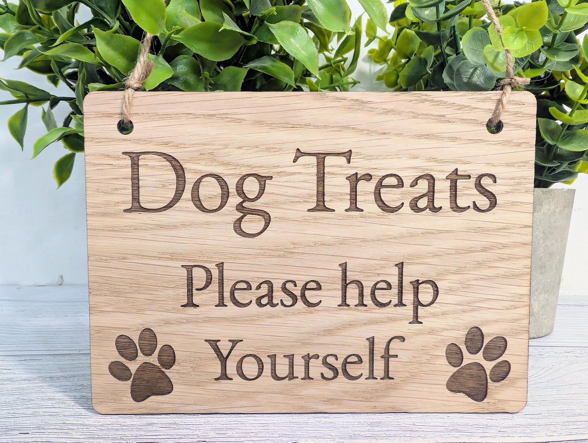 Dog Treats Please Help Yourself Sign – Solid Oak Plaque with Paw Prints – Rustic Wooden Dog Treat Station Sign – Handmade in Wales