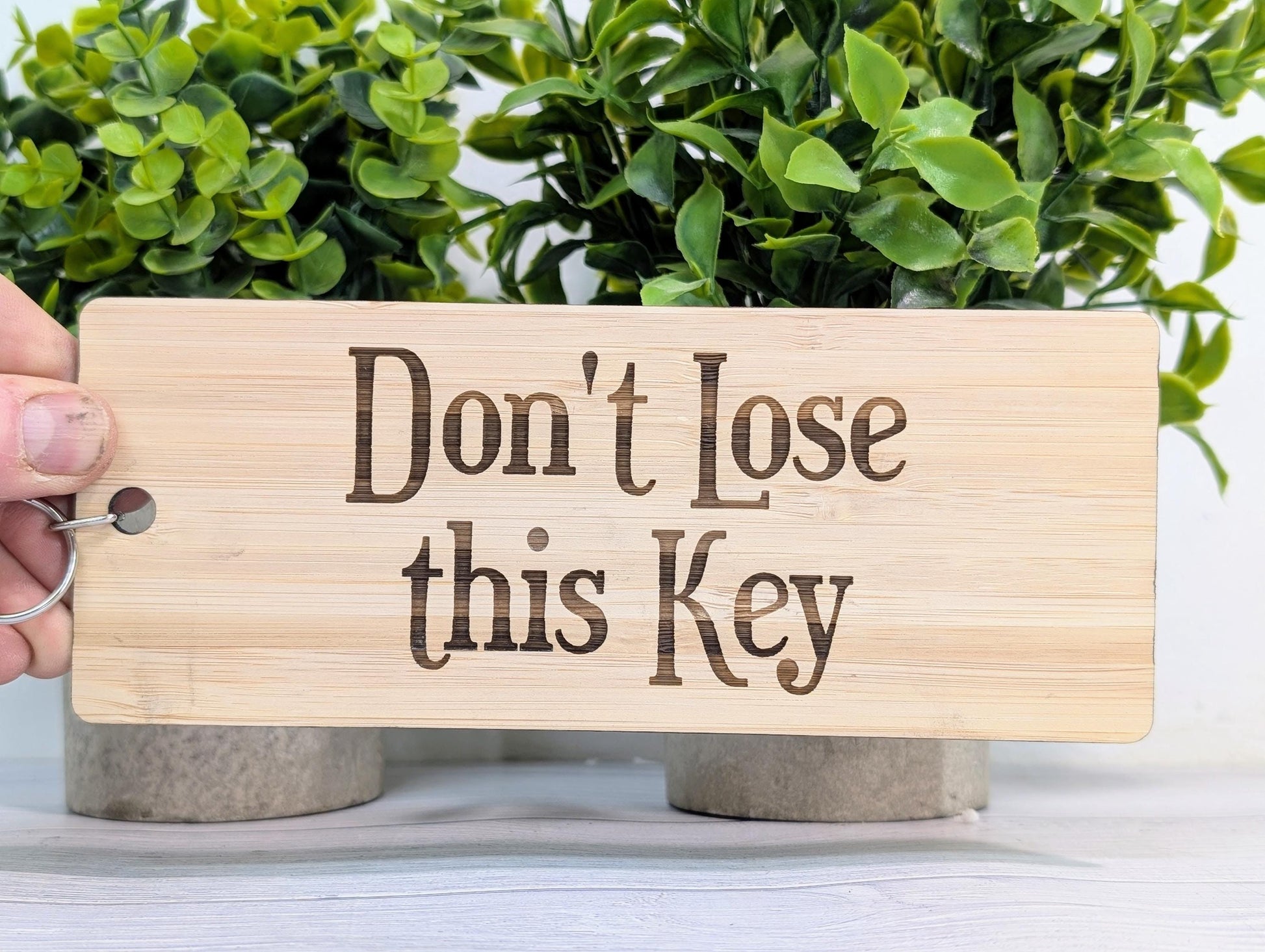 Say goodbye to misplaced keys with our extra-large, 200x80mm Bamboo keyring. Engraved with the straightforward message "Don't Lose This Key," this keyring is perfect for anyone who needs a little extra reminder or has an important key to keep track of.