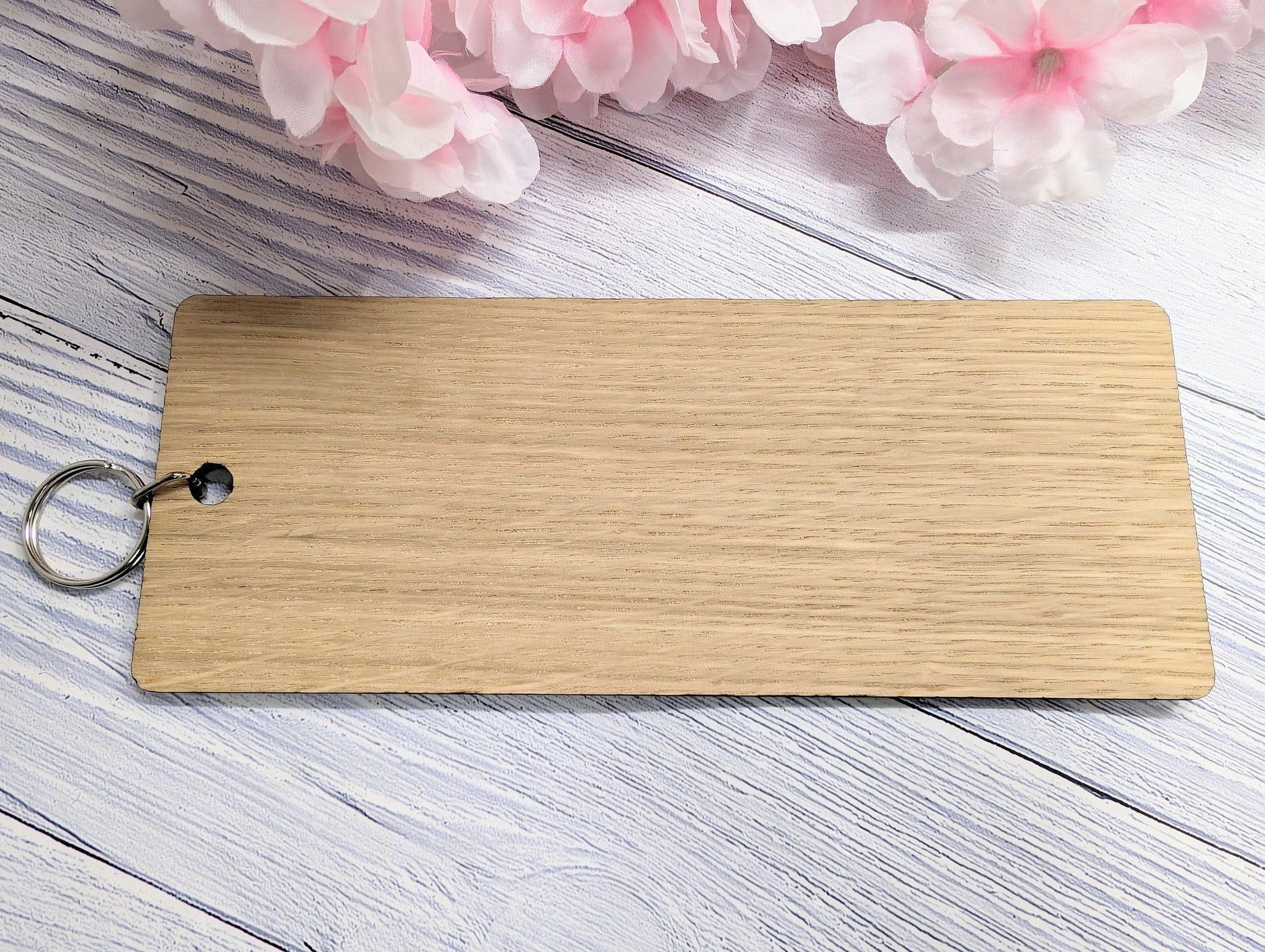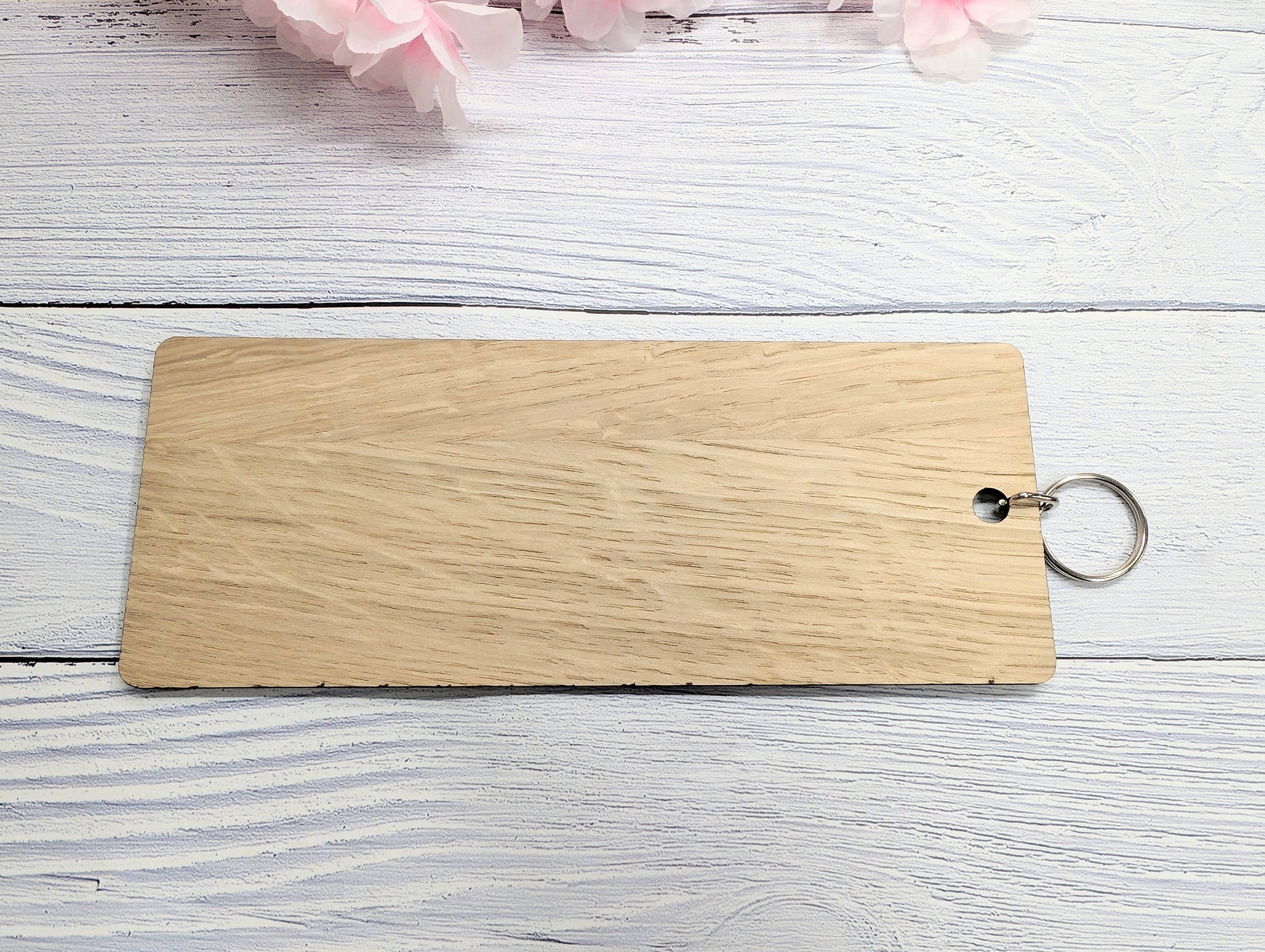 This custom keychain is made from a beautiful oak wood veneered MDF, which is laser precision cut to shape and Laser engraved. It measures 80mm x 200mm.