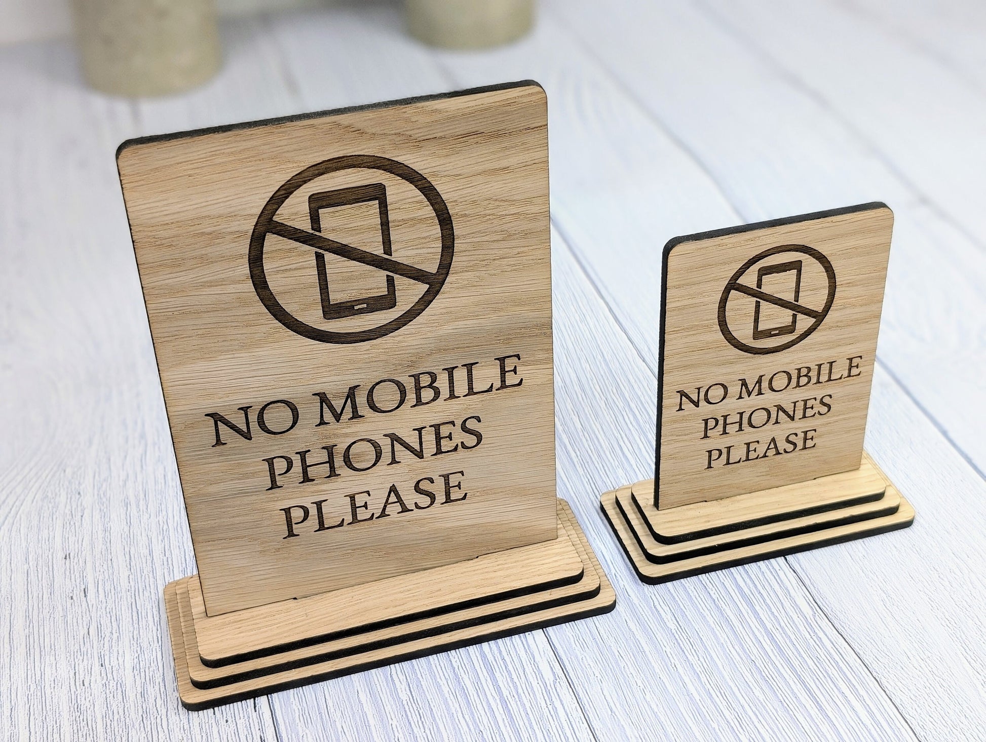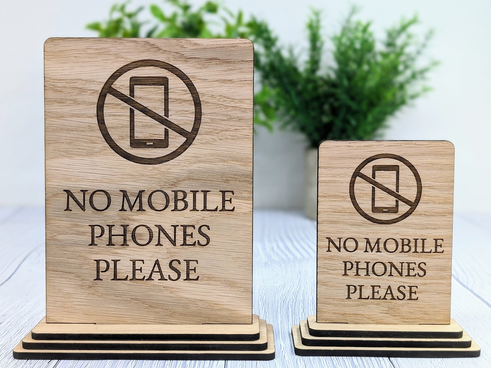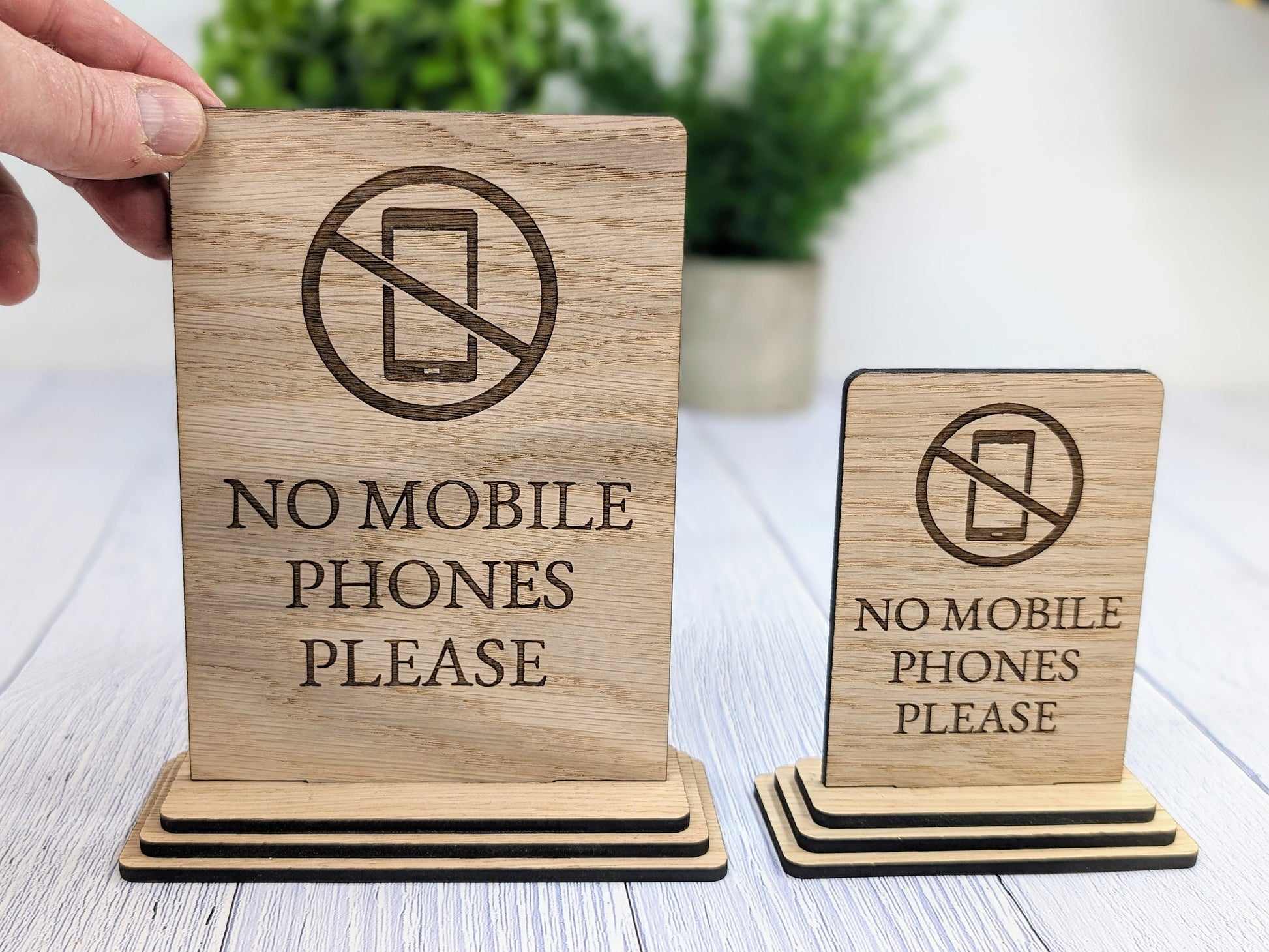 Freestanding "No Mobile Phones Please" Wooden Table Sign, Oak Finish, Ideal for Cafes, Restaurants & Public Spaces etc, 2 Sizes, Signage