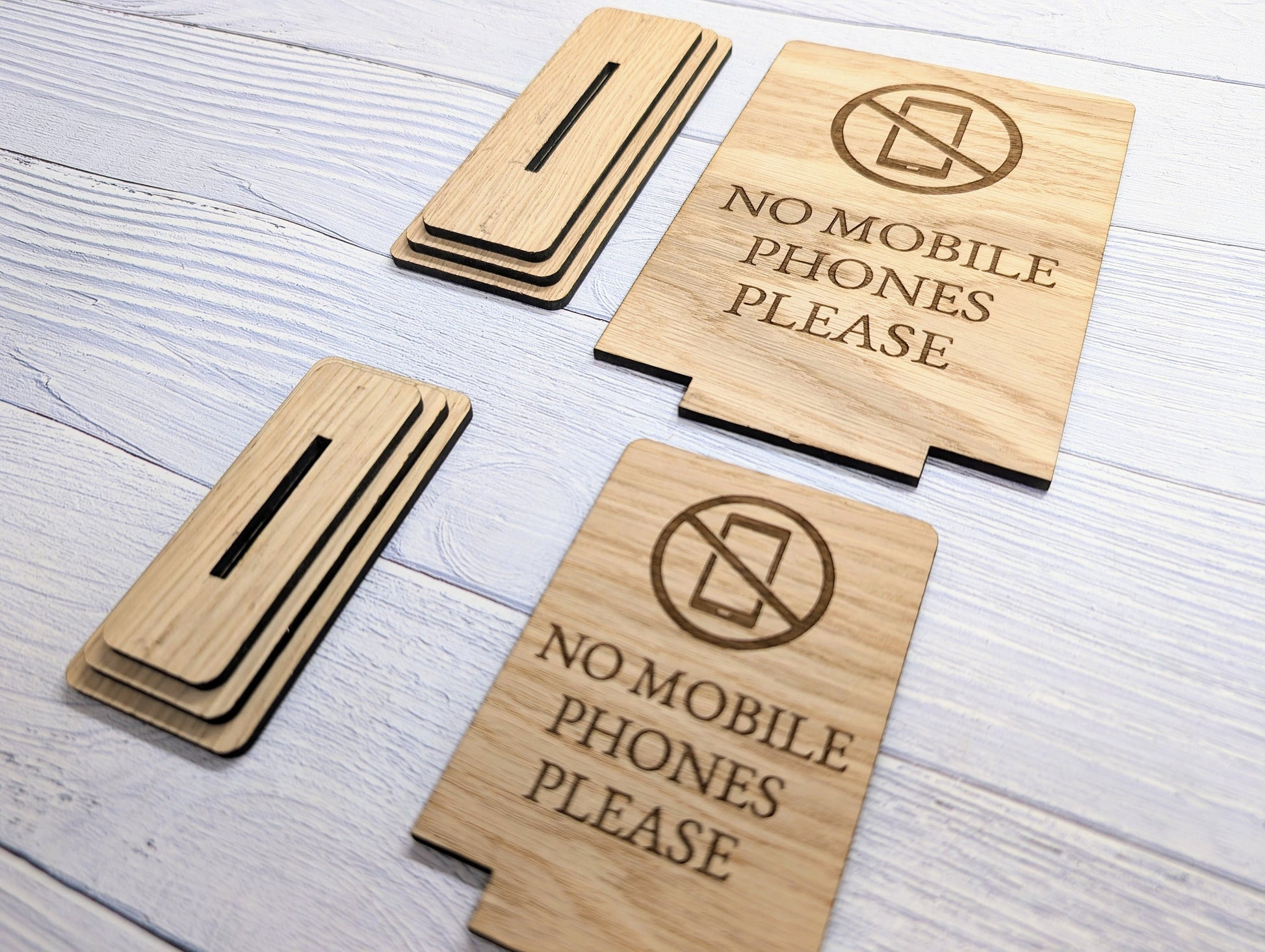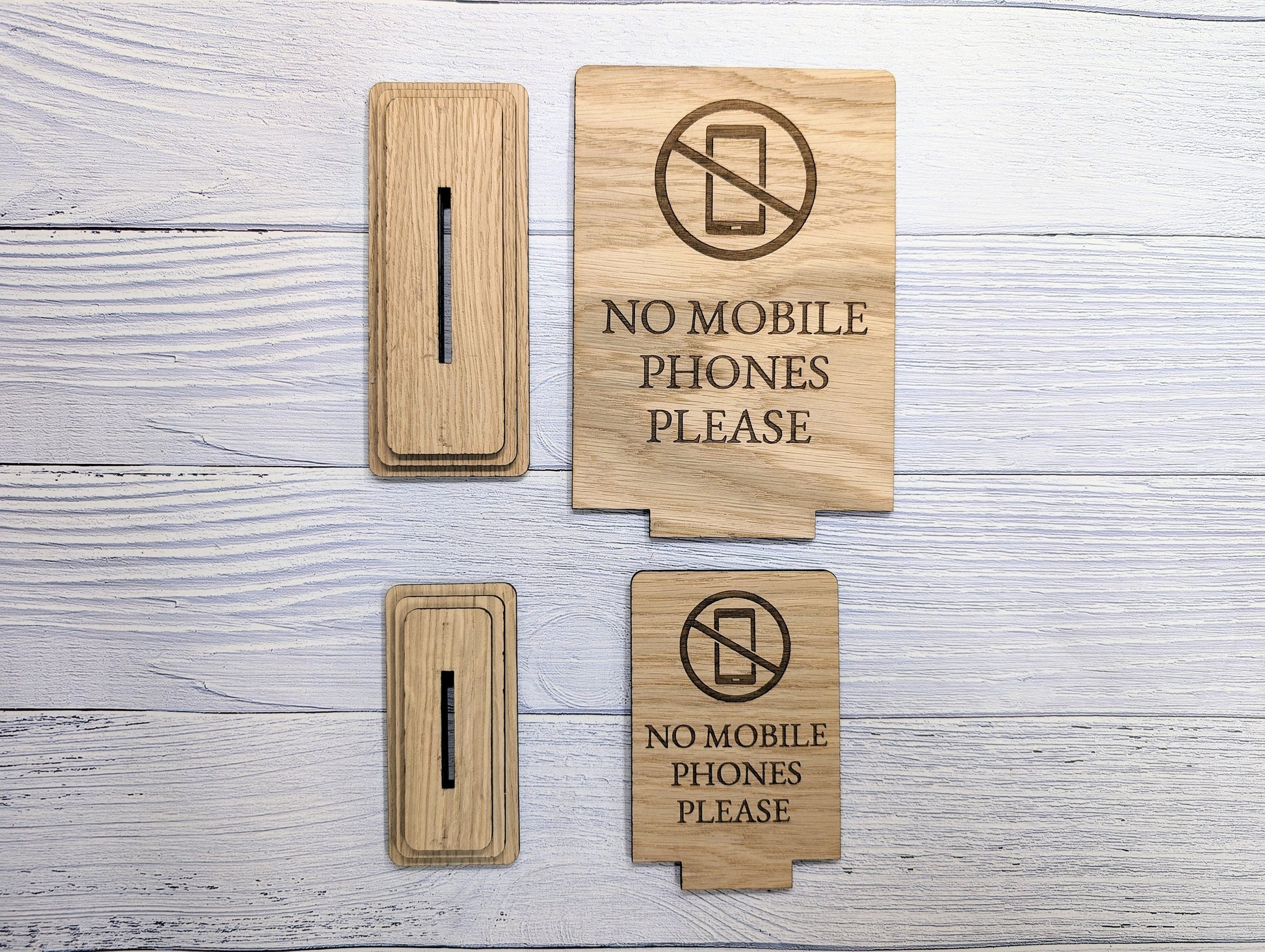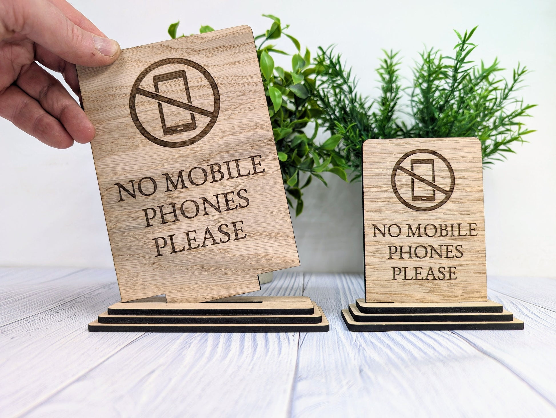 Freestanding "No Mobile Phones Please" Wooden Table Sign, Oak Finish, Ideal for Cafes, Restaurants & Public Spaces etc, 2 Sizes, Signage