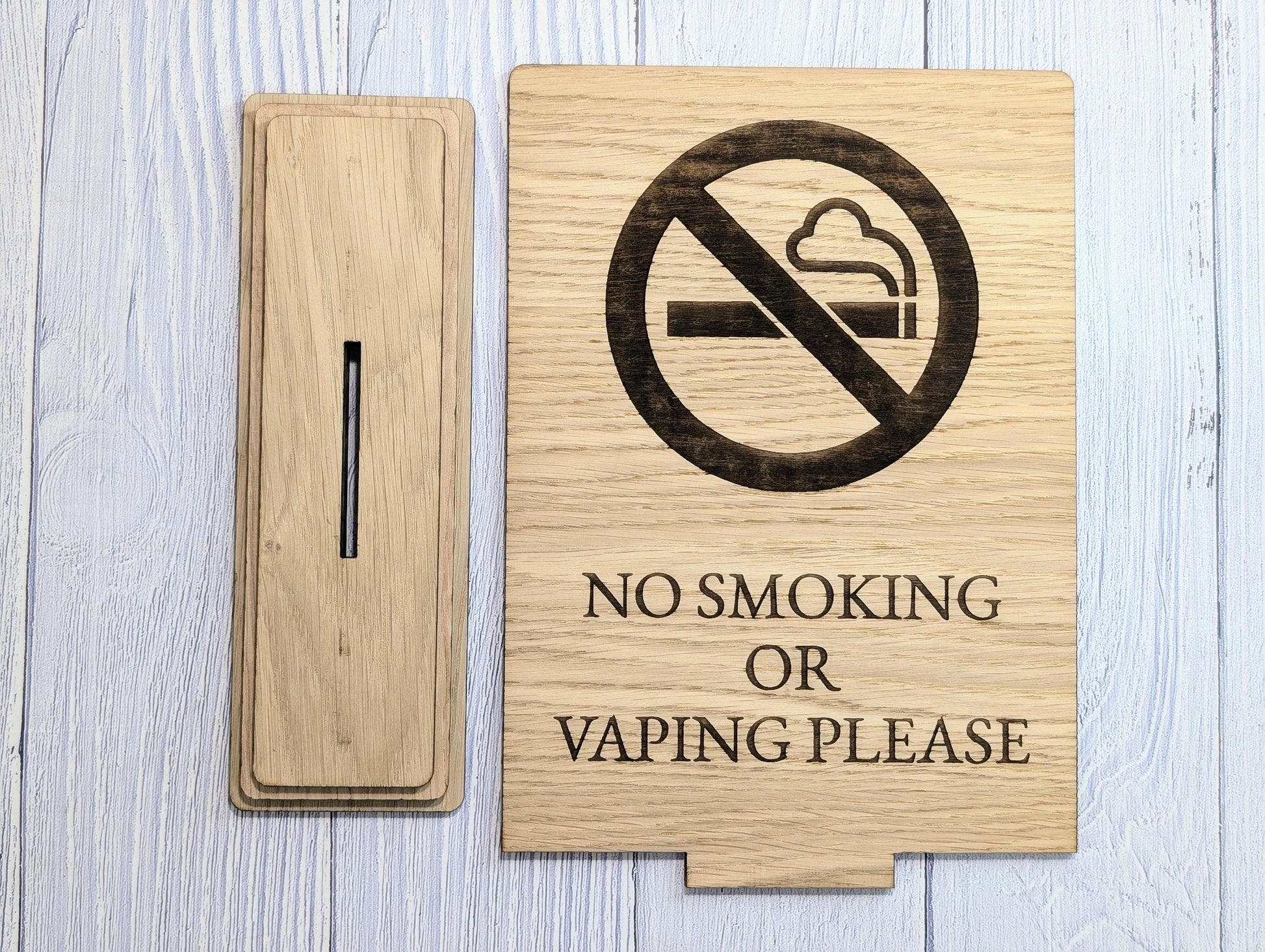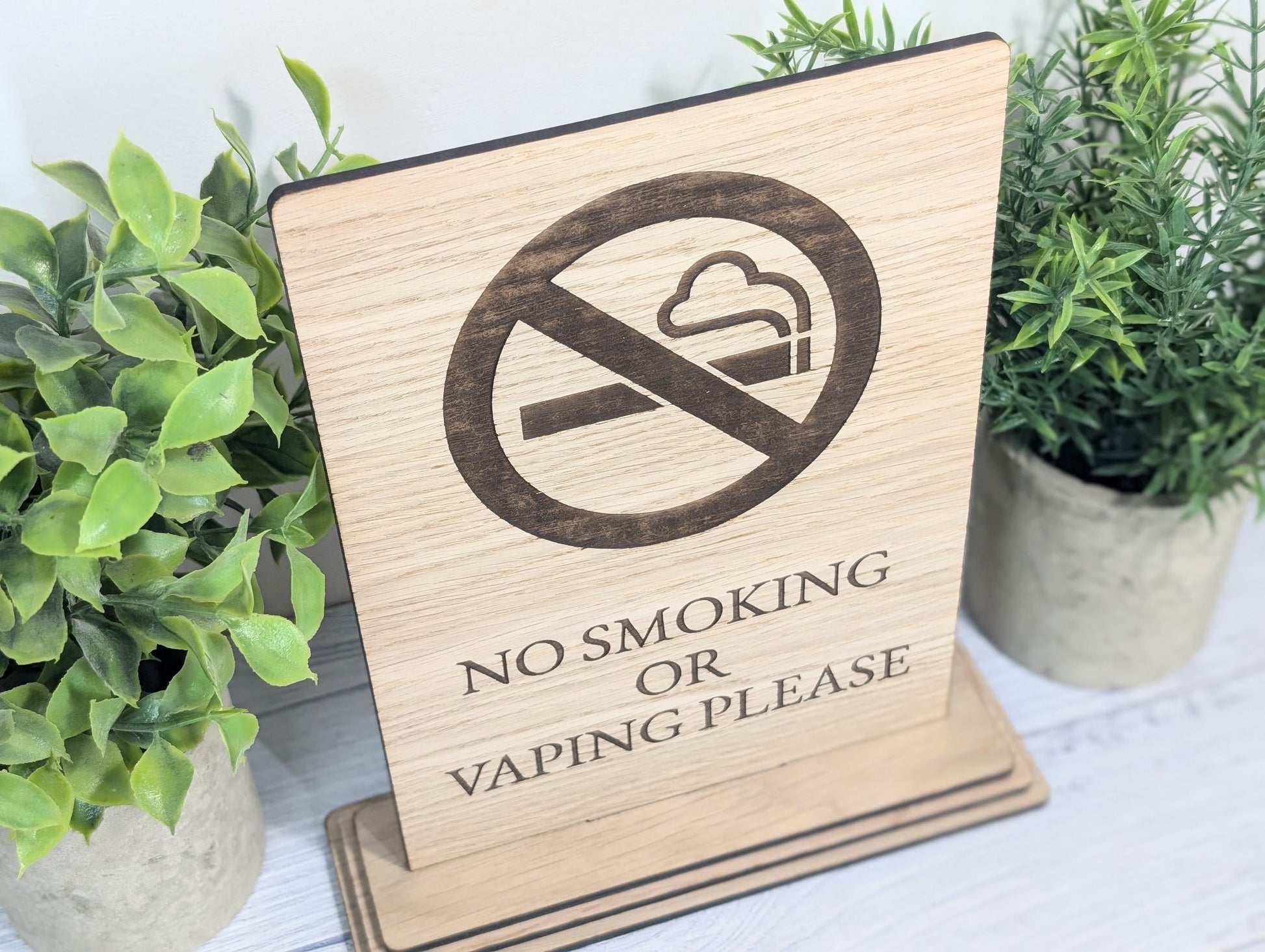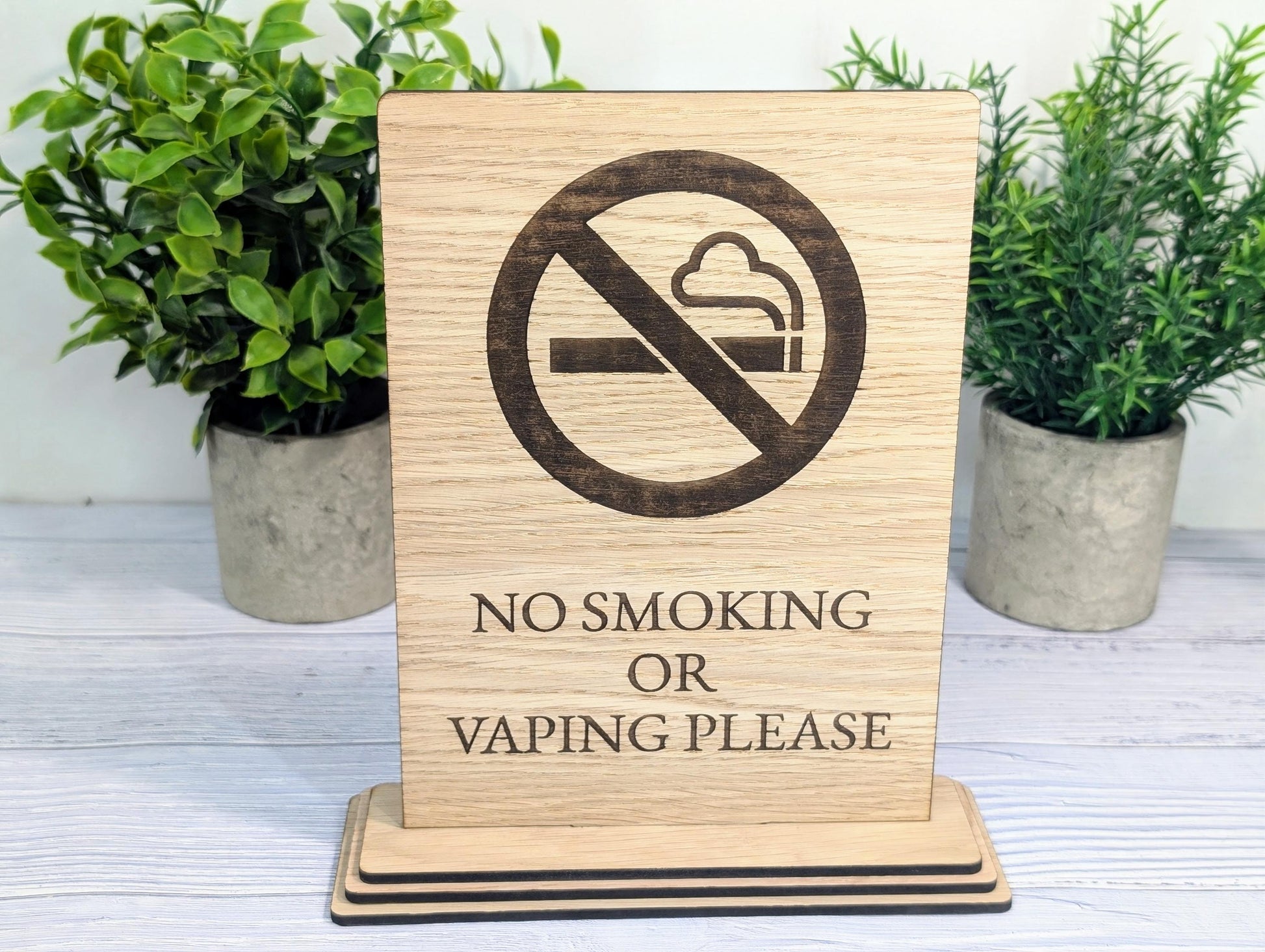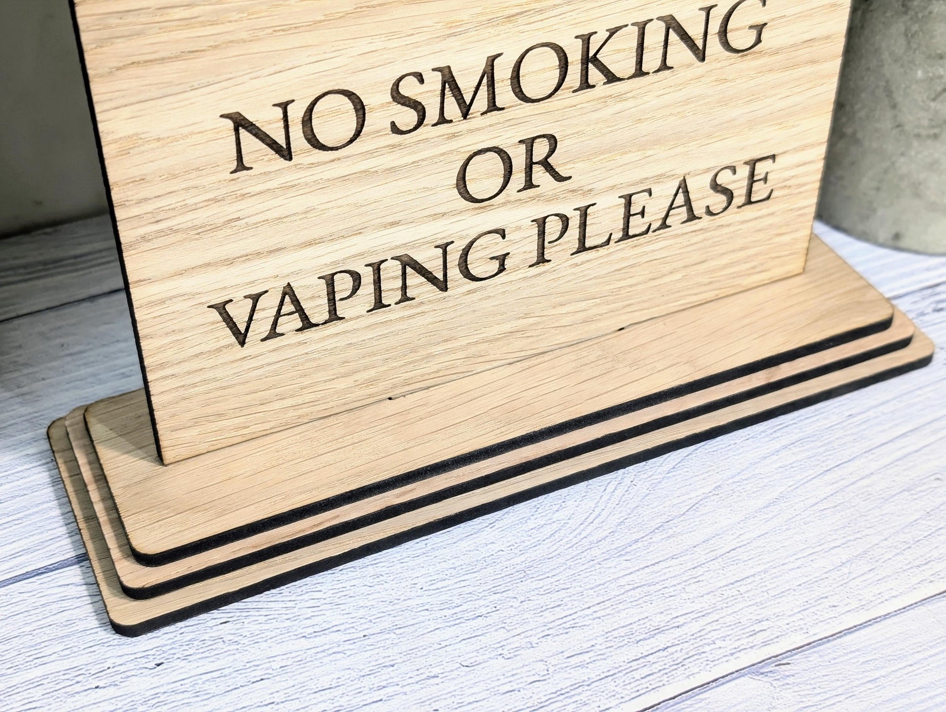 Freestanding "No Smoking or Vaping Please" Wooden Table Sign, Oak Finish, Ideal for Cafes, Restaurants & Public Spaces etc, XL Size, Signage