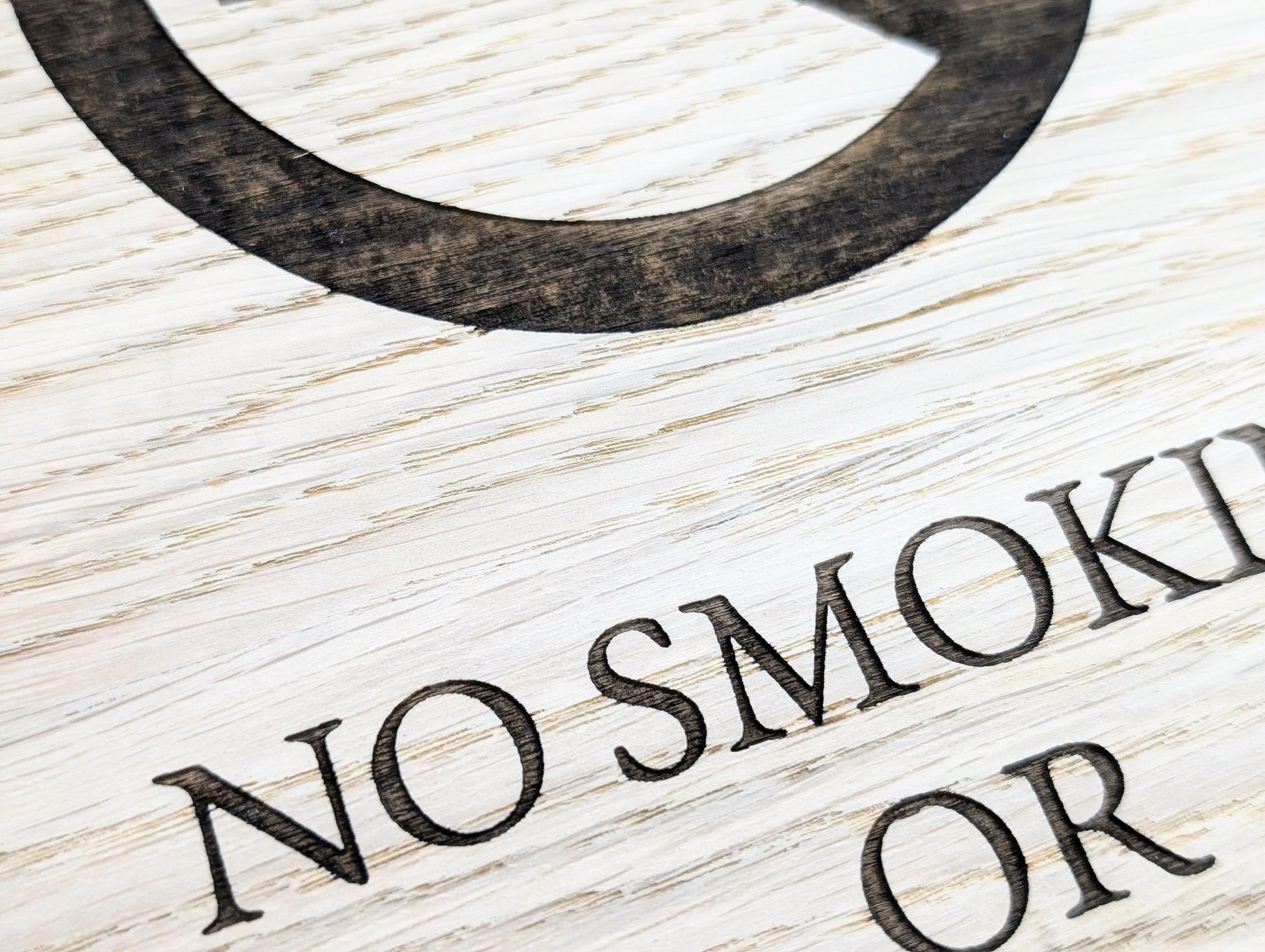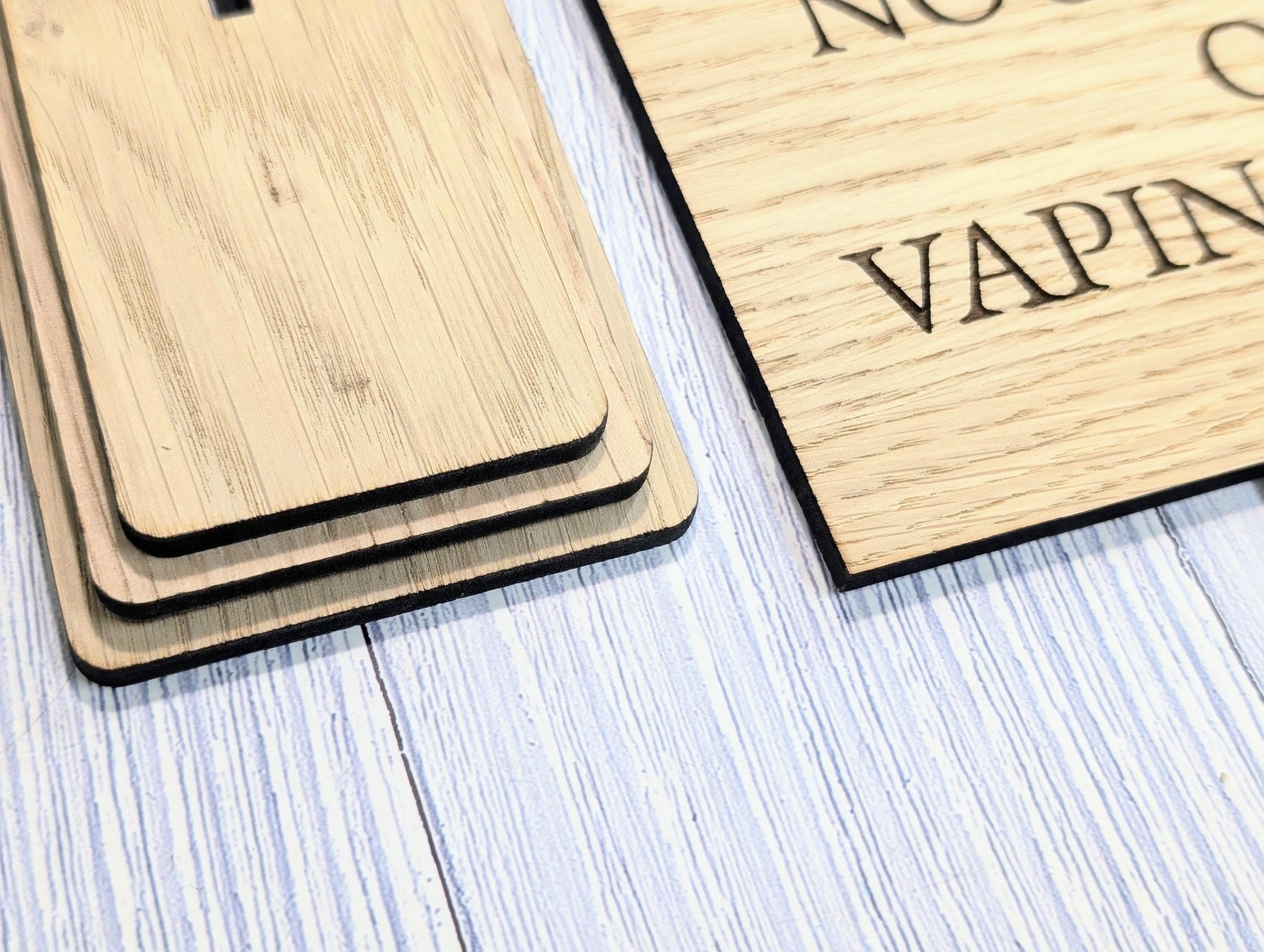 Prominently display your no-smoking policy with our freestanding "No Smoking or Vaping Please" wooden sign. Perfect for cafes, restaurants, and any public space, this sign is designed to communicate clear messages to your patrons. Made from durable oak veneered MDF, it combines functionality with a sleek, modern aesthetic.