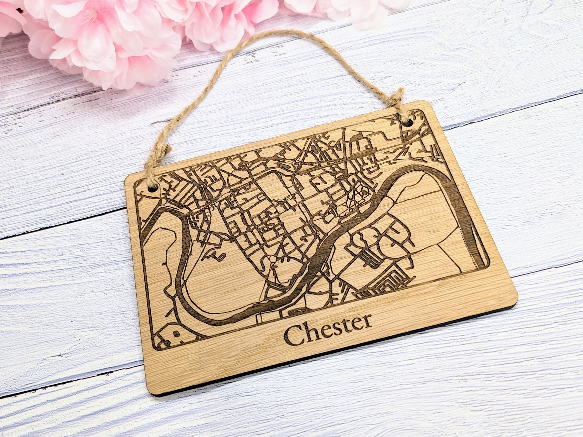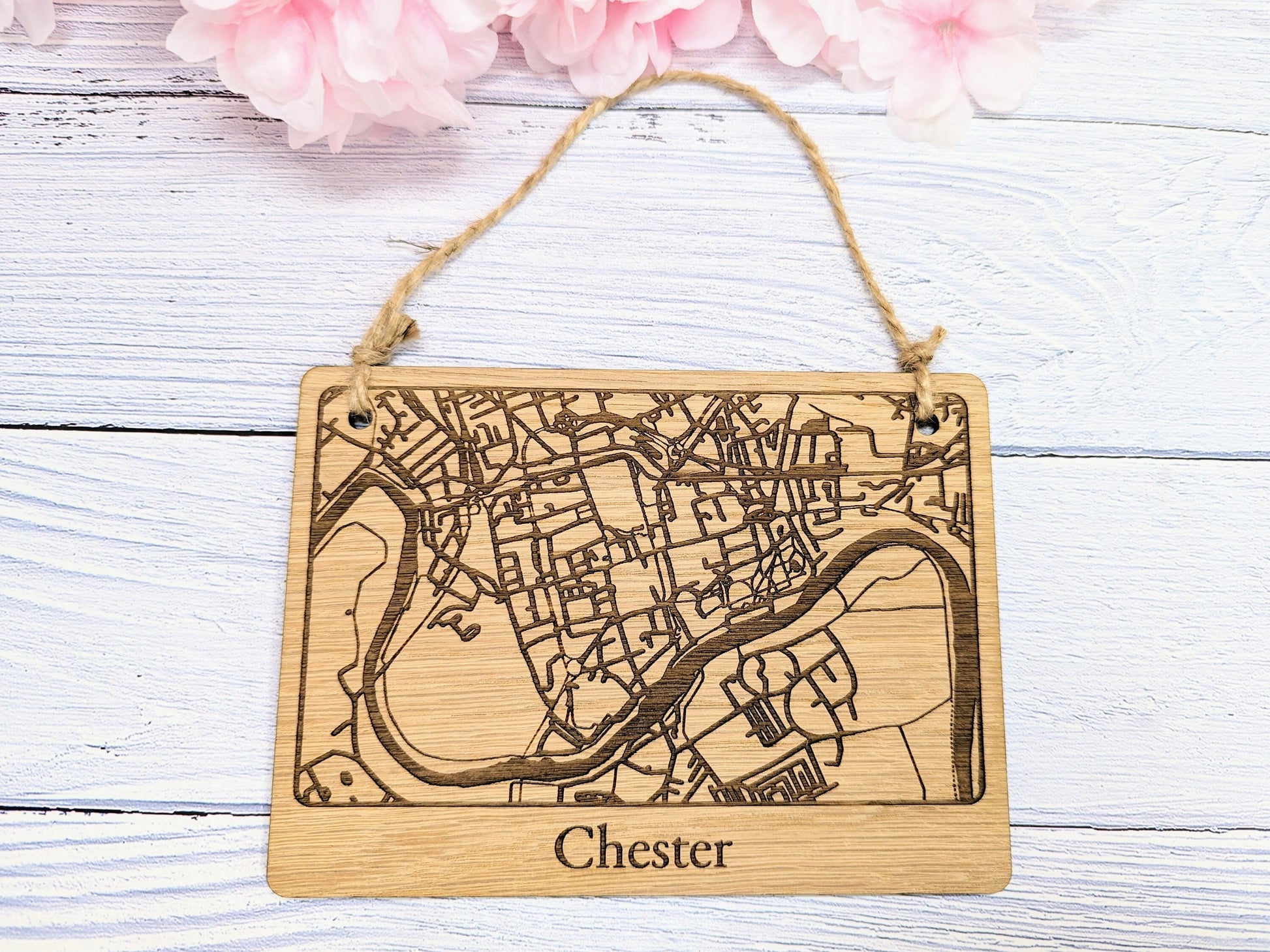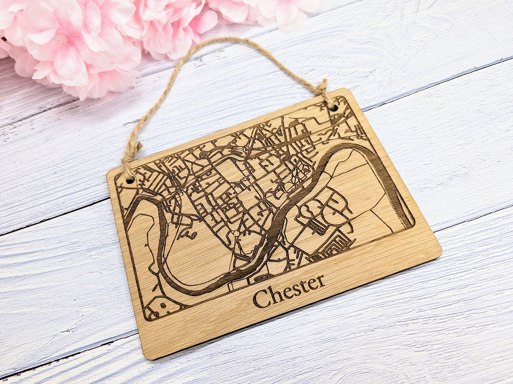 Handcrafted Wooden Map Wall Art of Chester, UK - Unique Home Decor or Thoughtful Gift - 4 Sizes Available - Customisable