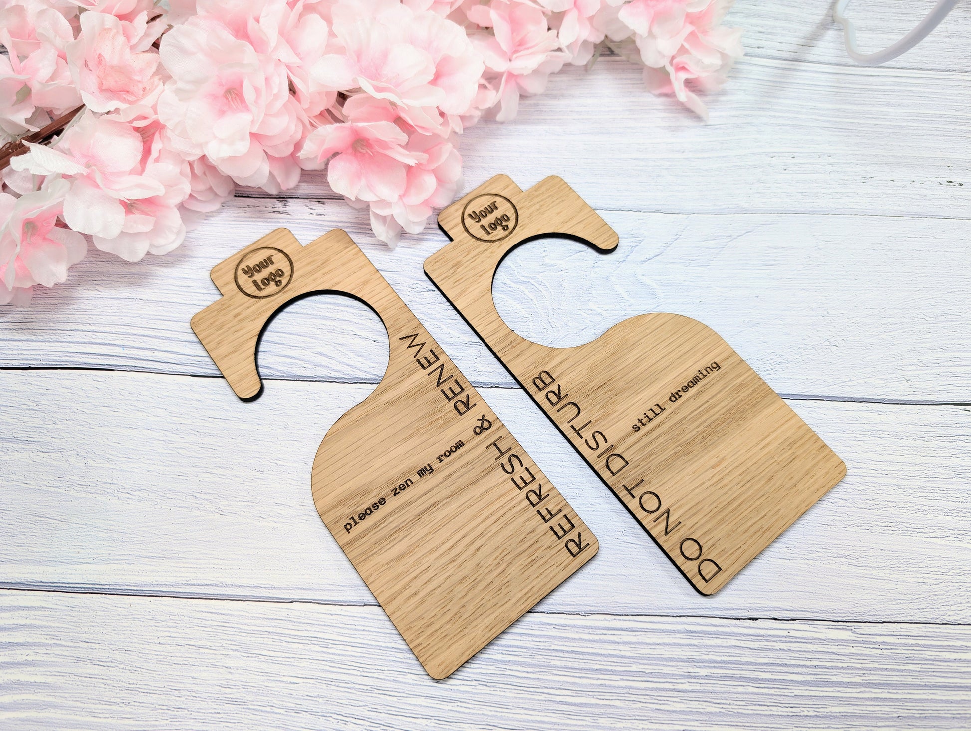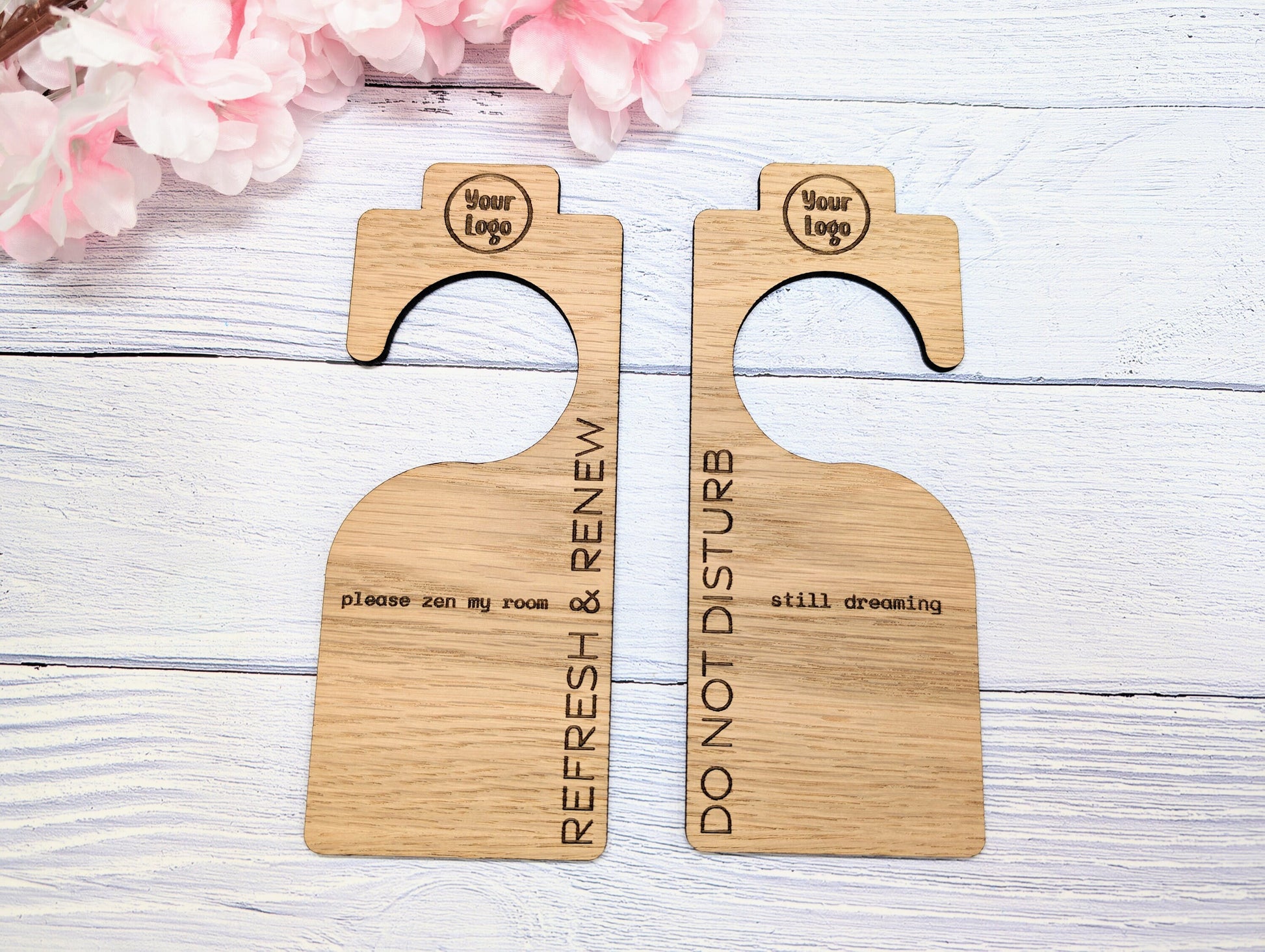 Hotel Door Hanger for Larger Handles | "Do Not Disturb" & "Please Clean My Room" | Oak Veneer | Double-Sided | Customisable Logo