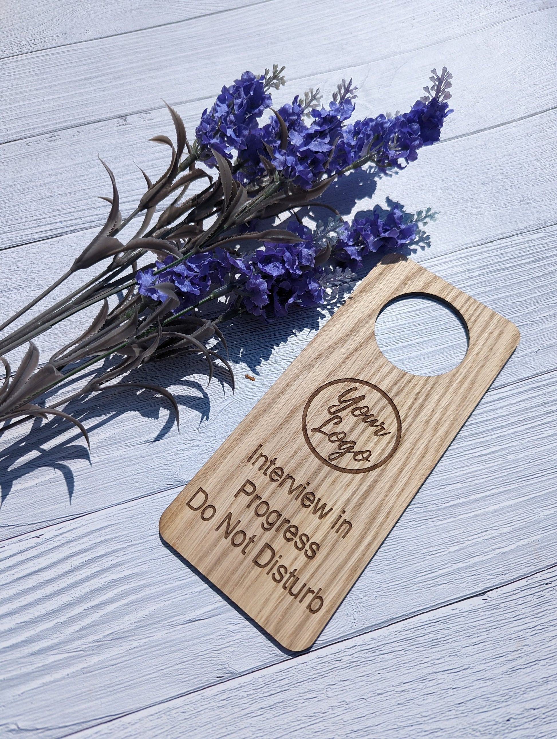 Create a professional and distraction-free environment during interviews with our Personalised Interview in Progress Door Hanger. Crafted from high-quality oak veneered MDF, this door hanger serves as a clear signal to others that an interview is taking place and disruptions should be avoided.