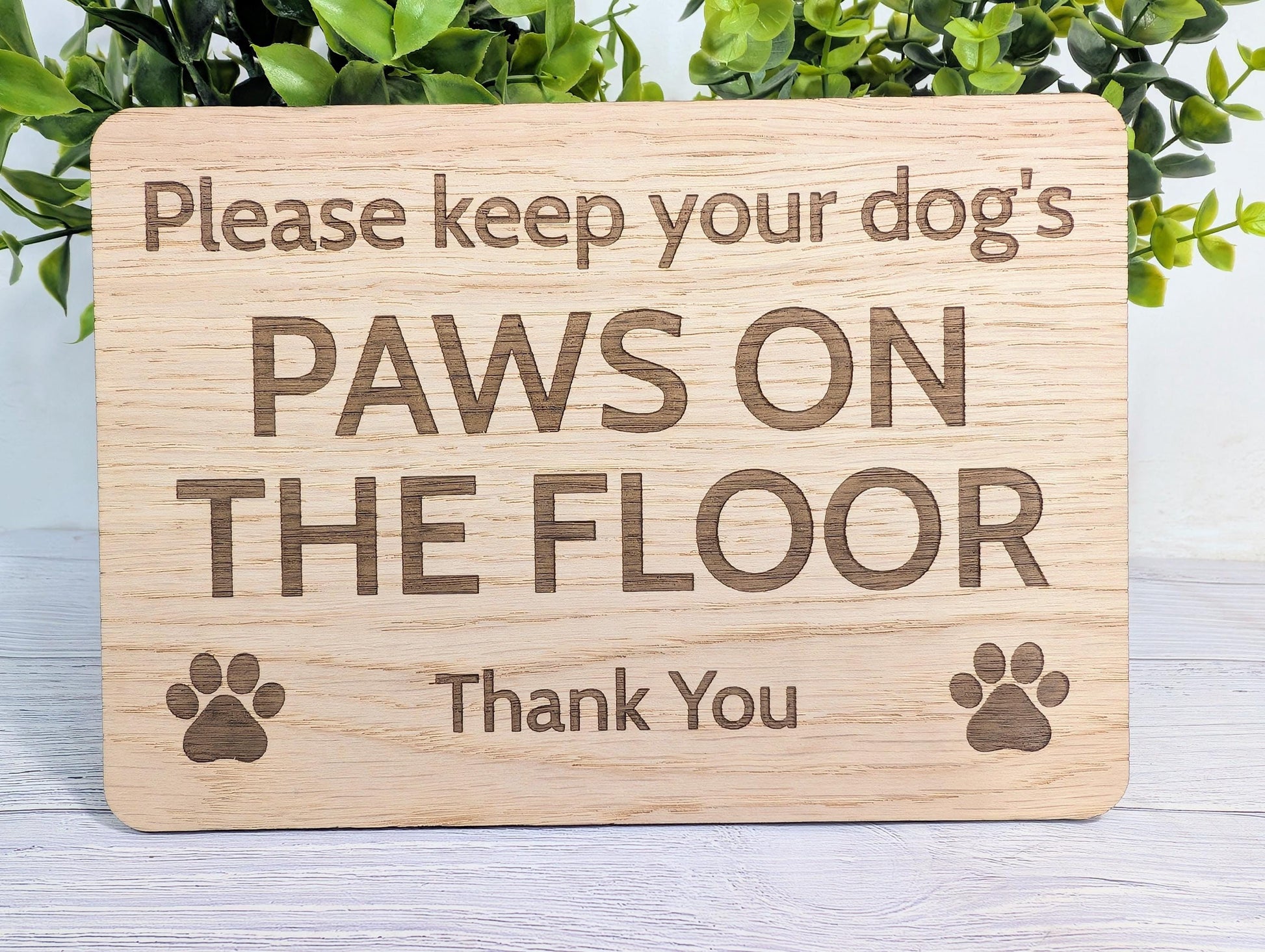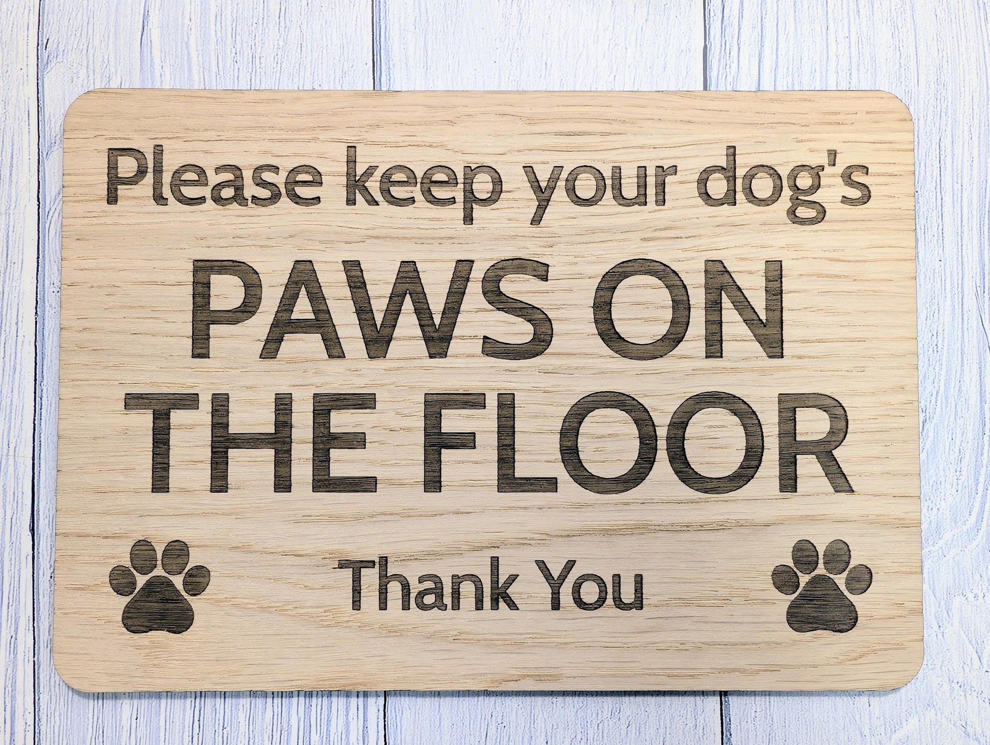 Keep Dog's Paws on Floor Sign – Oak Veneer Dog-Friendly Plaque – Please Keep Dog’s Paws on Floor – Optional Stand