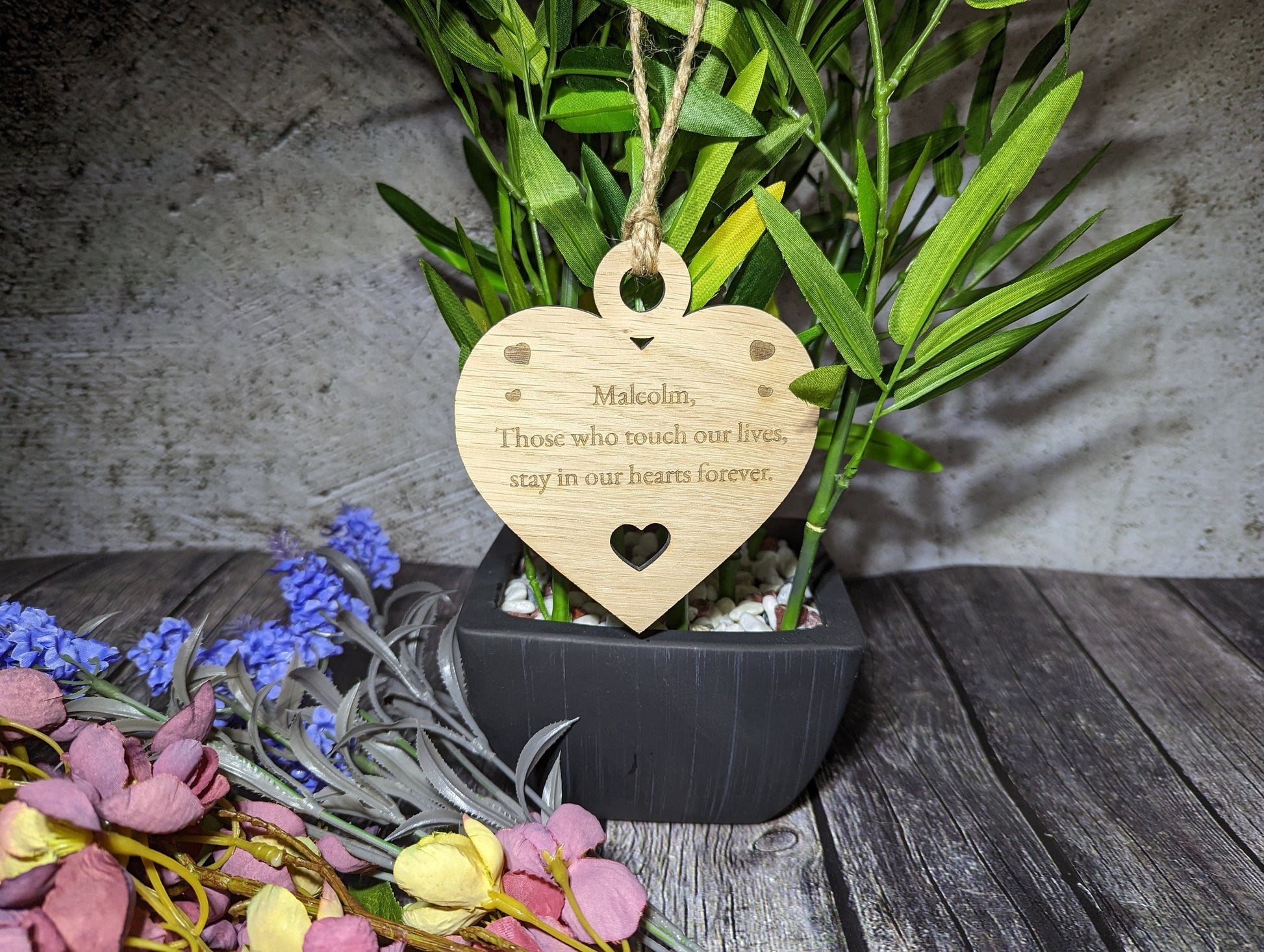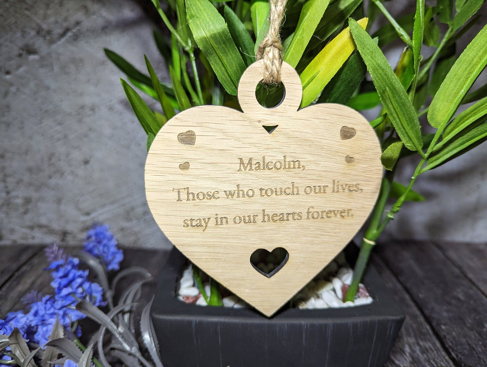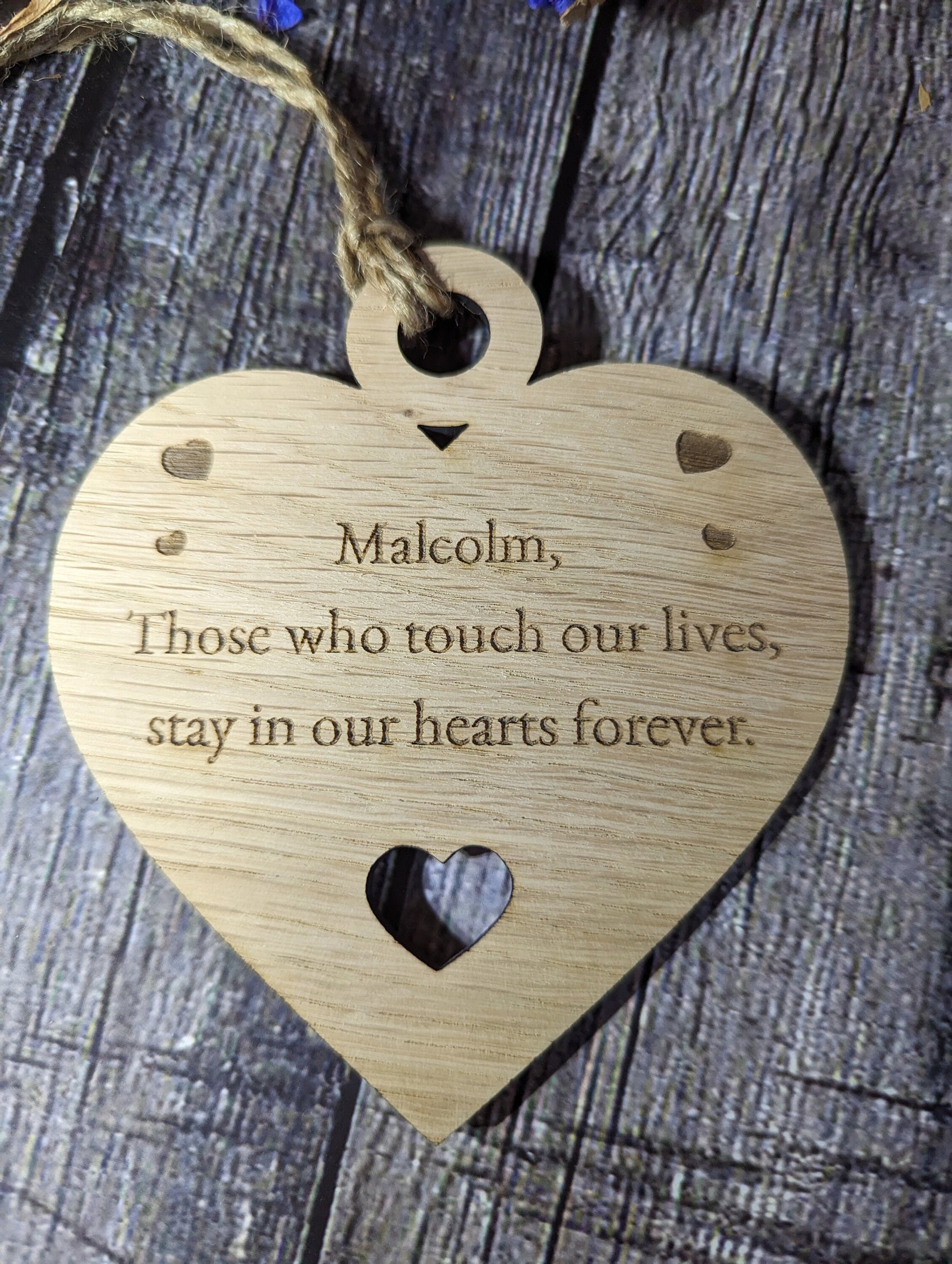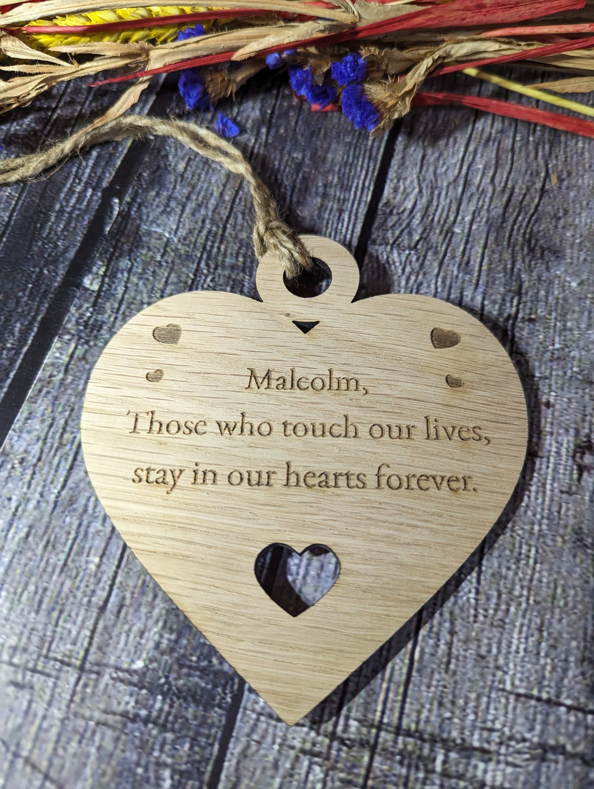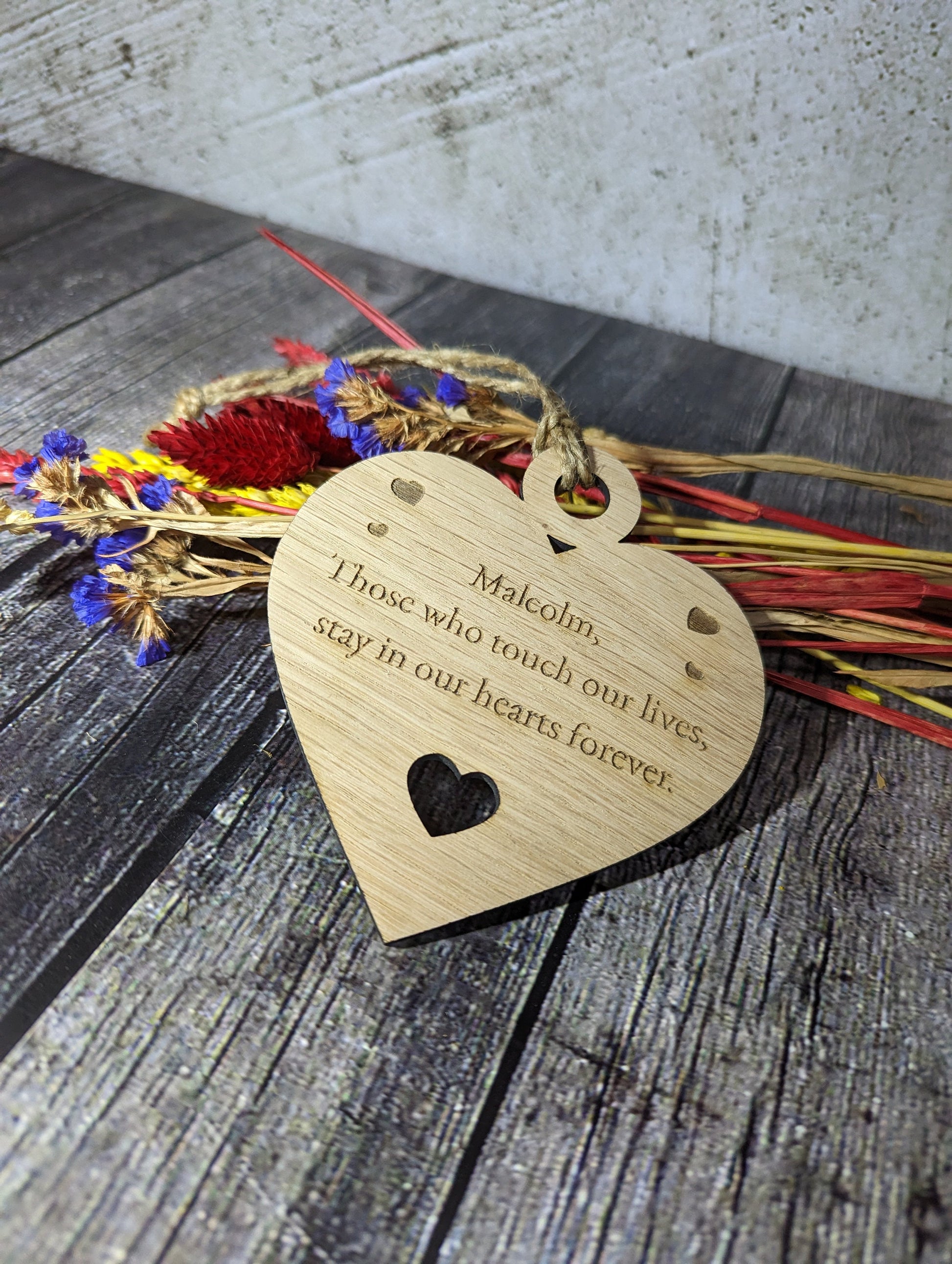 Keepsake Heart Shaped Bauble, Memorial Plaque, In Memory, made in Oak.