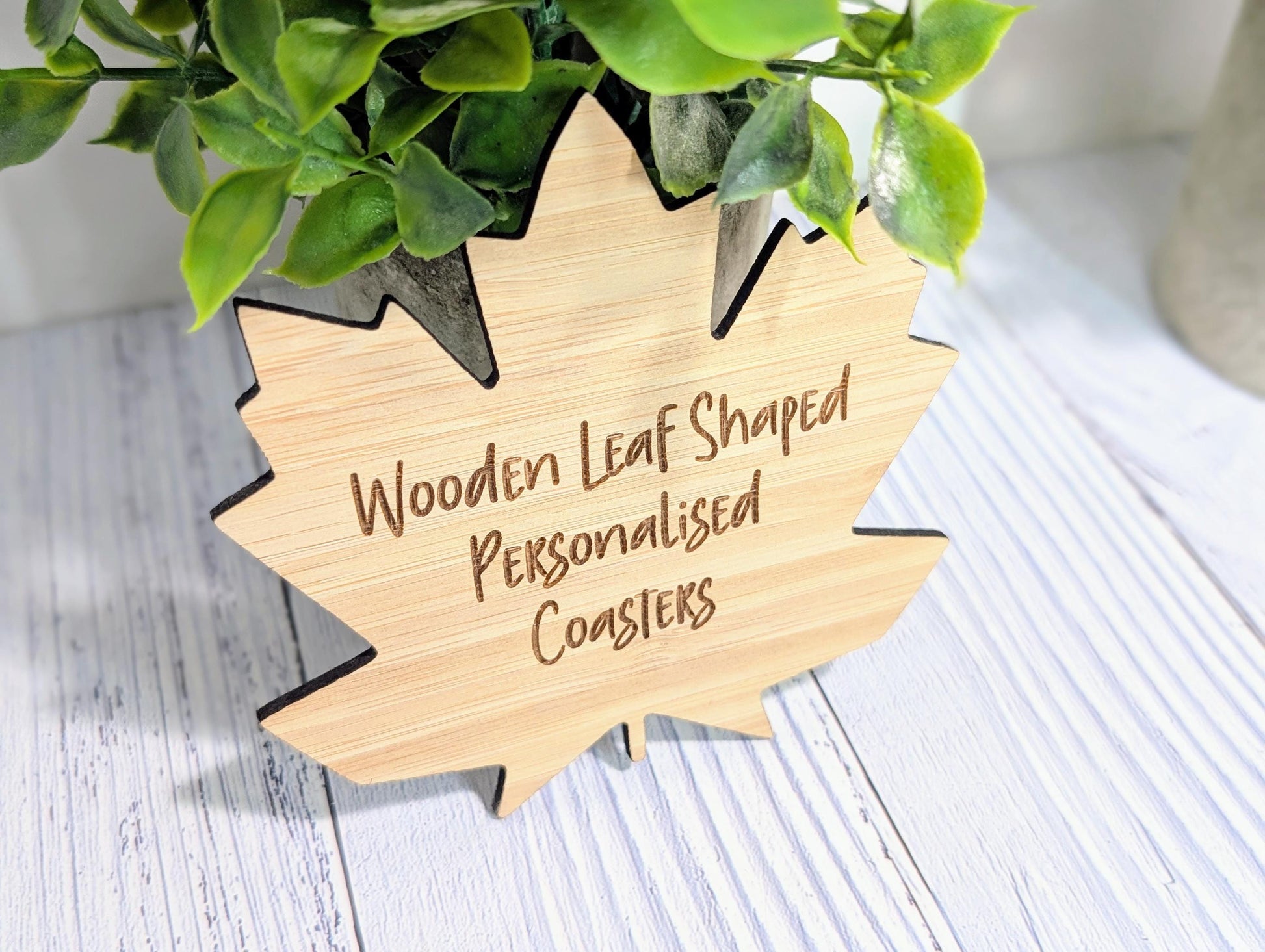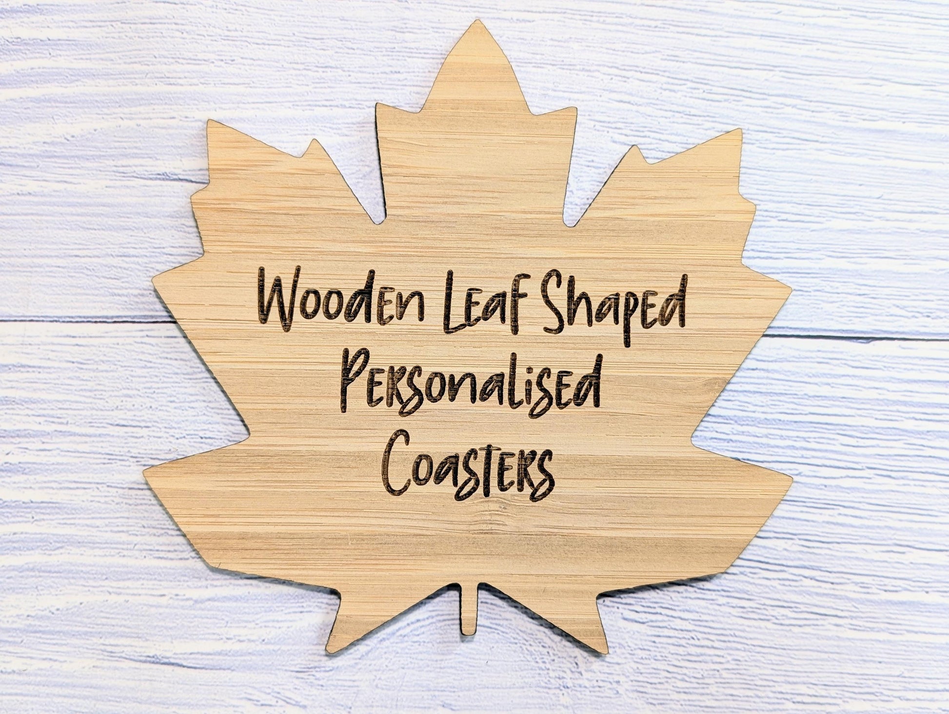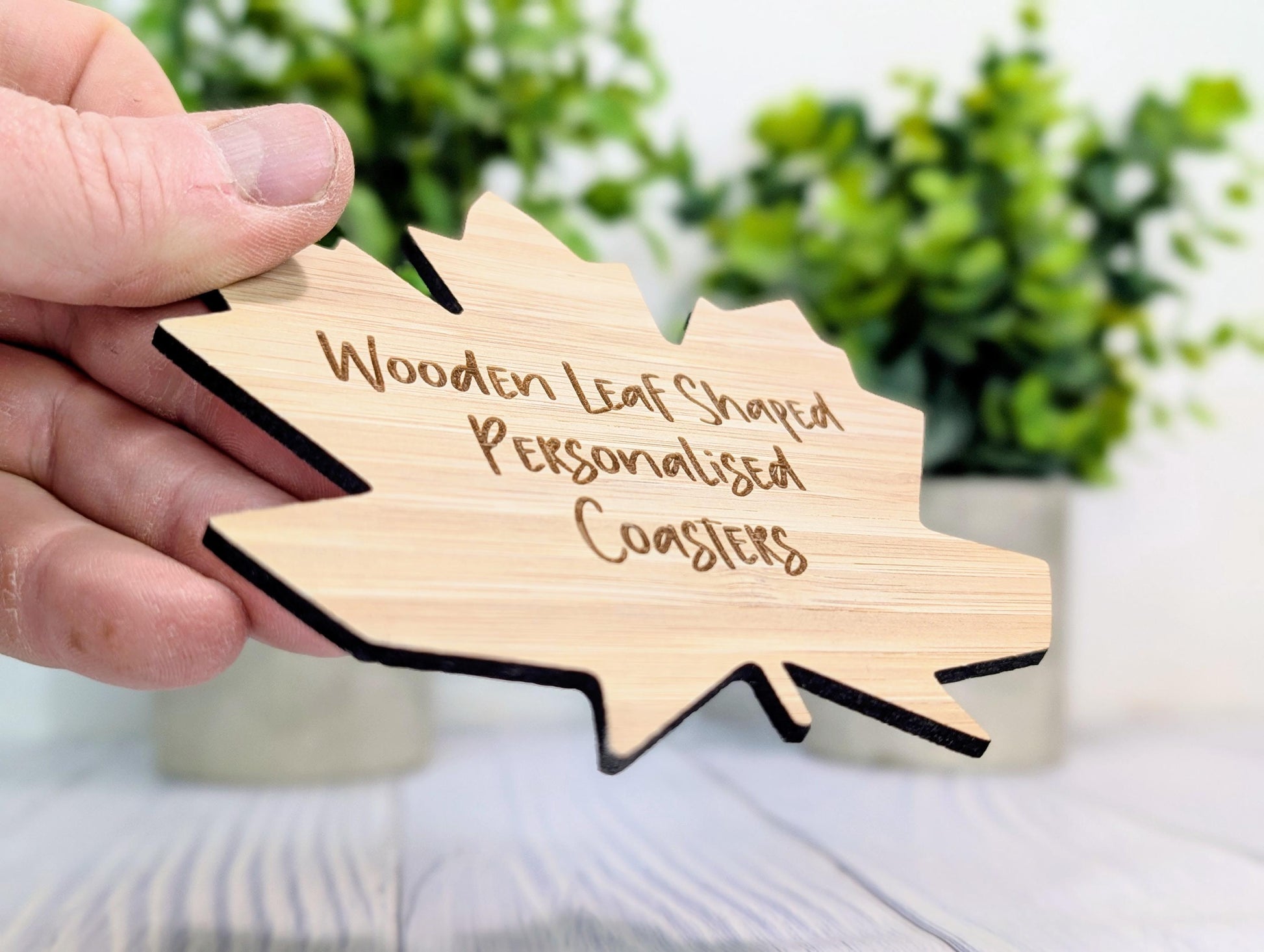 Leaf Shaped Bamboo Coasters - Personalised Text – Eco-Friendly Gift, Custom Message – Bespoke Sustainable Craft, 115mm Diameter
