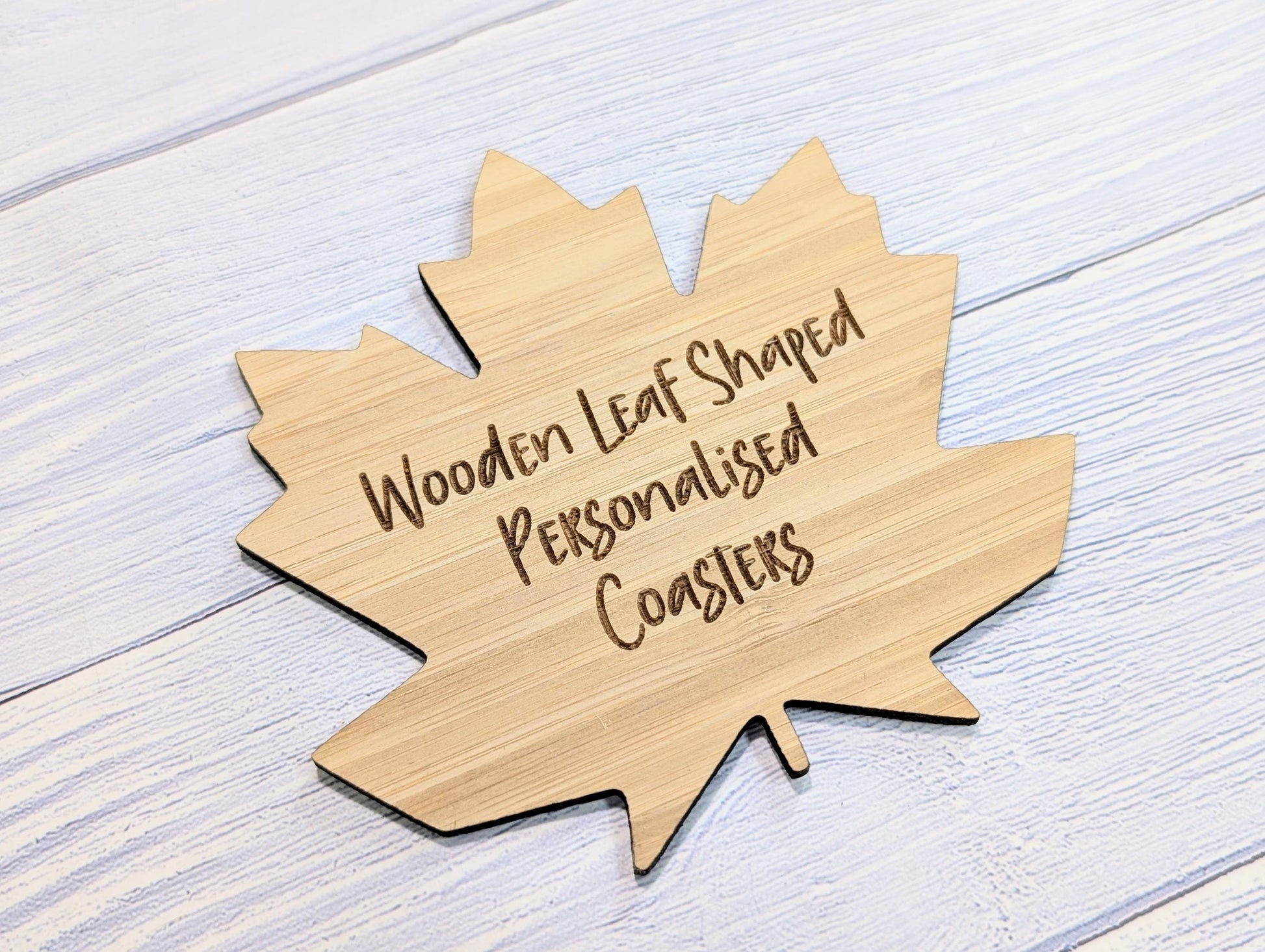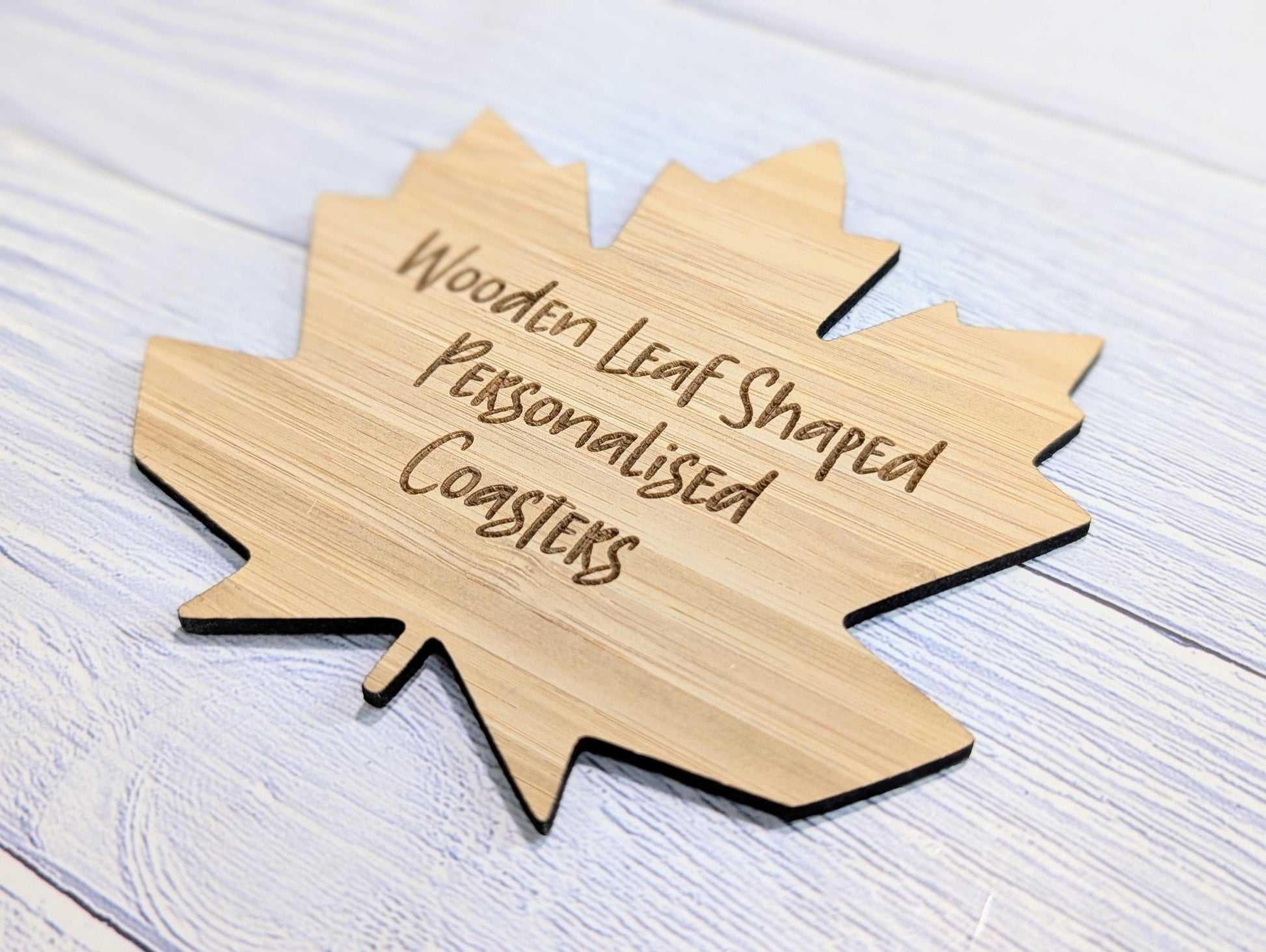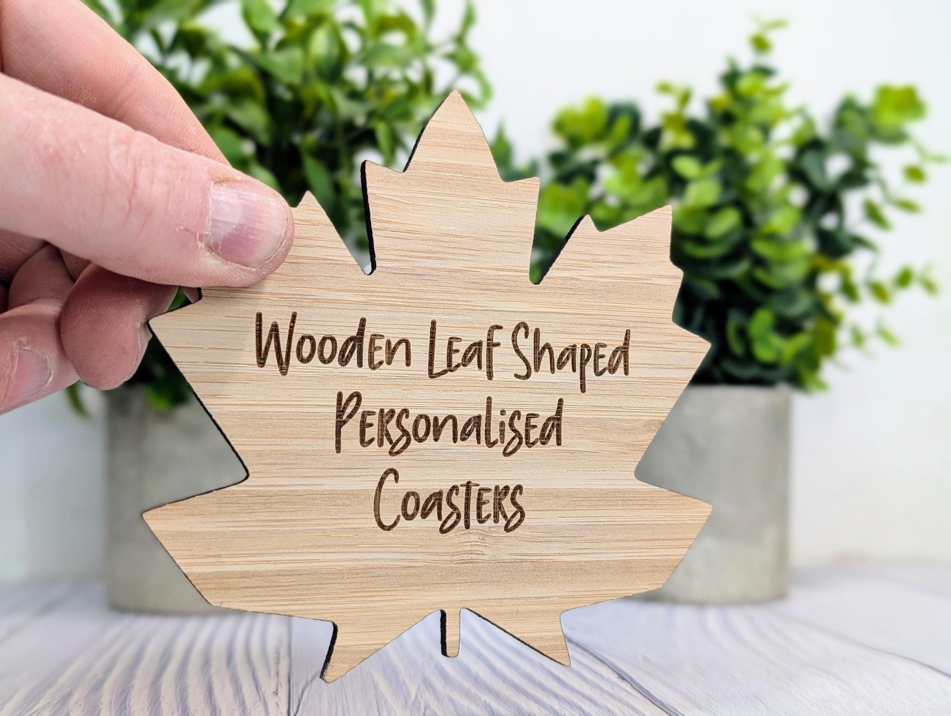 Leaf Shaped Bamboo Coasters - Personalised Text – Eco-Friendly Gift, Custom Message – Bespoke Sustainable Craft, 115mm Diameter
