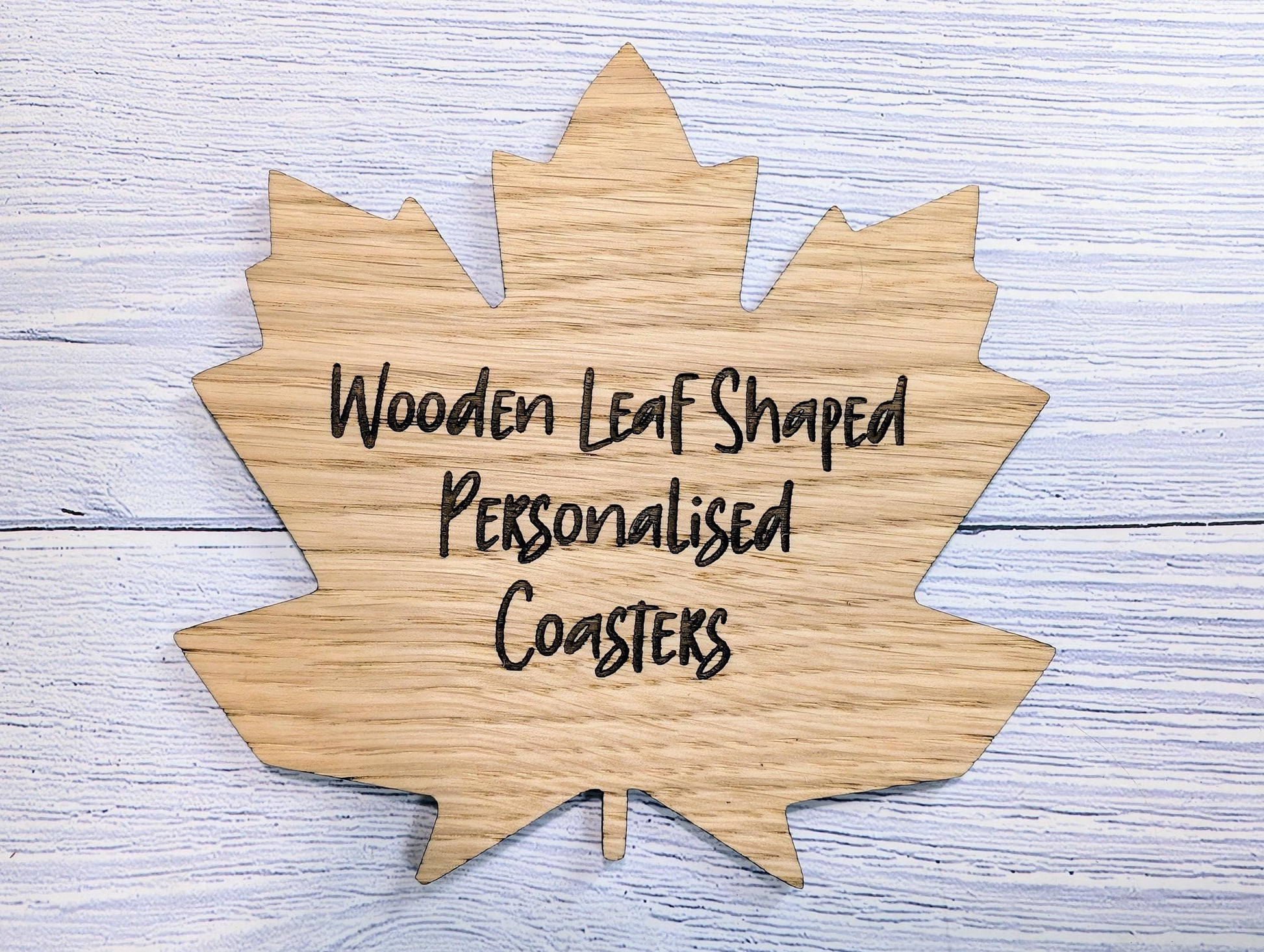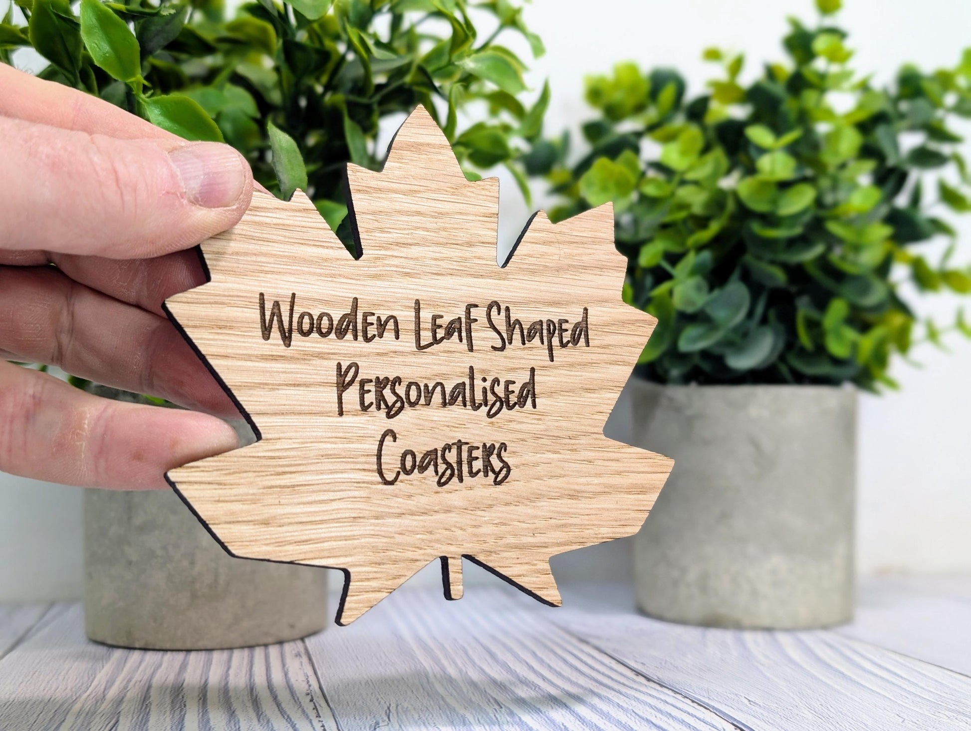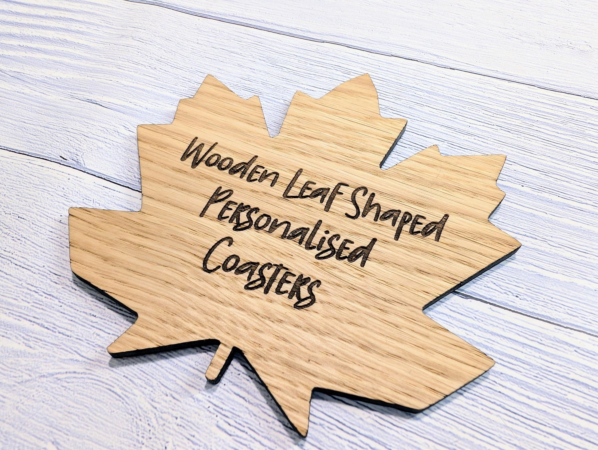 Leaf Shaped Wooden Coasters - Personalised Text – Eco-Friendly Gift, Custom Message – Bespoke Sustainable Craft, 115mm Diameter, Oak Wood