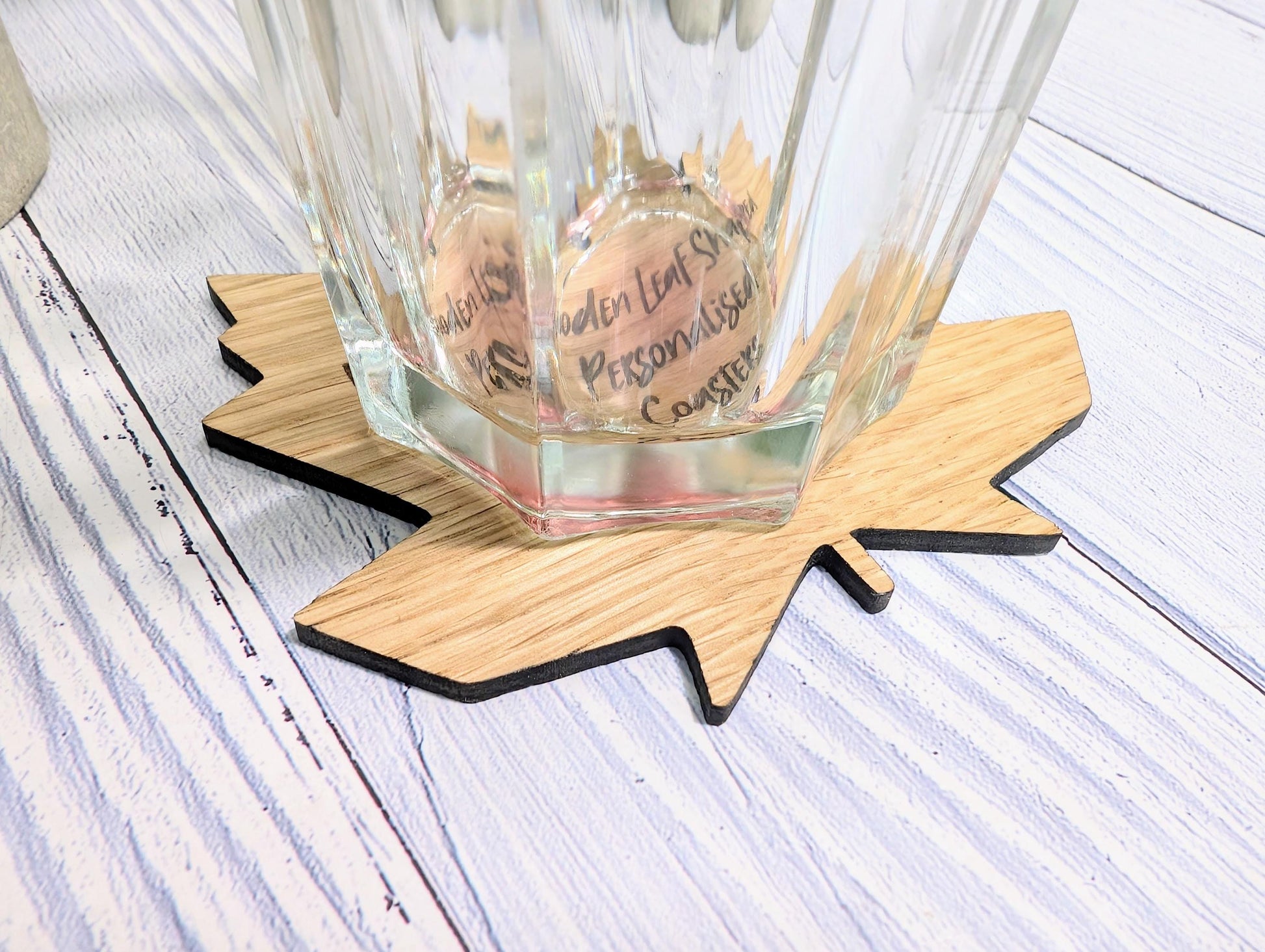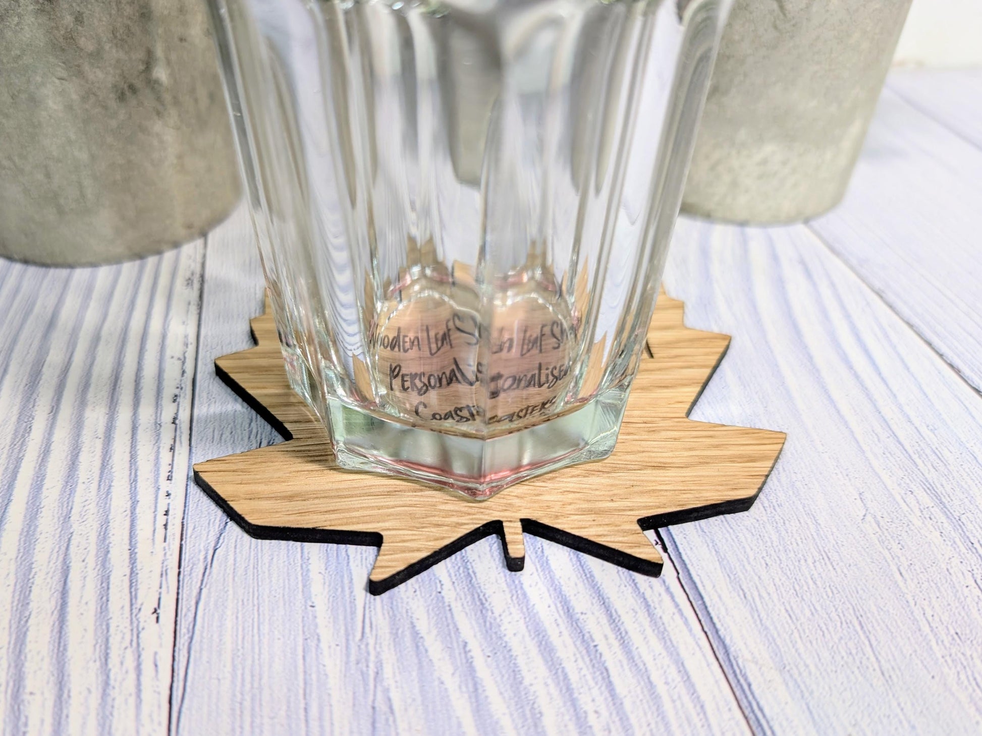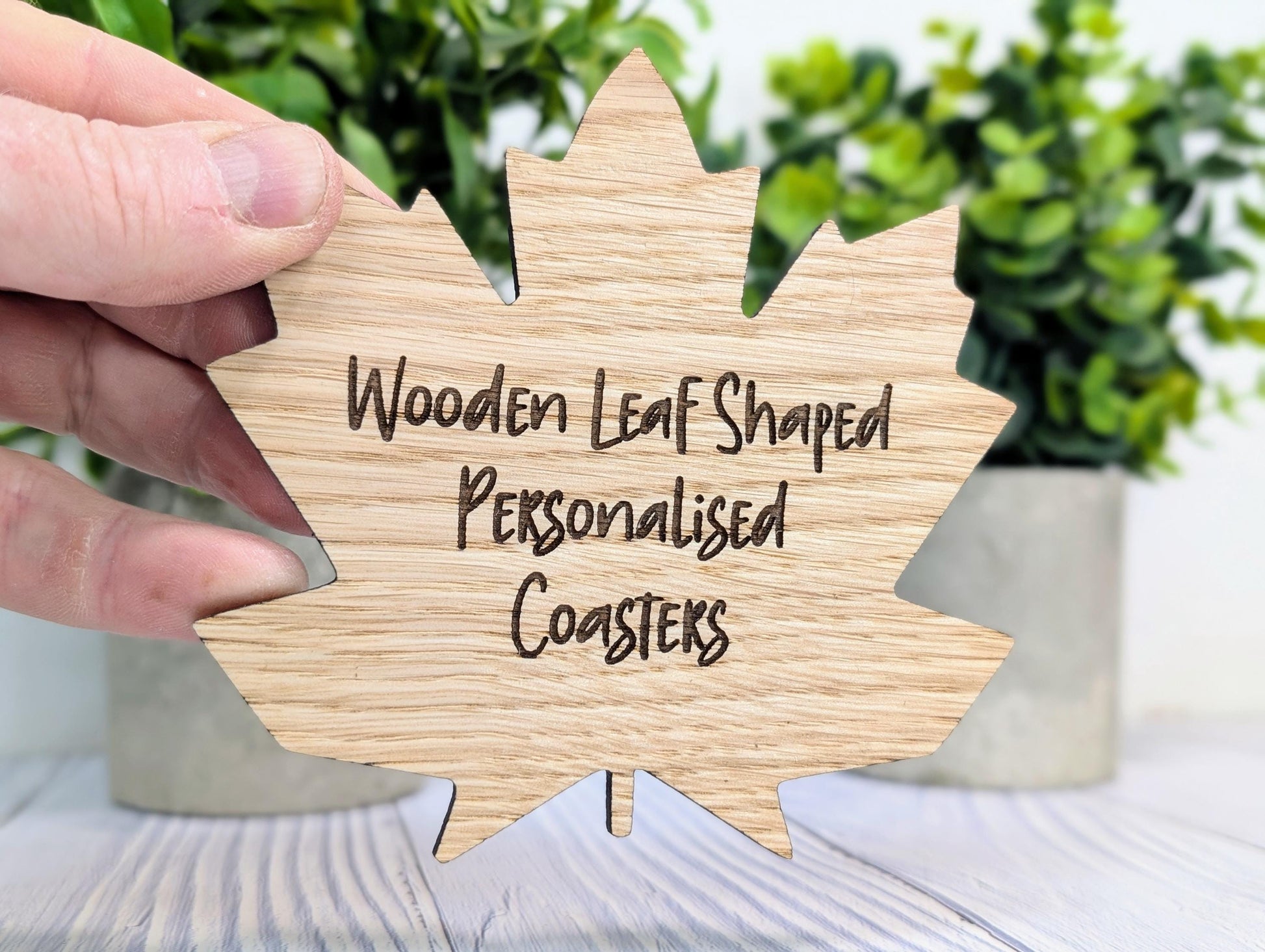 Leaf Shaped Wooden Coasters - Personalised Text – Eco-Friendly Gift, Custom Message – Bespoke Sustainable Craft, 115mm Diameter, Oak Wood