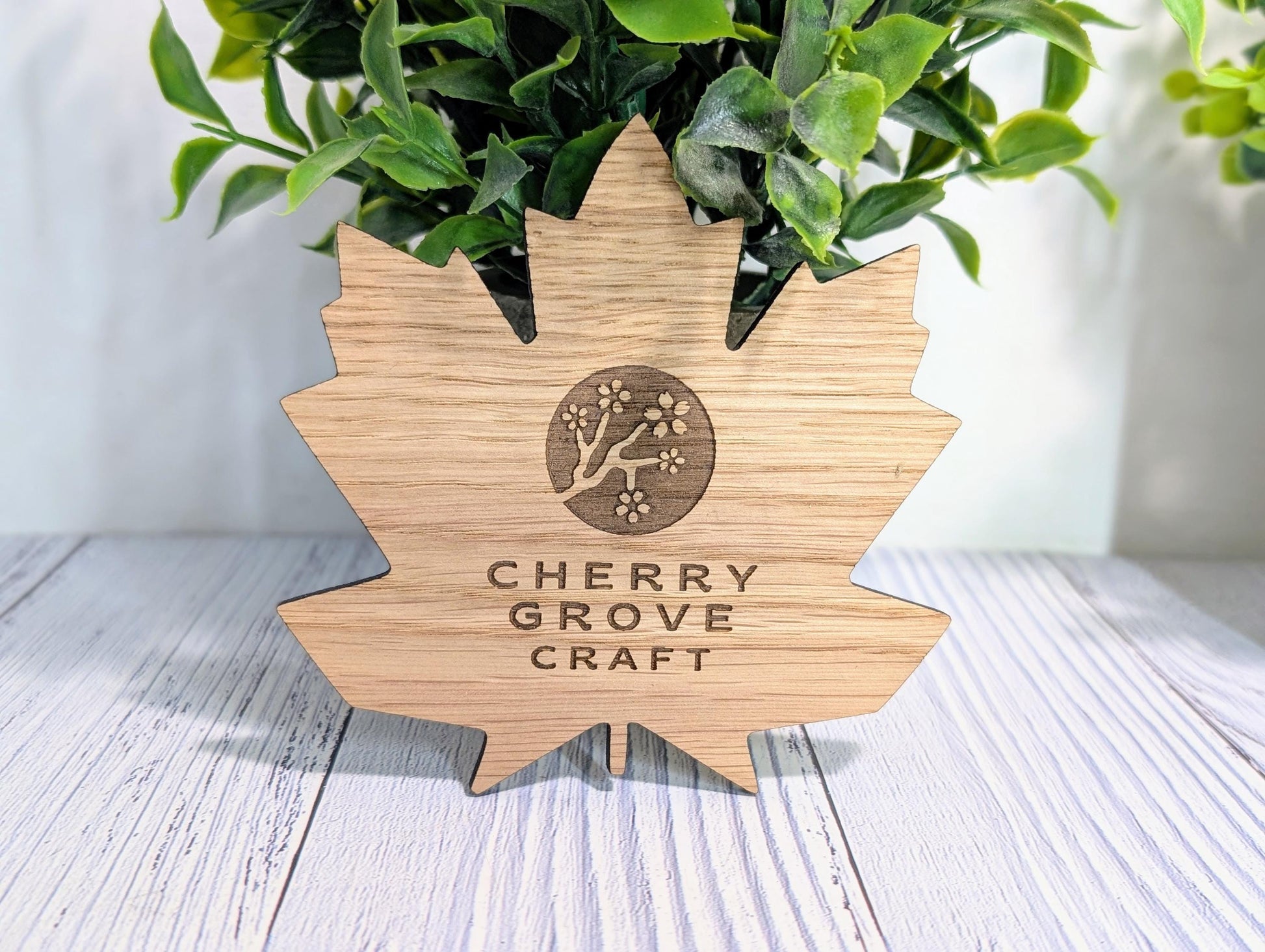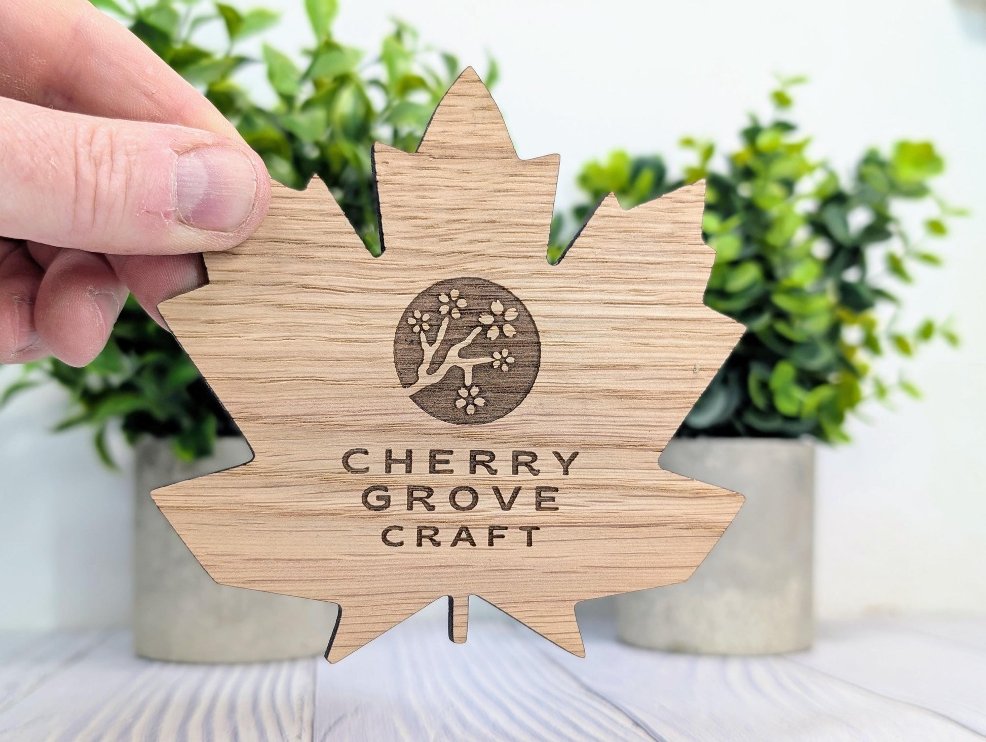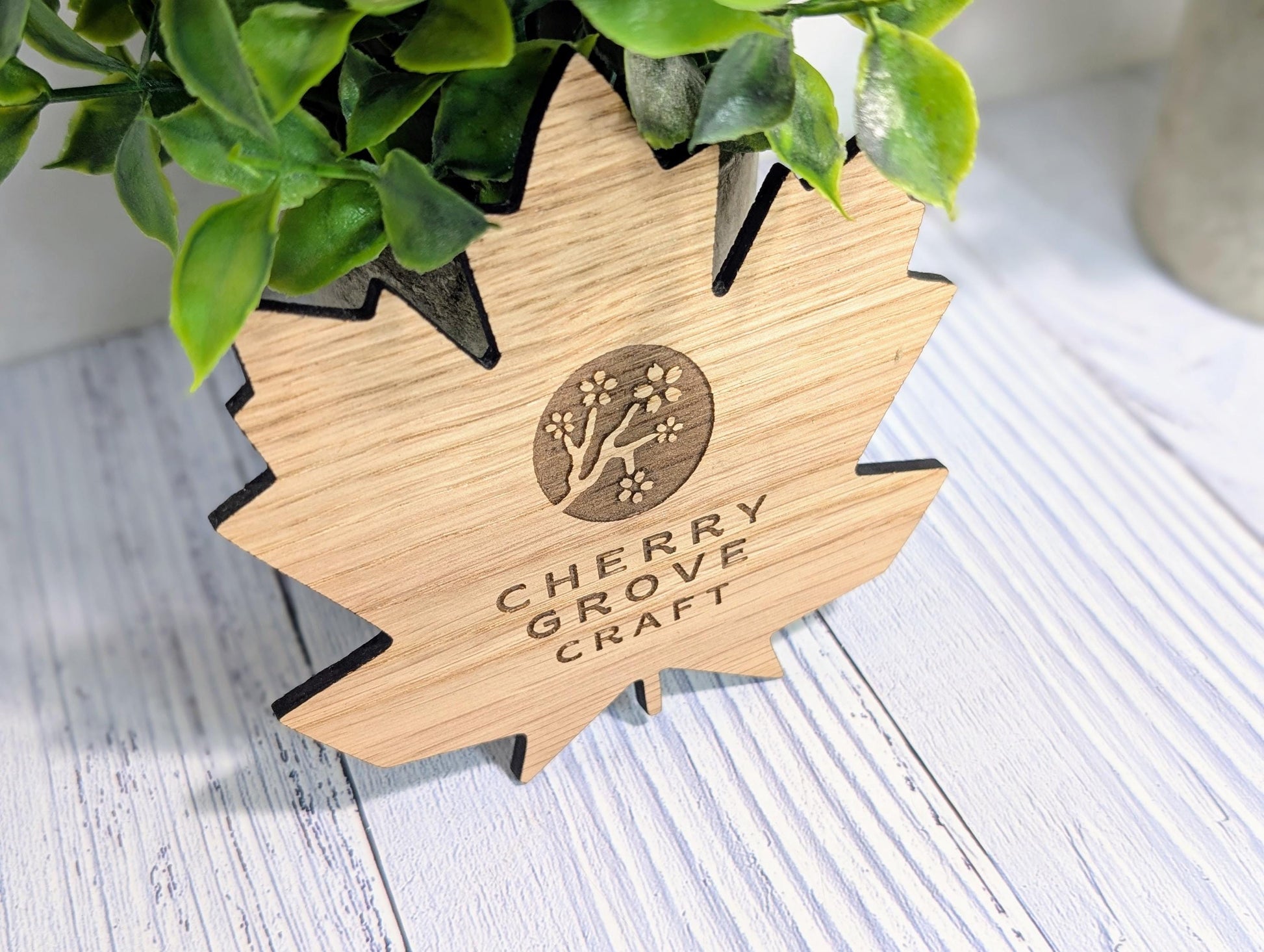 Leaf Shaped Wooden Logo Coasters - Personalised – Eco-Friendly Gift, Custom Branded – Bespoke Sustainable Craft, 115mm Diameter, Oak Wood