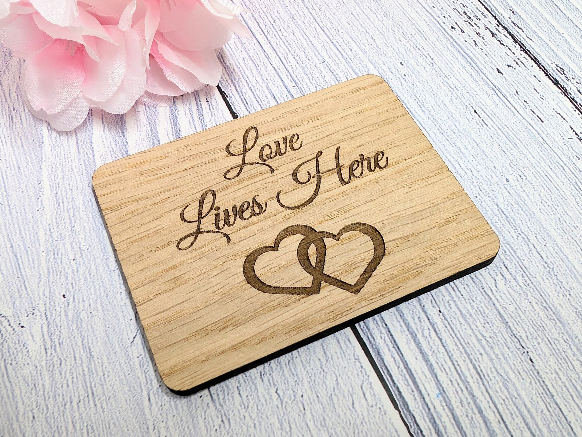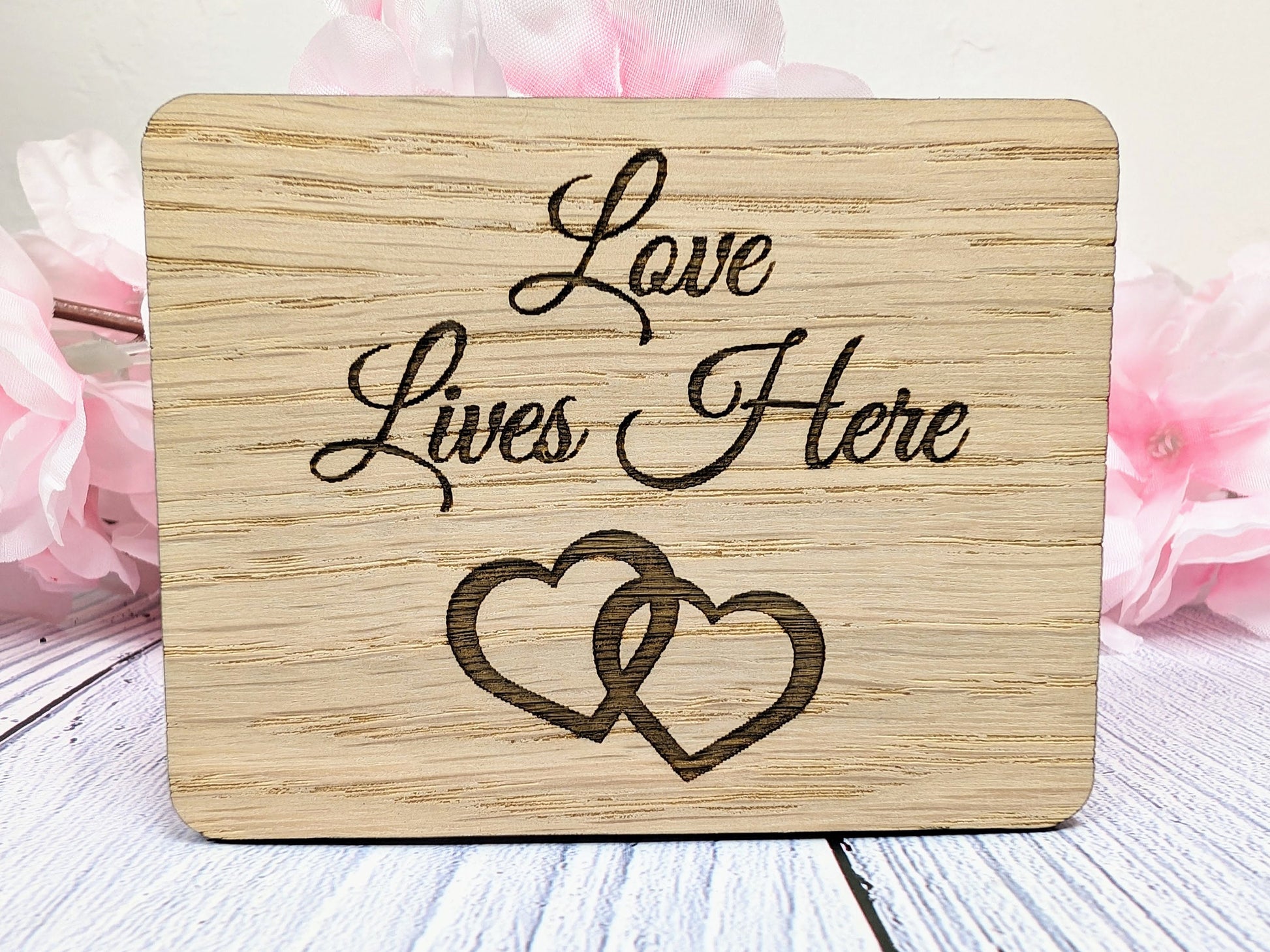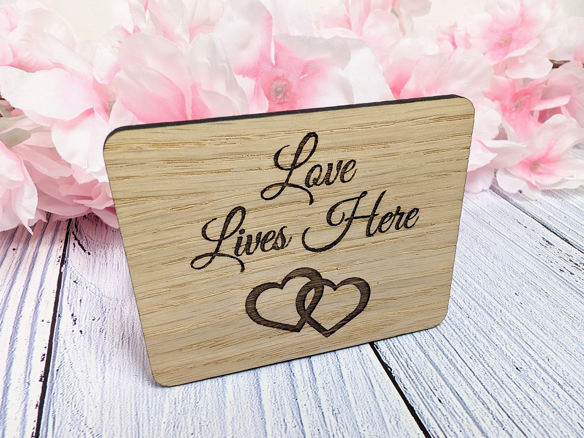 Love Lives Here - Wooden Fridge Magnet with Interlocking Hearts - Romantic Gift