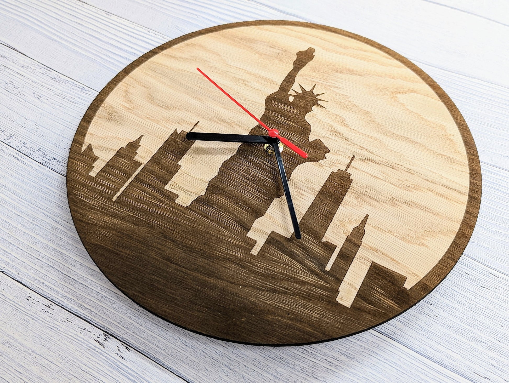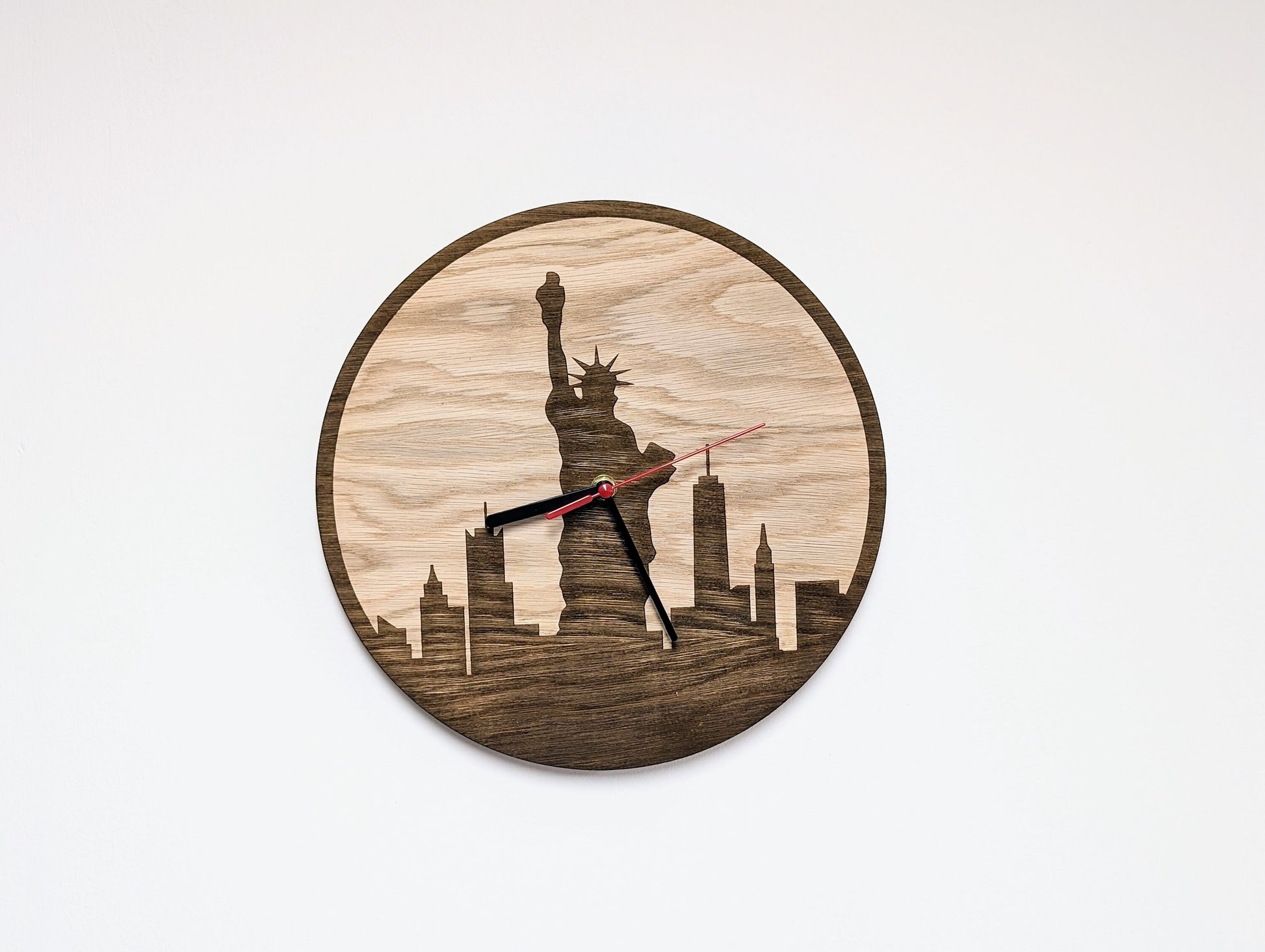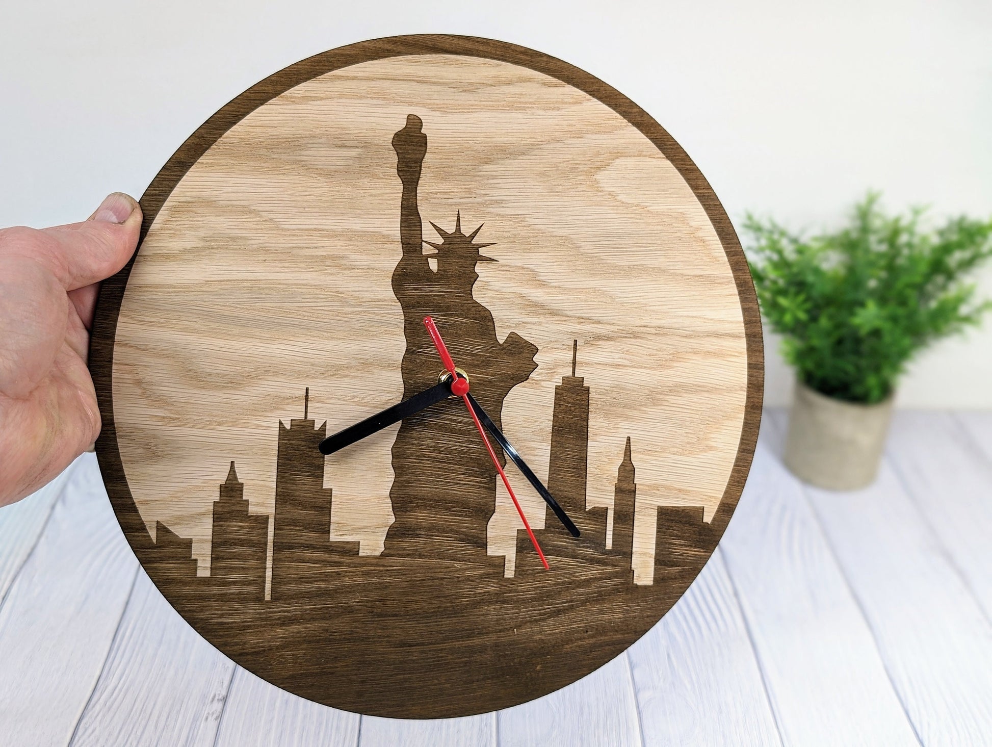 New York Skyline Wooden Clock - Urban Chic Wall Decor, Stylish Cityscape Timepiece, Oak Veneer, Engraved Skyline, NYC Wall Art