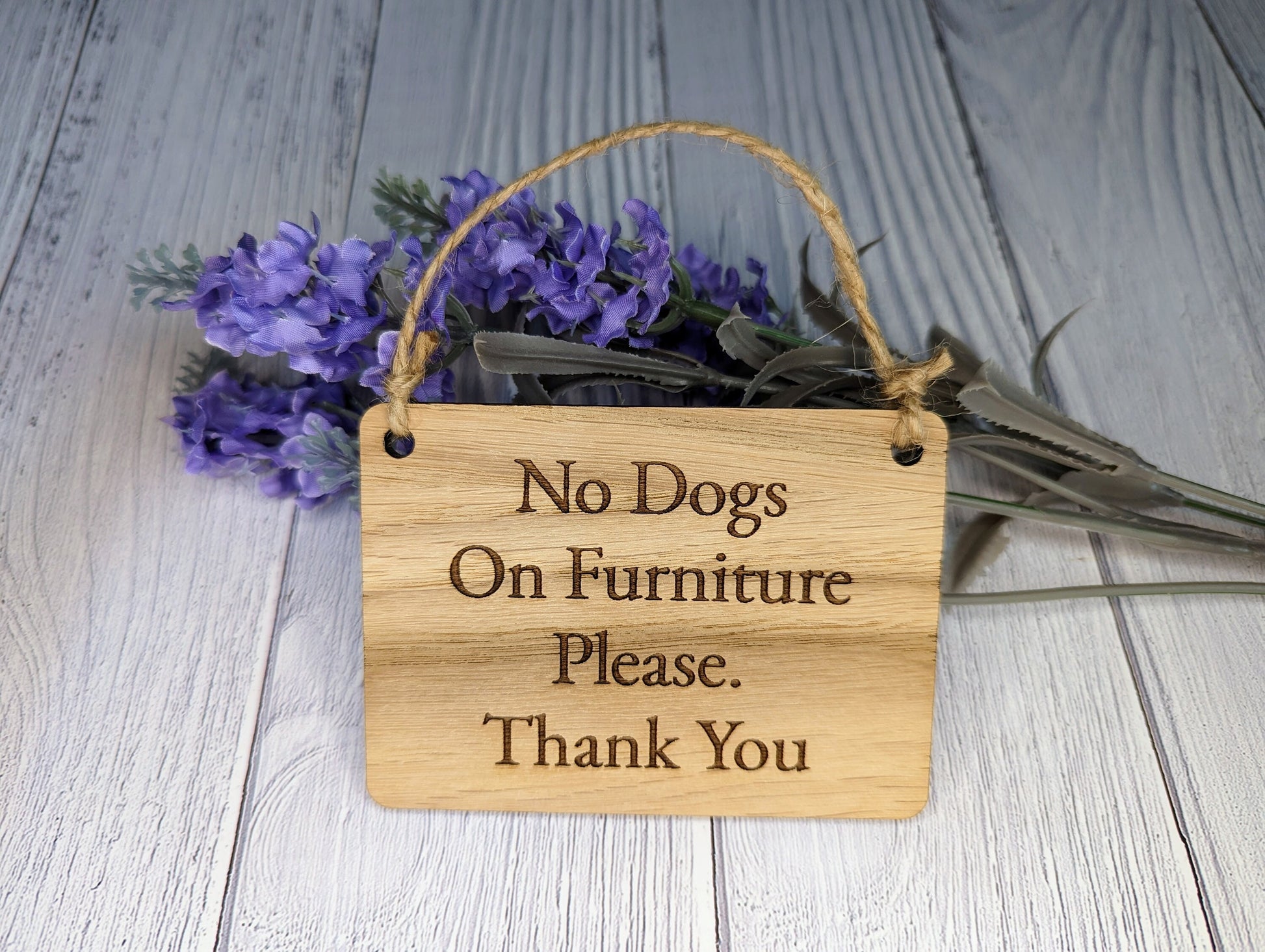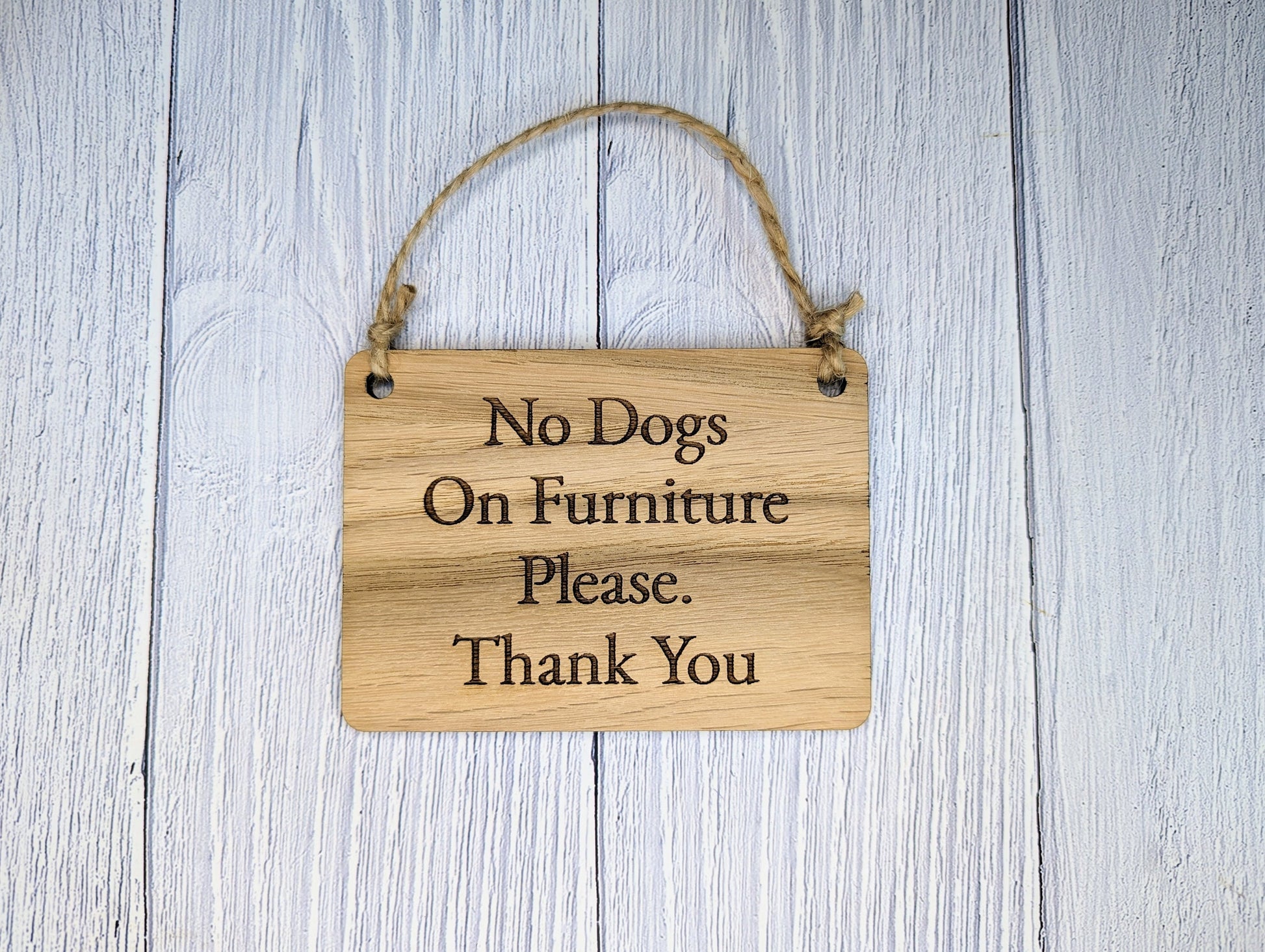 Ensure a pet-friendly environment in your home or Airbnb with our charming wooden sign. Crafted from 4mm thick Oak Veneered MDF, this sign features the text "No Dogs On Furniture Please, Thank You" in a stylish and legible design. Available in four sizes, you can choose the perfect fit for your space. Additionally, personalise the sign with your own text to add a custom touch. Ideal for homeowners or Airbnb hosts looking to maintain specific areas within their property. This wooden sign combines functionality with a touch of elegance, making it a delightful addition to any space.