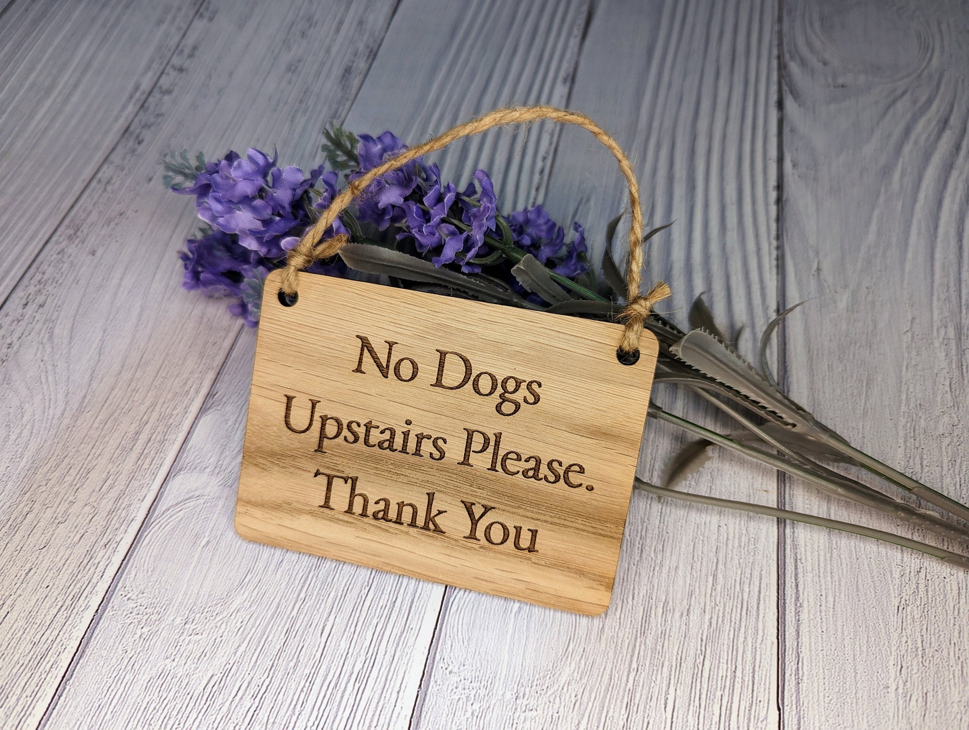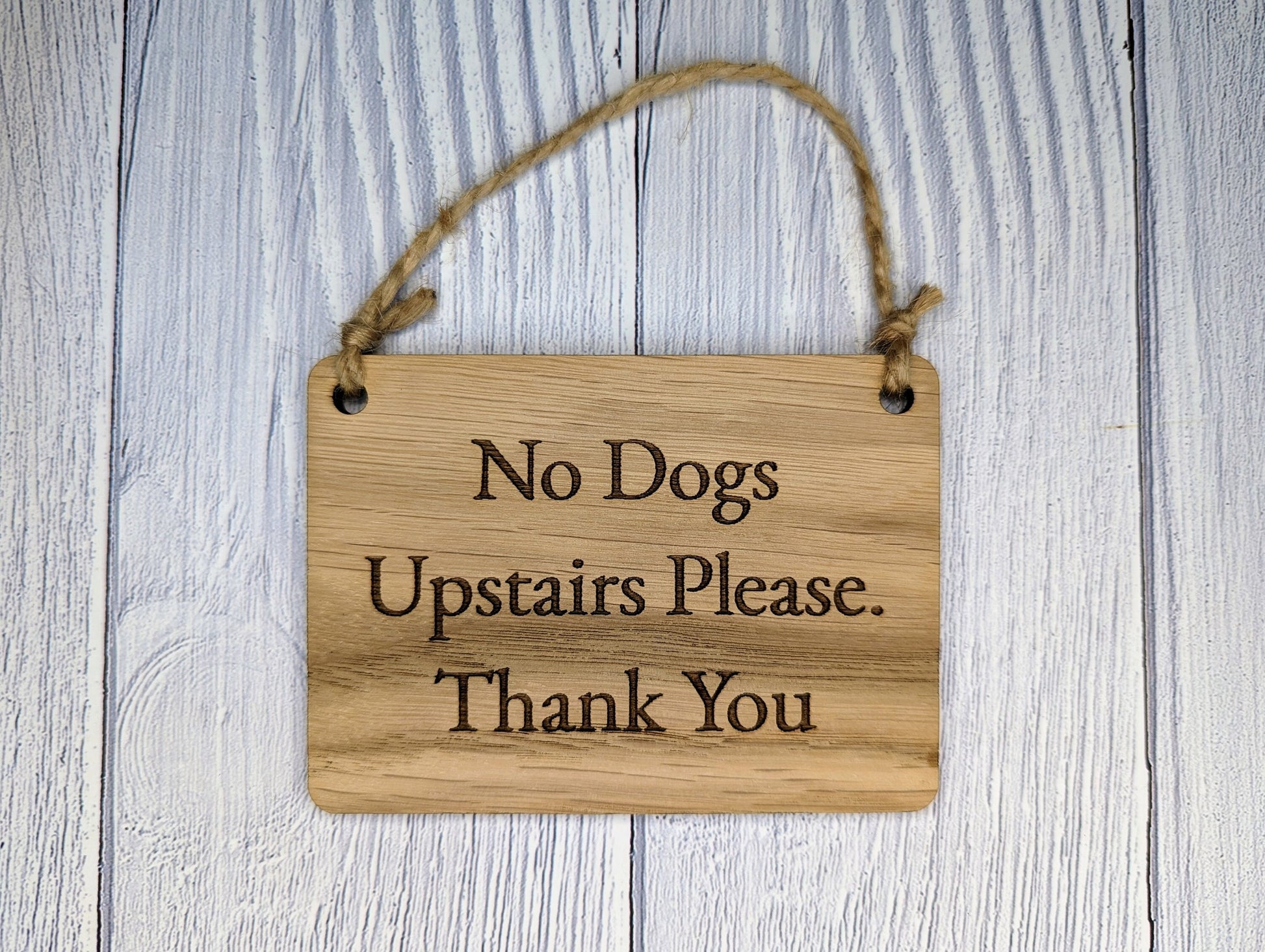 No Dogs Upstairs Please - Wooden Sign | Can Be Personalised | Oak Veneered MDF | Ideal for Home, Airbnb etc.