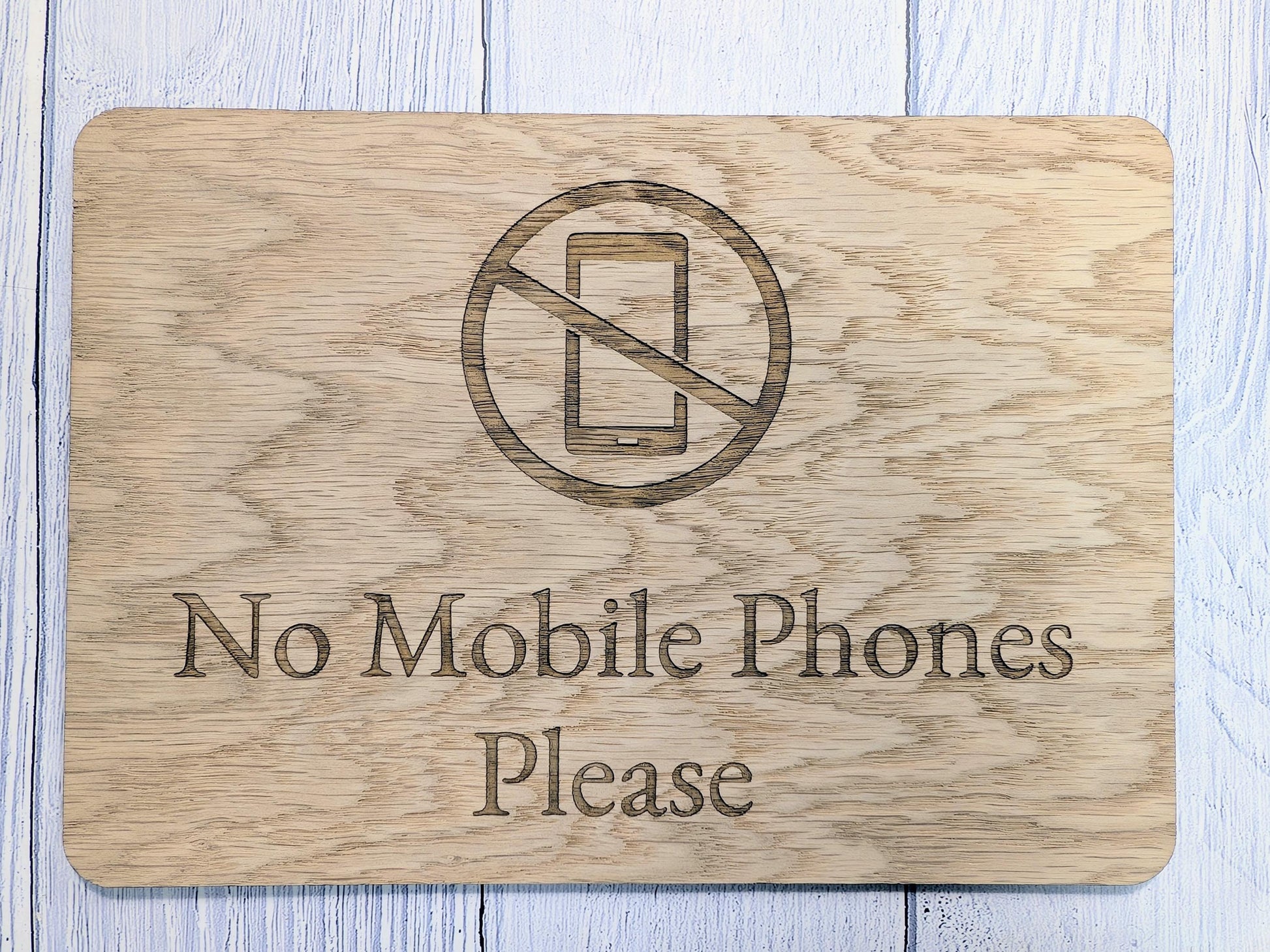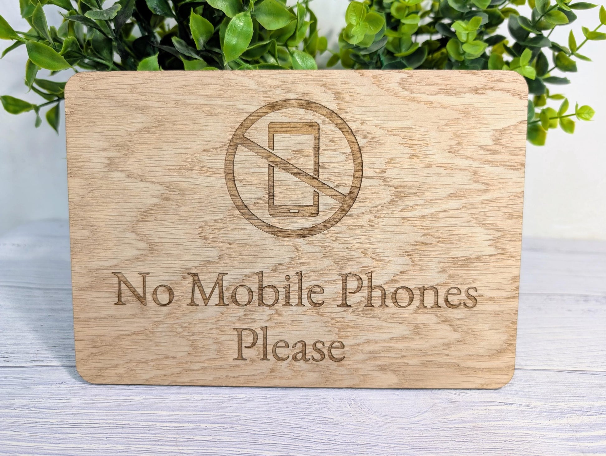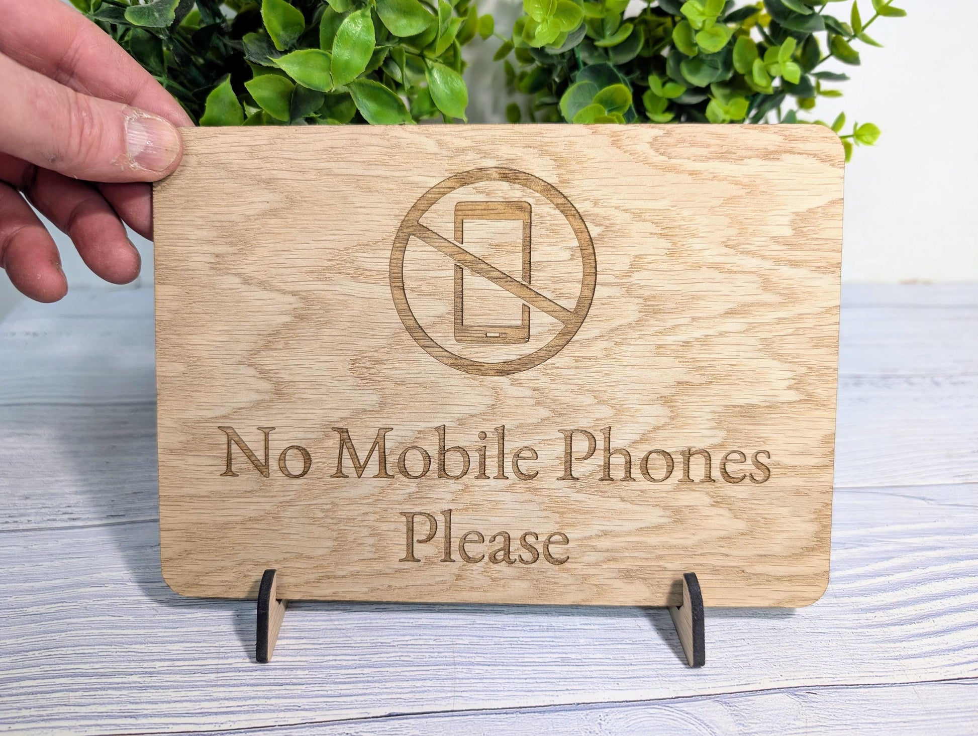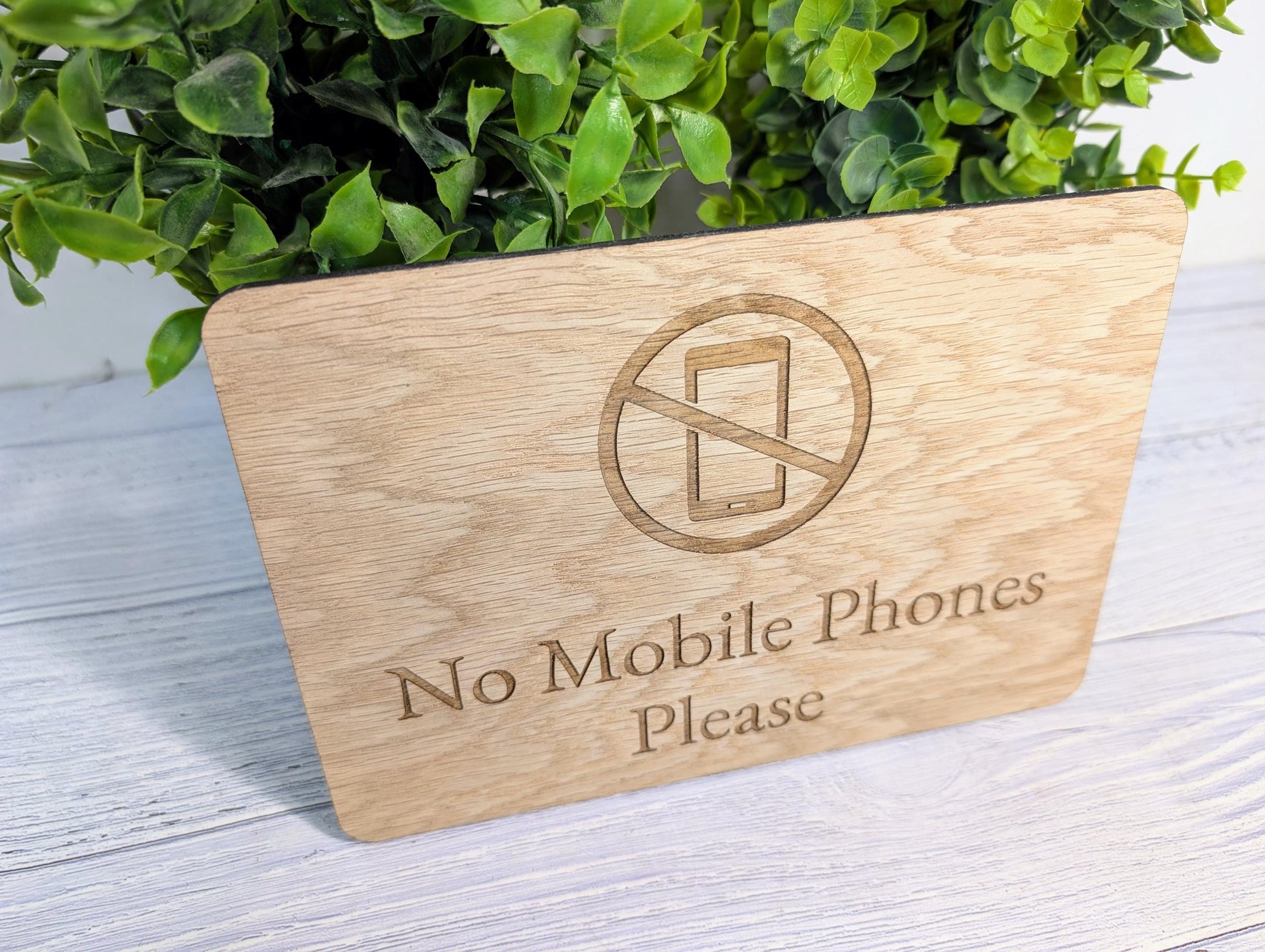 No Mobile Phones Sign – Wooden Oak Veneer Plaque – Freestanding No Phones Sign for Shops & Cafés – Optional Counter Stand