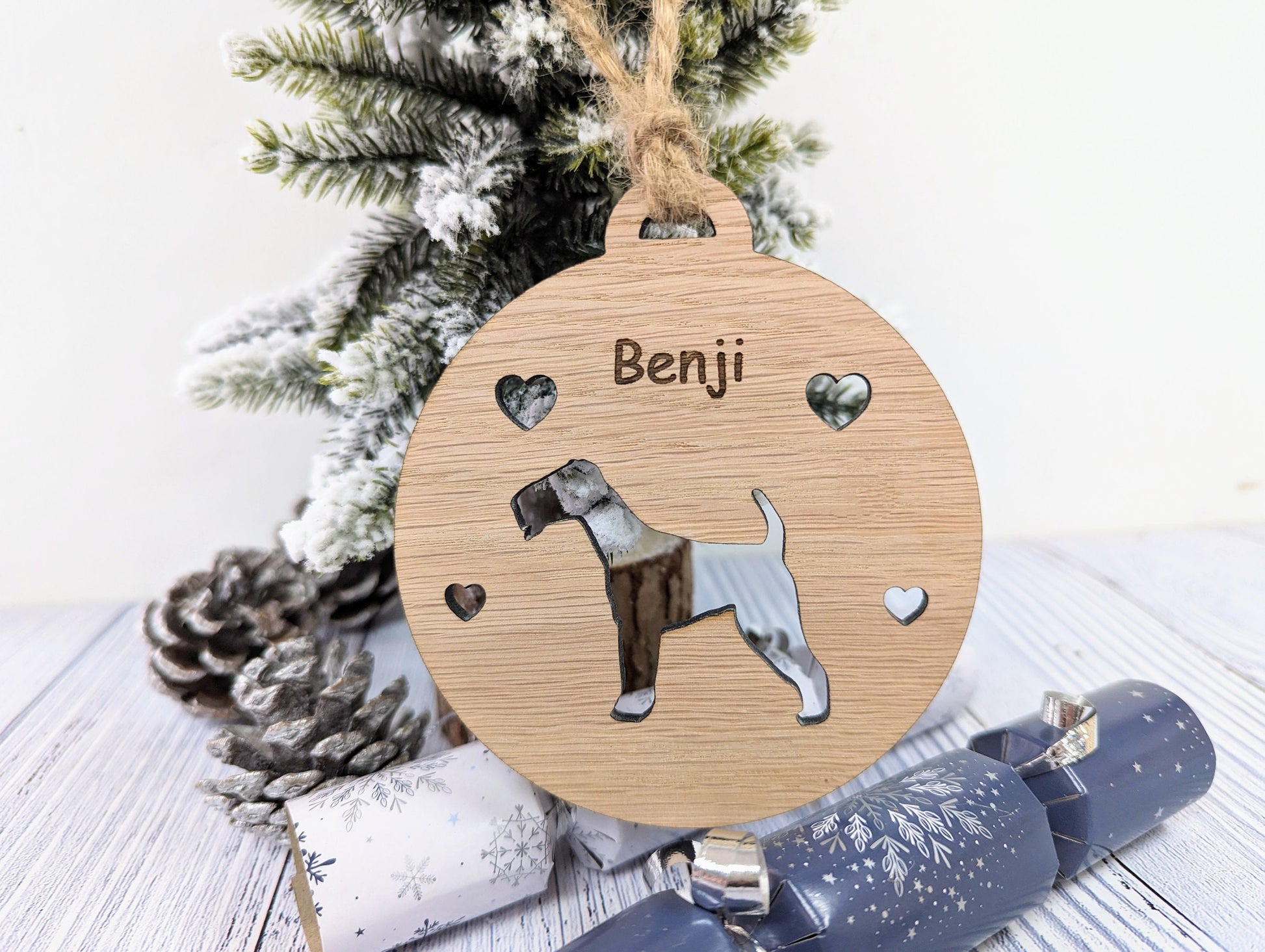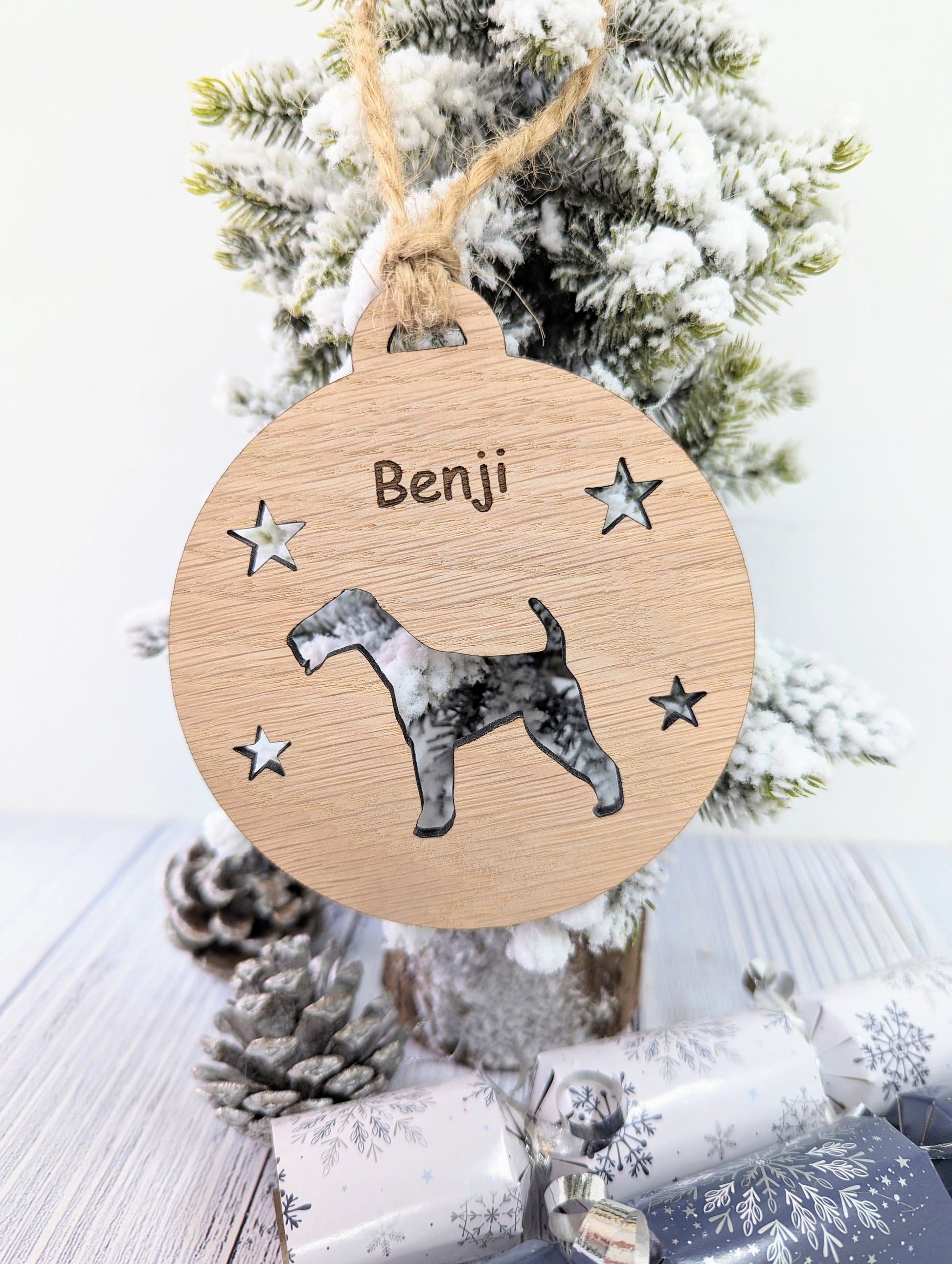 Personalised Airedale Terrier Christmas Bauble in Oak Veneer MDF - Rustic Jute String - Stars or Hearts Cut-Out - Airedale Terrier Gift