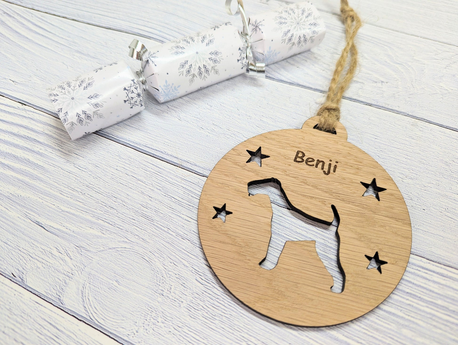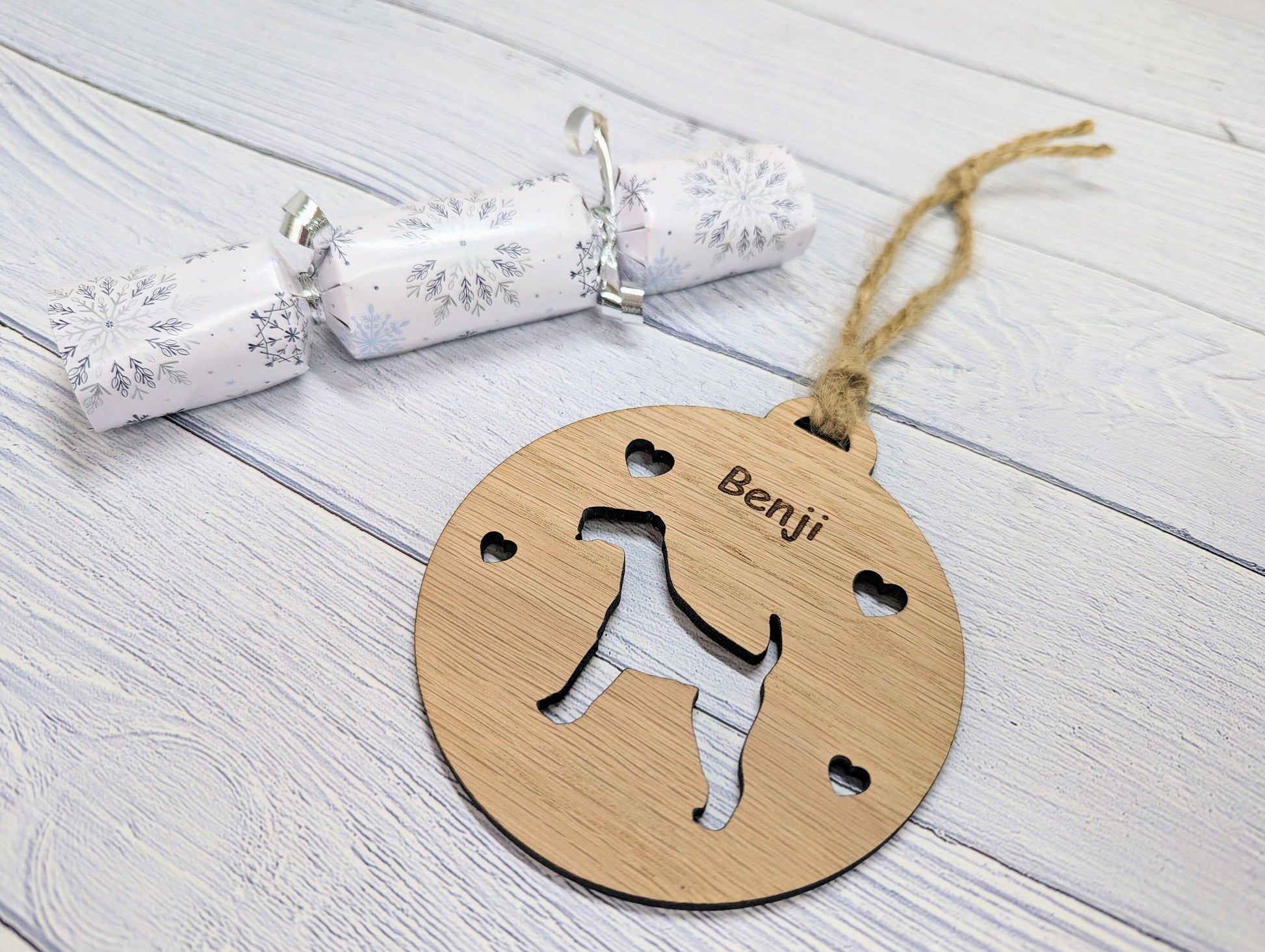 Our Airedale Terrier bauble comes in two styles: with stars or hearts cut out of the Oak Veneered MDF. Choose the one that best matches your holiday decor.