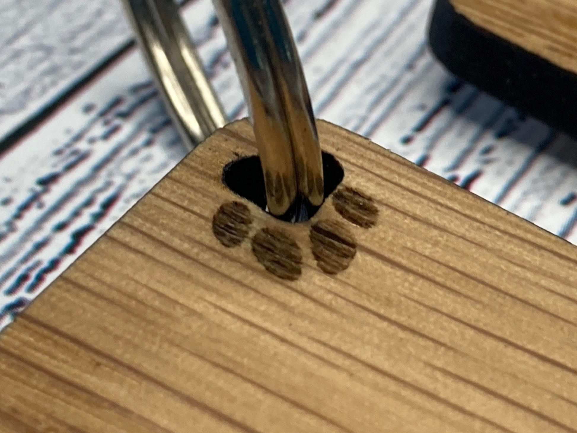 The keyrings are engraved on real Oak Wood Veneered MDF, engraved with your cats name along with the shape of a cat cut out. The hole for the ring is even designed to look like a tiny little paw print. These engraved keyrings come with a finish of a coat of Danish Oil to protect and bring out the lustre of the wood.