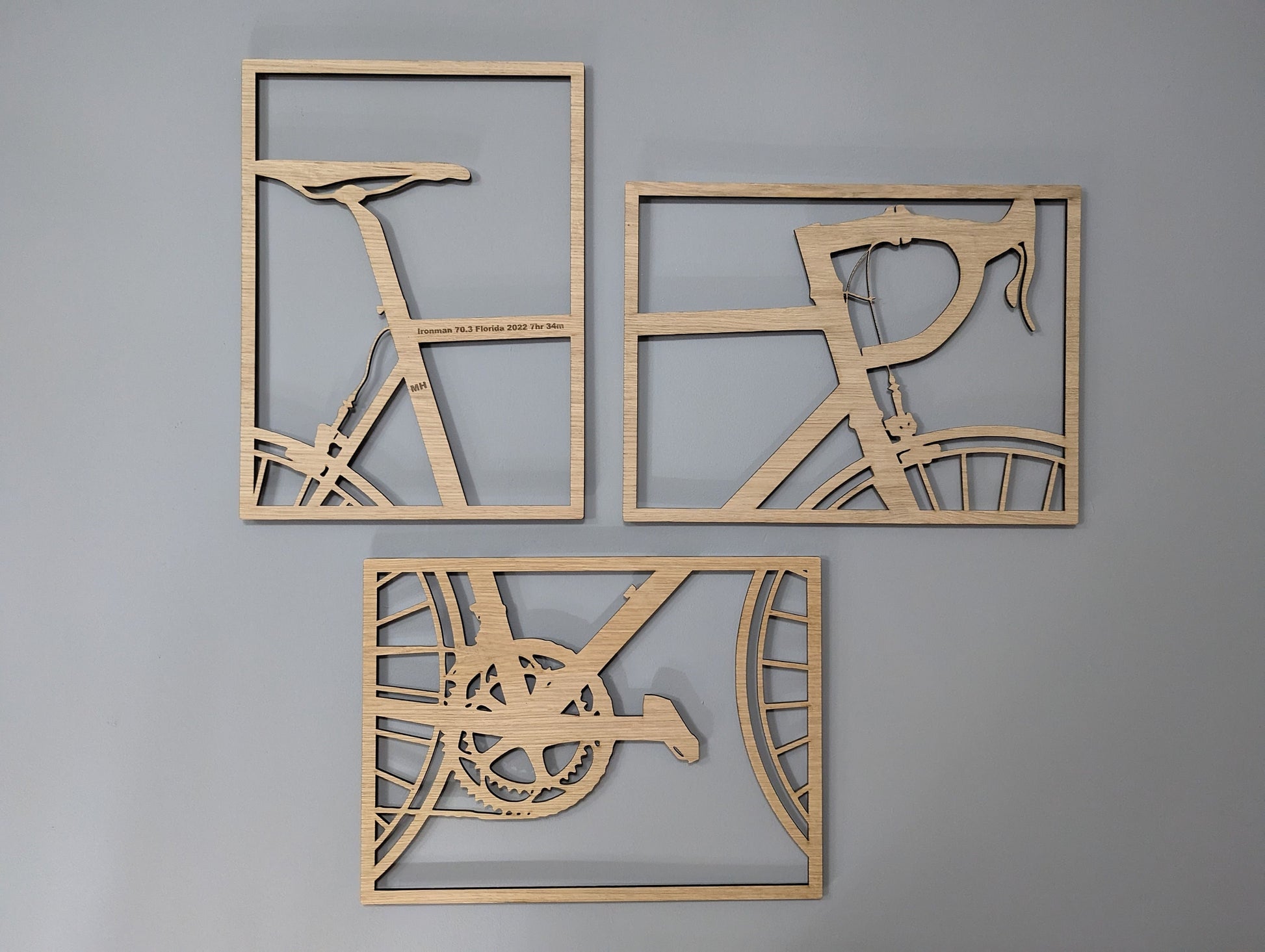 Cut and engraved on 4mm thick oak veneered MDF, the bike wall art design is tailored to for cyclists and can be positioned as in the pictures to show most of the bike. The background to the image is cut out so that your wall is visible.