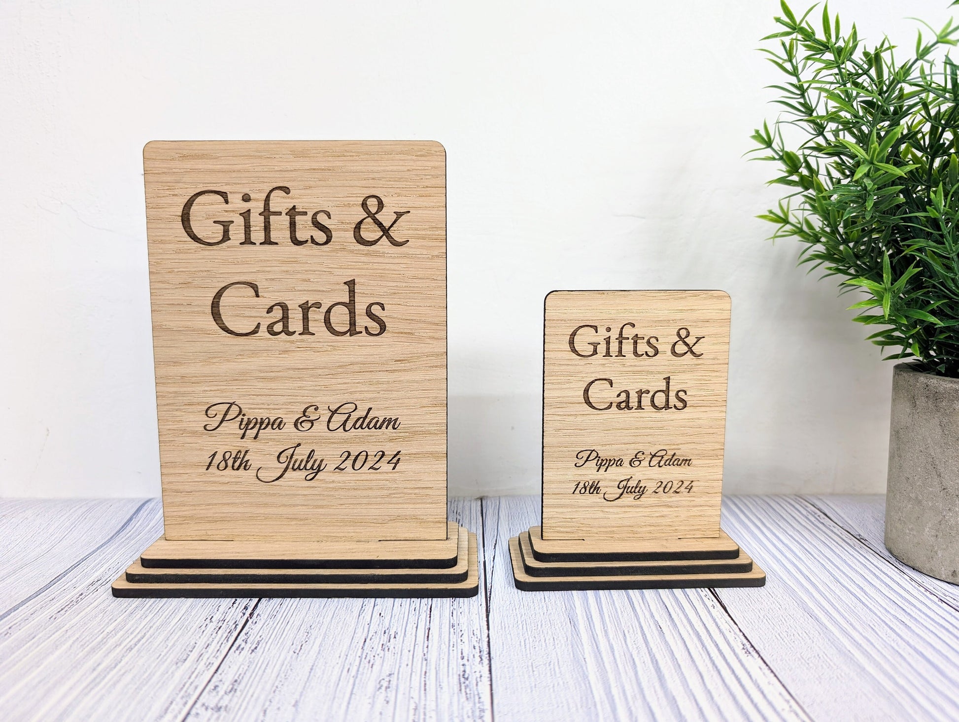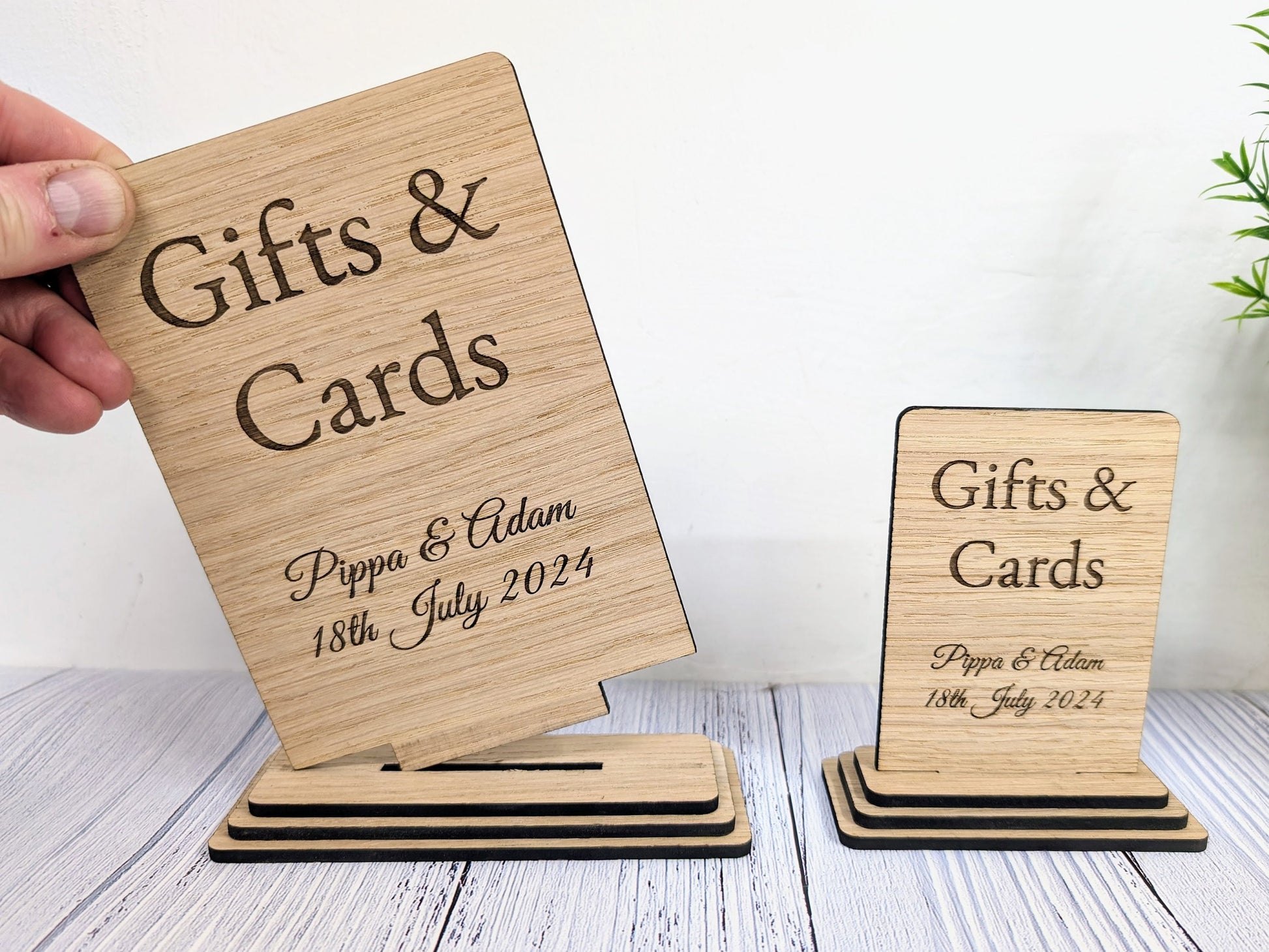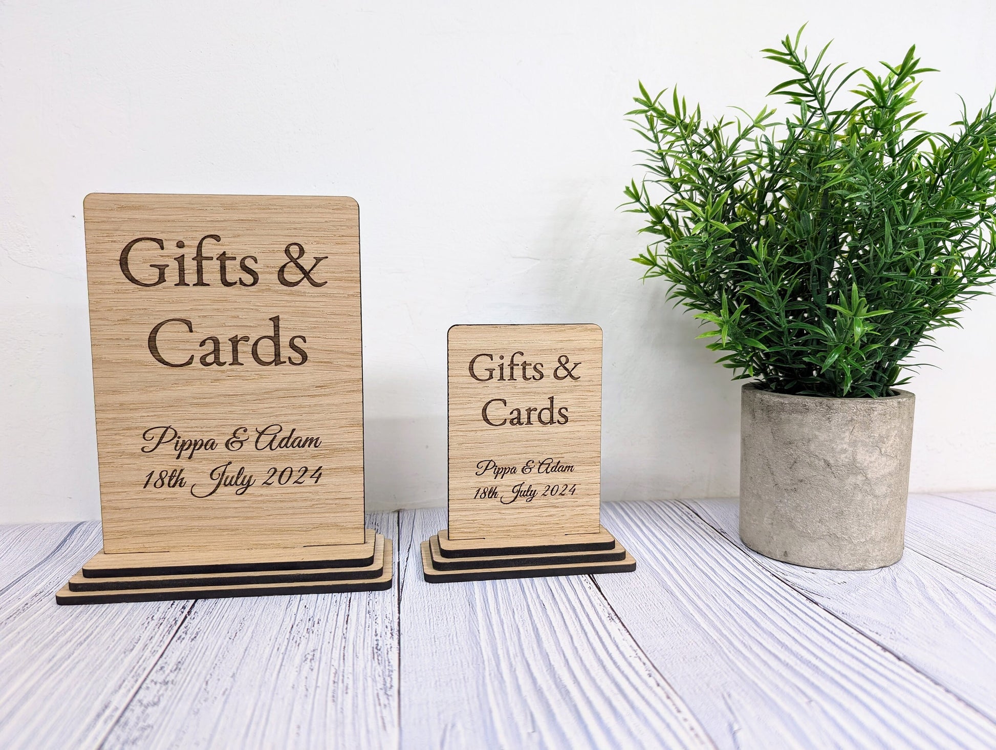 Personalised 'Gifts & Cards' Wooden Sign for Weddings and Parties - Eco-Friendly Freestanding Display with Couple's Name and Date