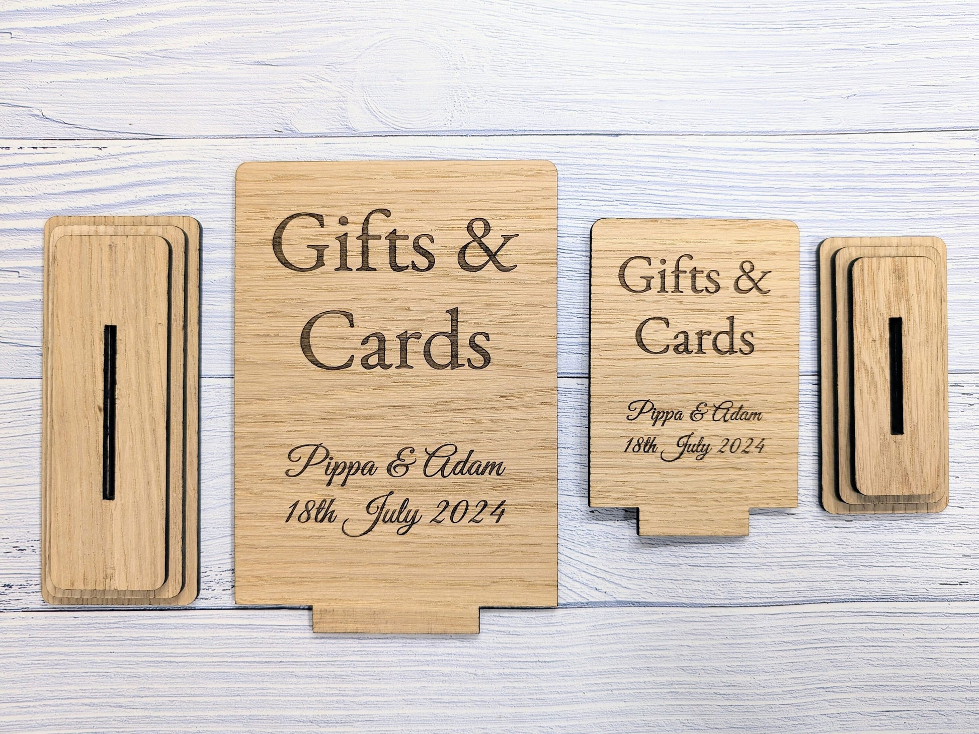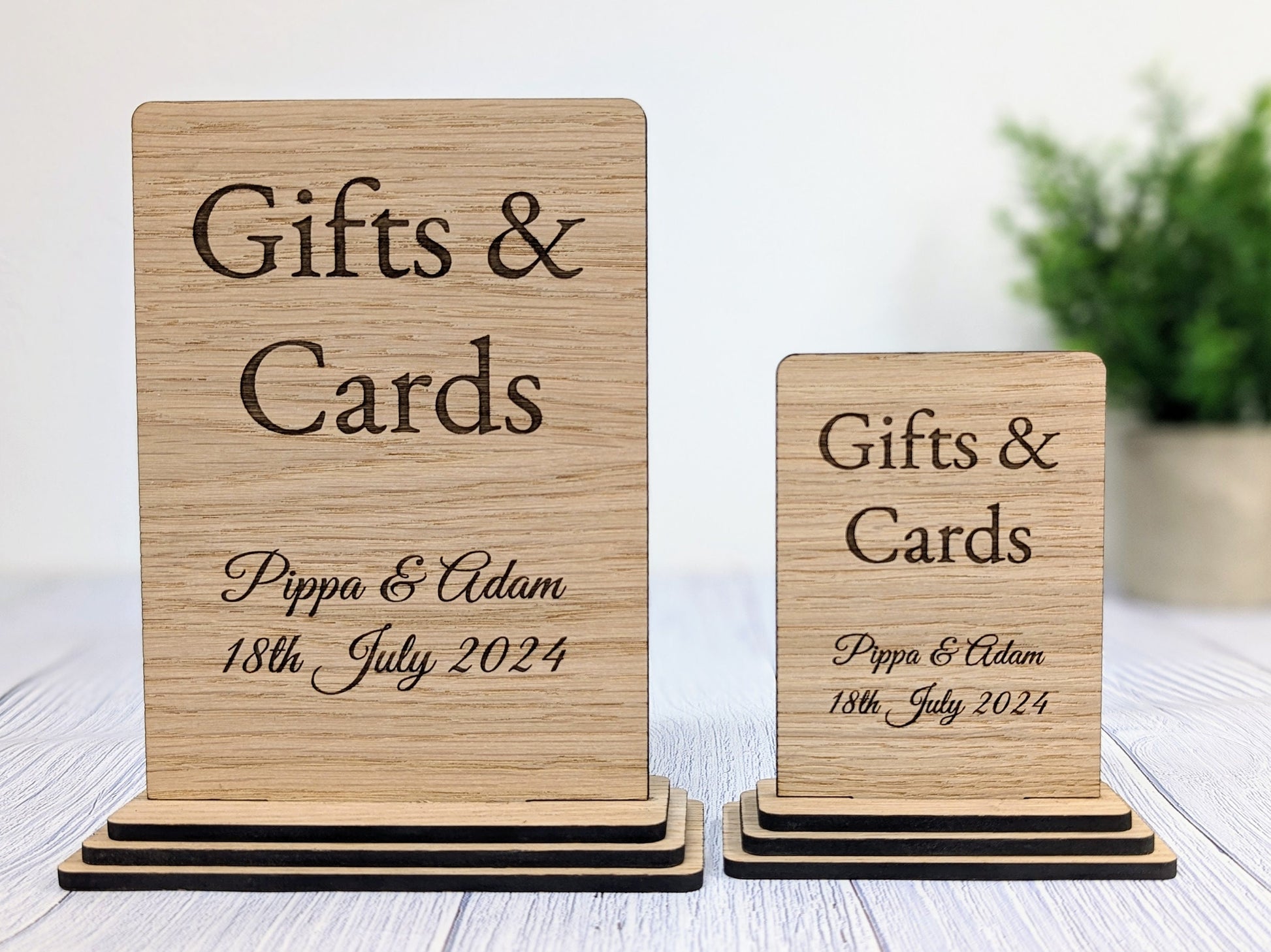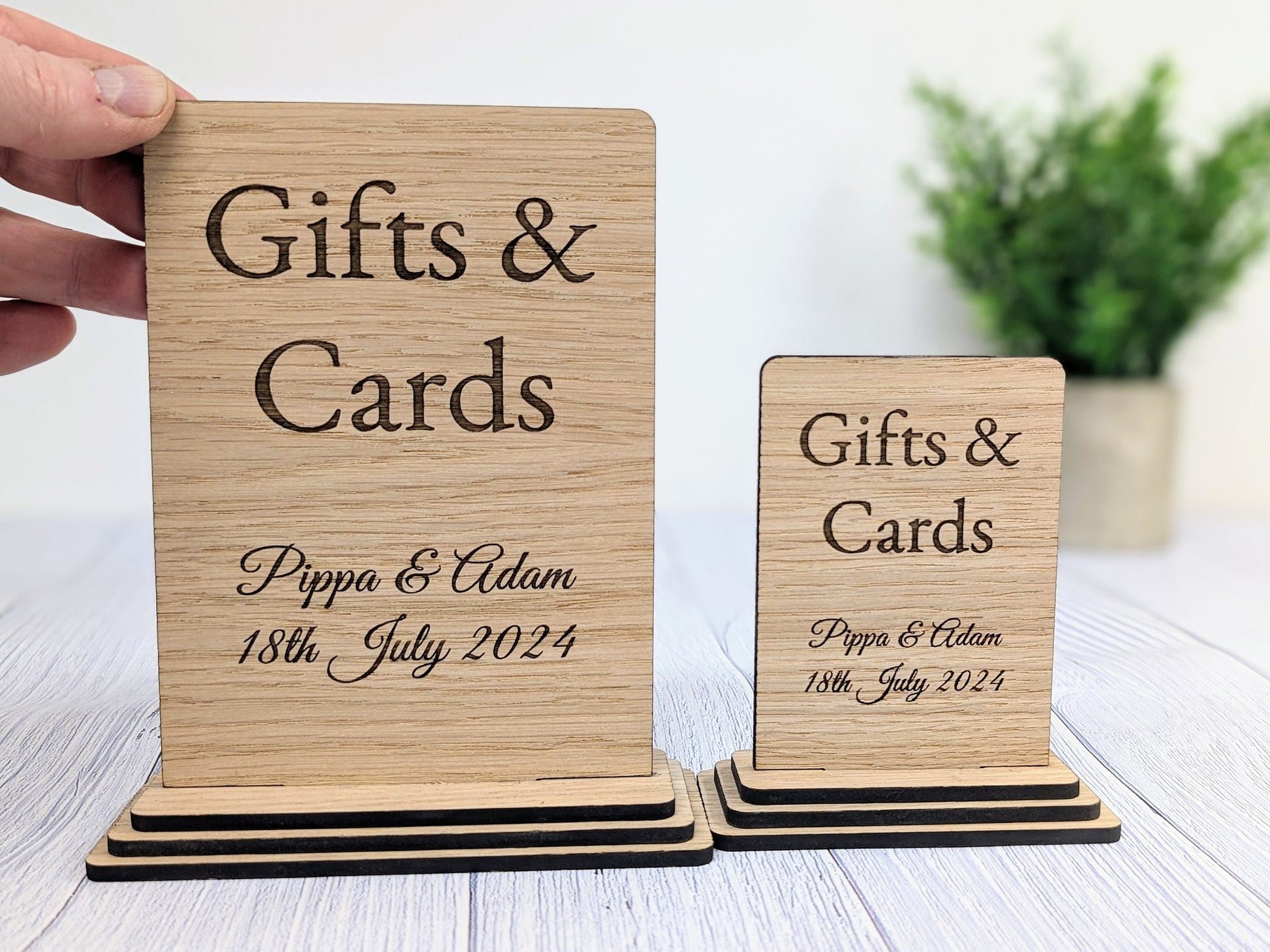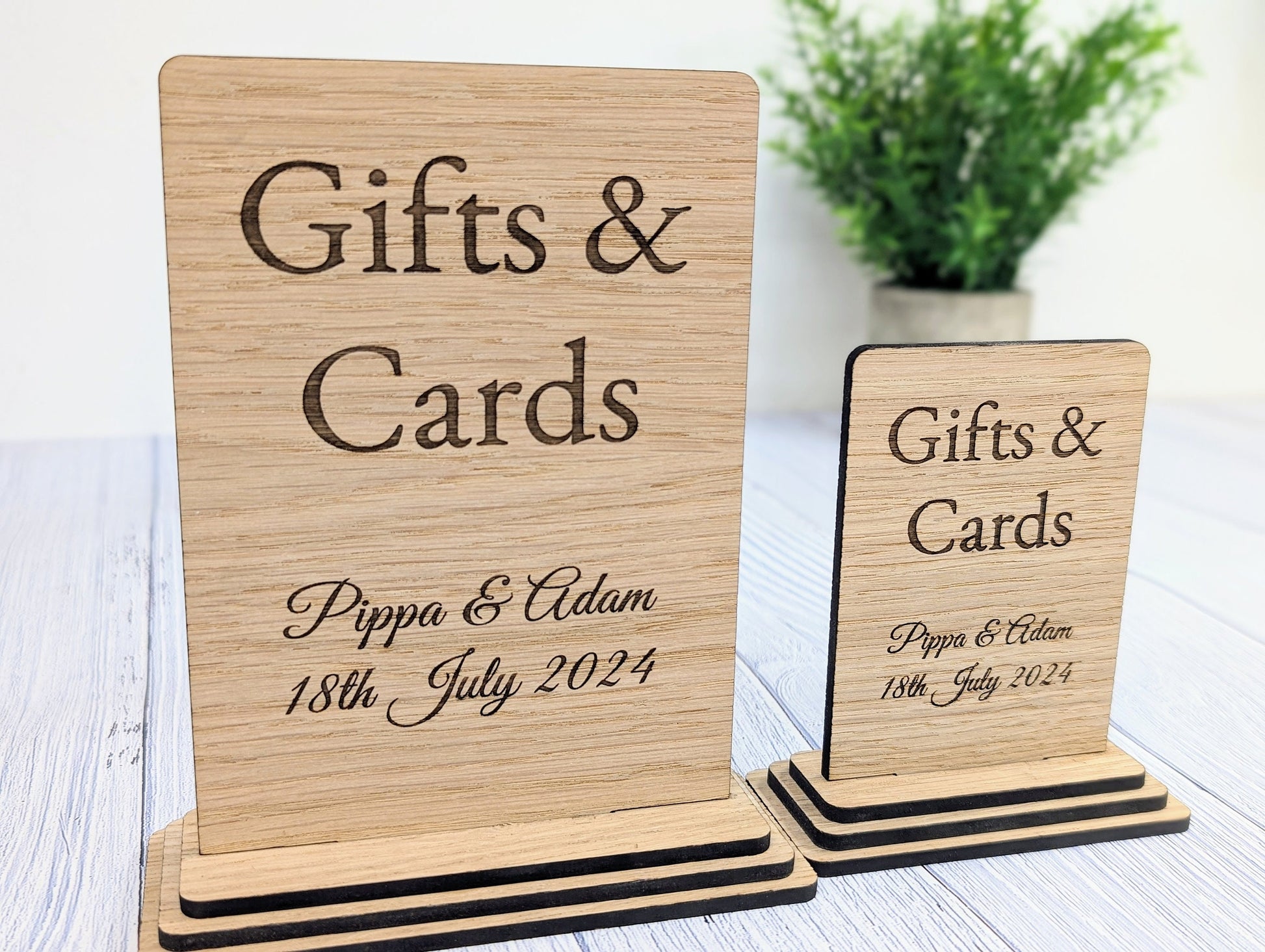 Personalised 'Gifts & Cards' Wooden Sign for Weddings and Parties - Eco-Friendly Freestanding Display with Couple's Name and Date