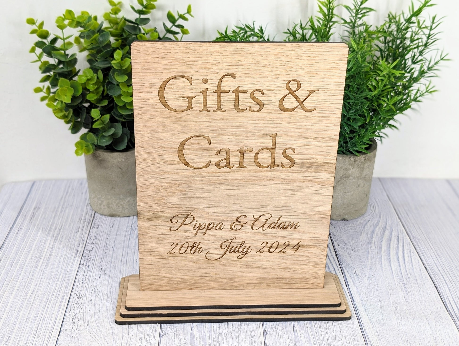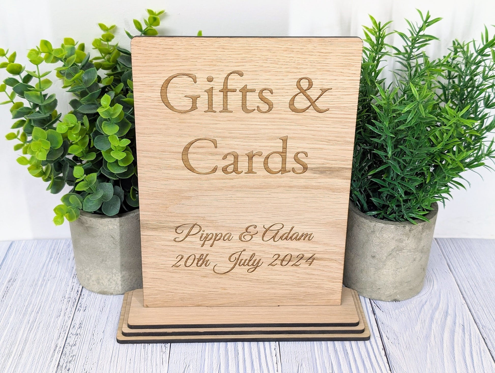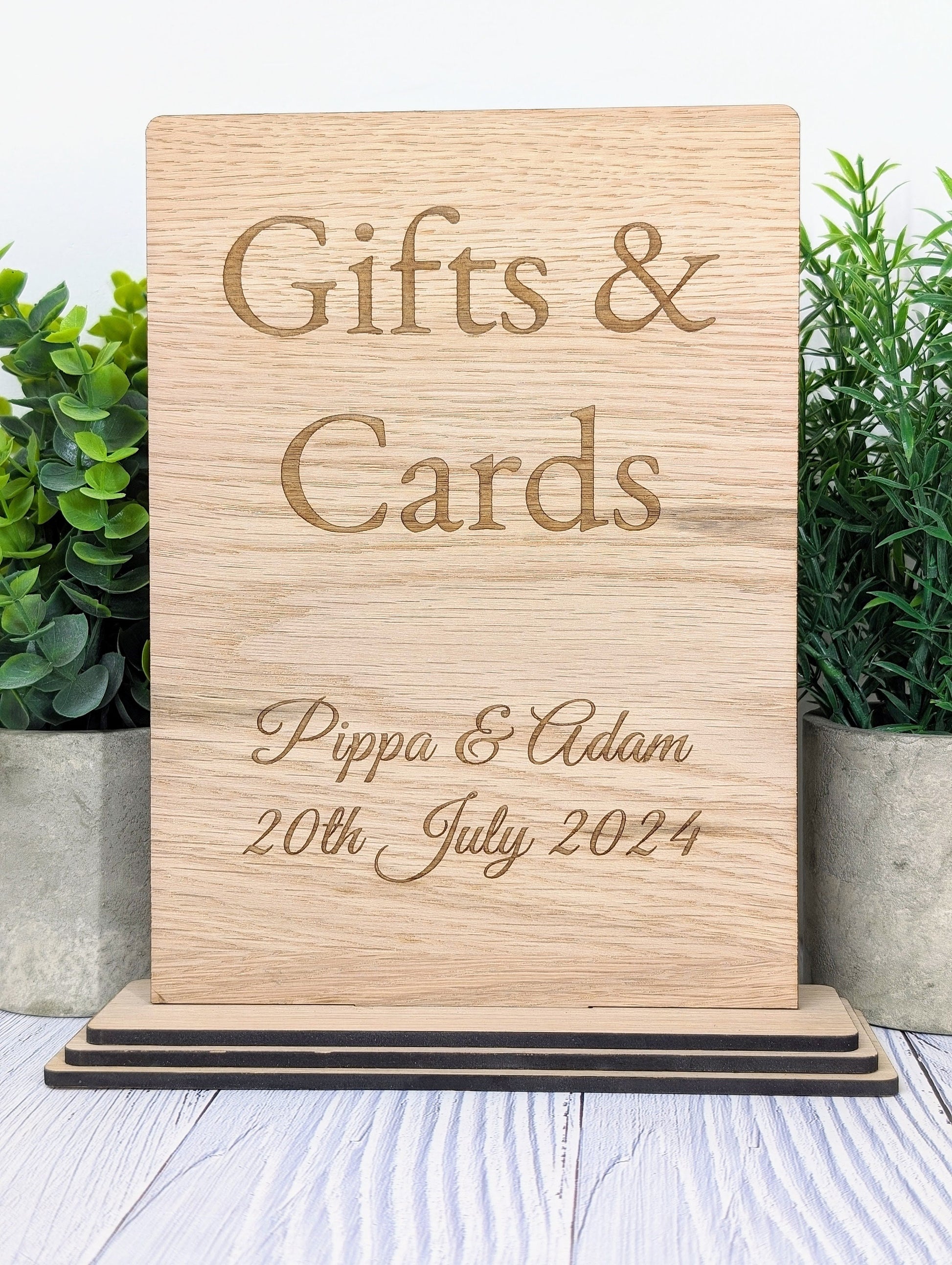 Add a charming touch to your wedding or party with our personalised 'Gifts & Cards' wooden sign, meticulously handcrafted in Wales from sustainably sourced wood. This freestanding sign is not just a practical guide for your guests but also a beautiful keepsake, personalised with the couple's name and the special date, commemorating your celebration in style.