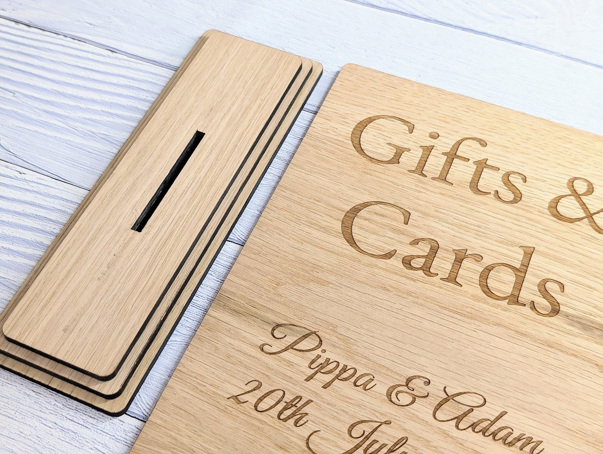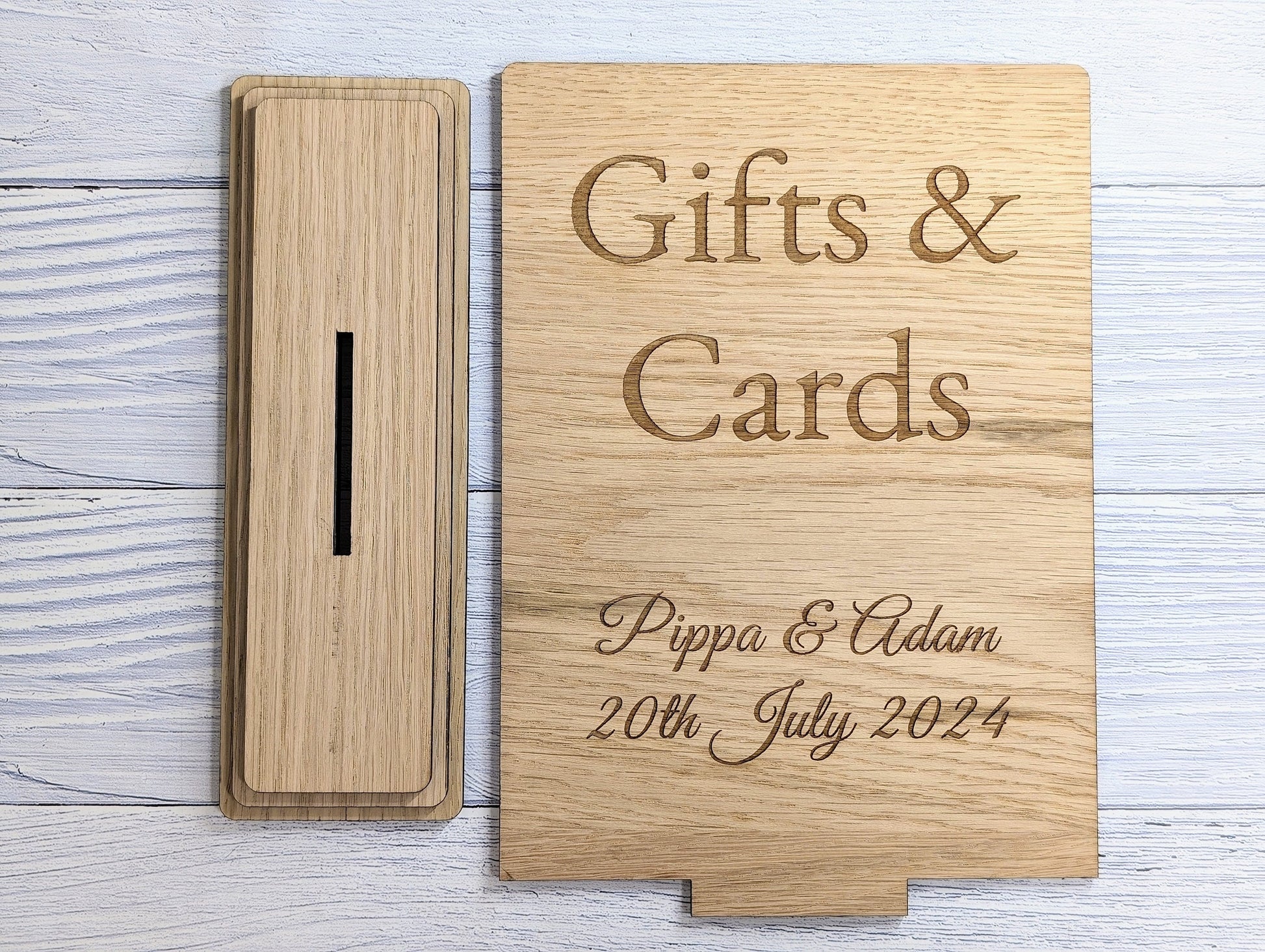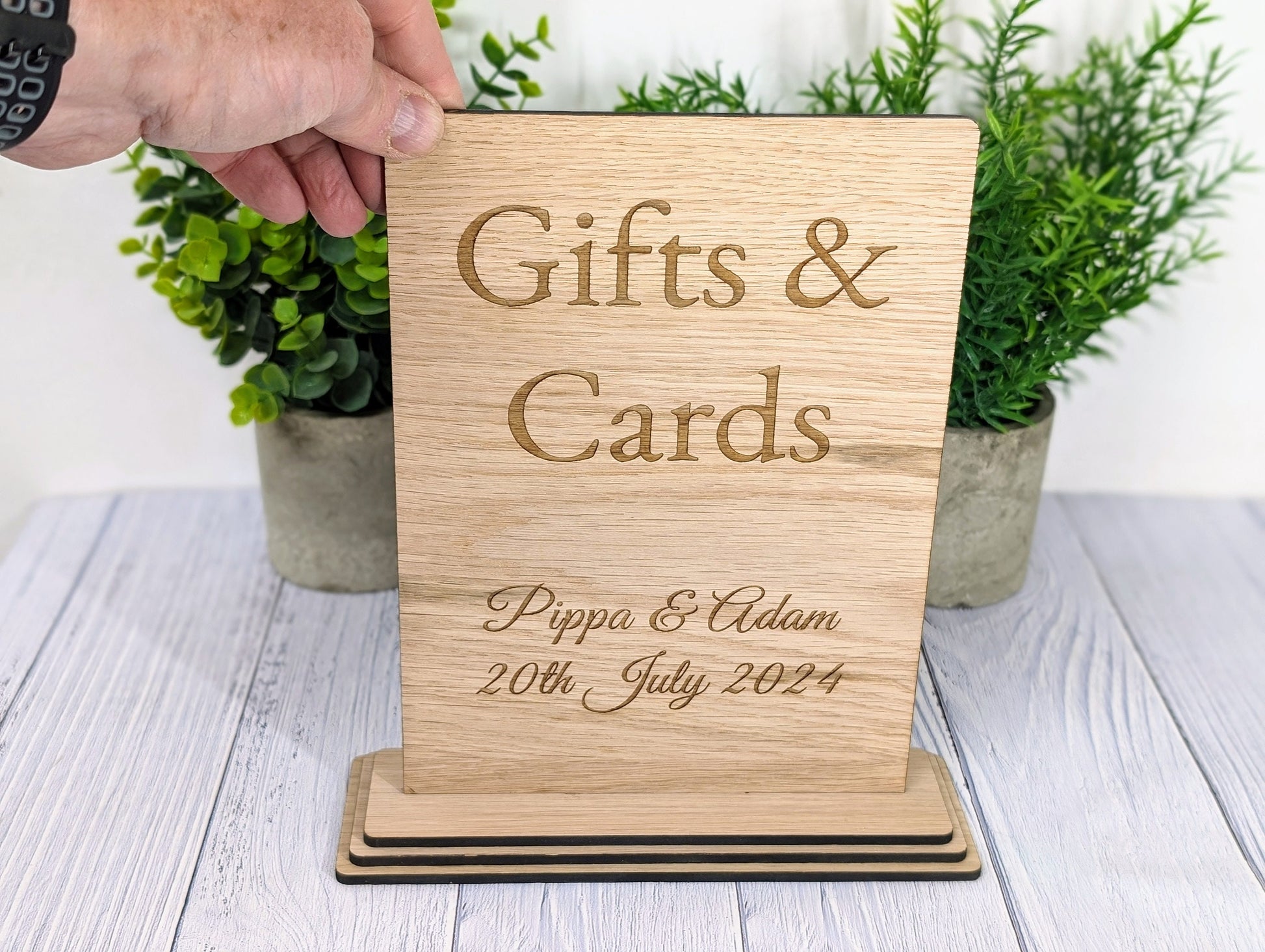 Add a charming touch to your wedding or party with our personalised 'Gifts & Cards' wooden sign, meticulously handcrafted in Wales from sustainably sourced wood. This freestanding sign is not just a practical guide for your guests but also a beautiful keepsake, personalised with the couple's name and the special date, commemorating your celebration in style.