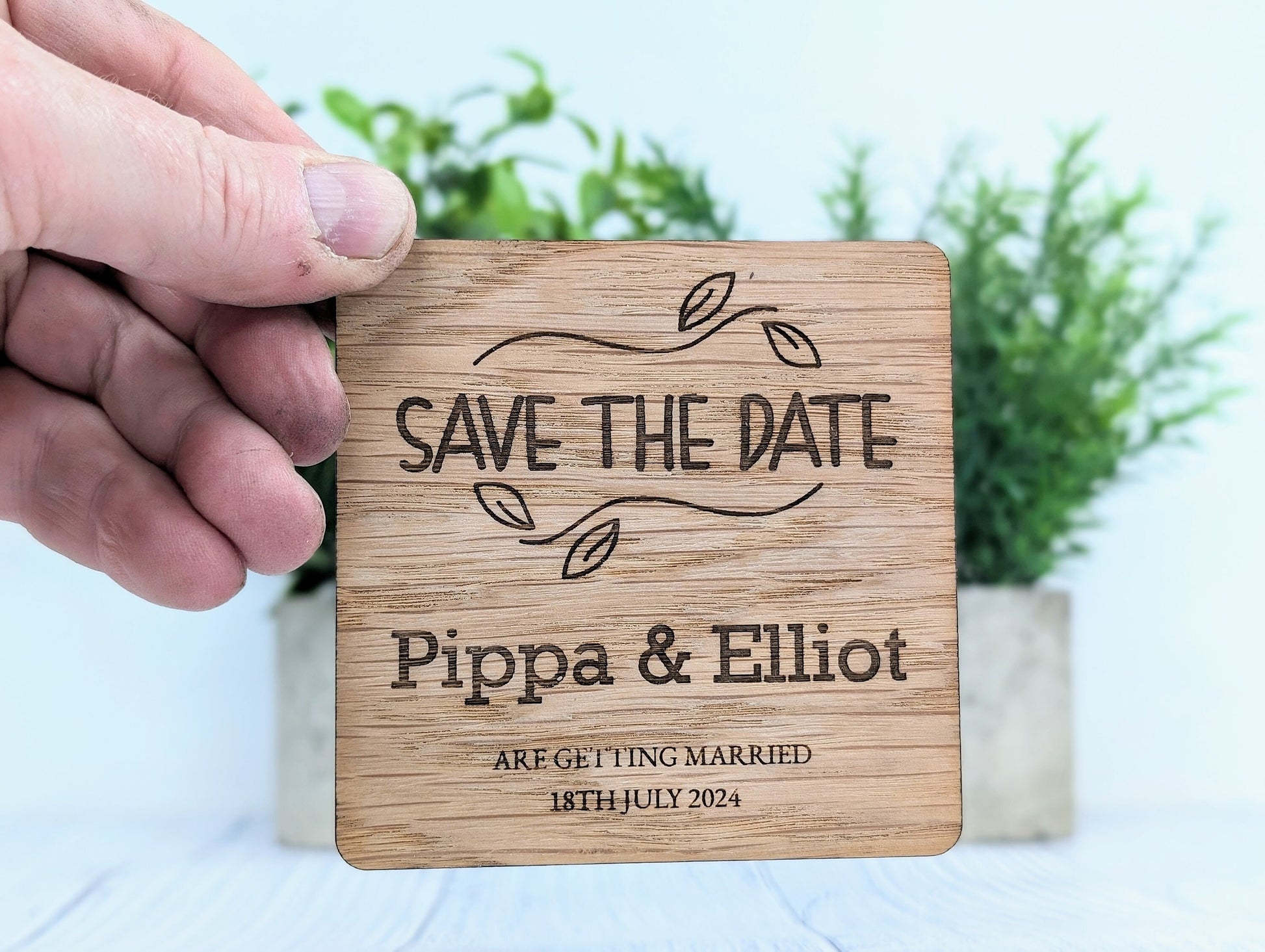 Personalised 'Save The Date' Wooden Coasters - Custom with Names & Date, 90mm x 90mm, Unique Oak Veneer Wedding Favours
