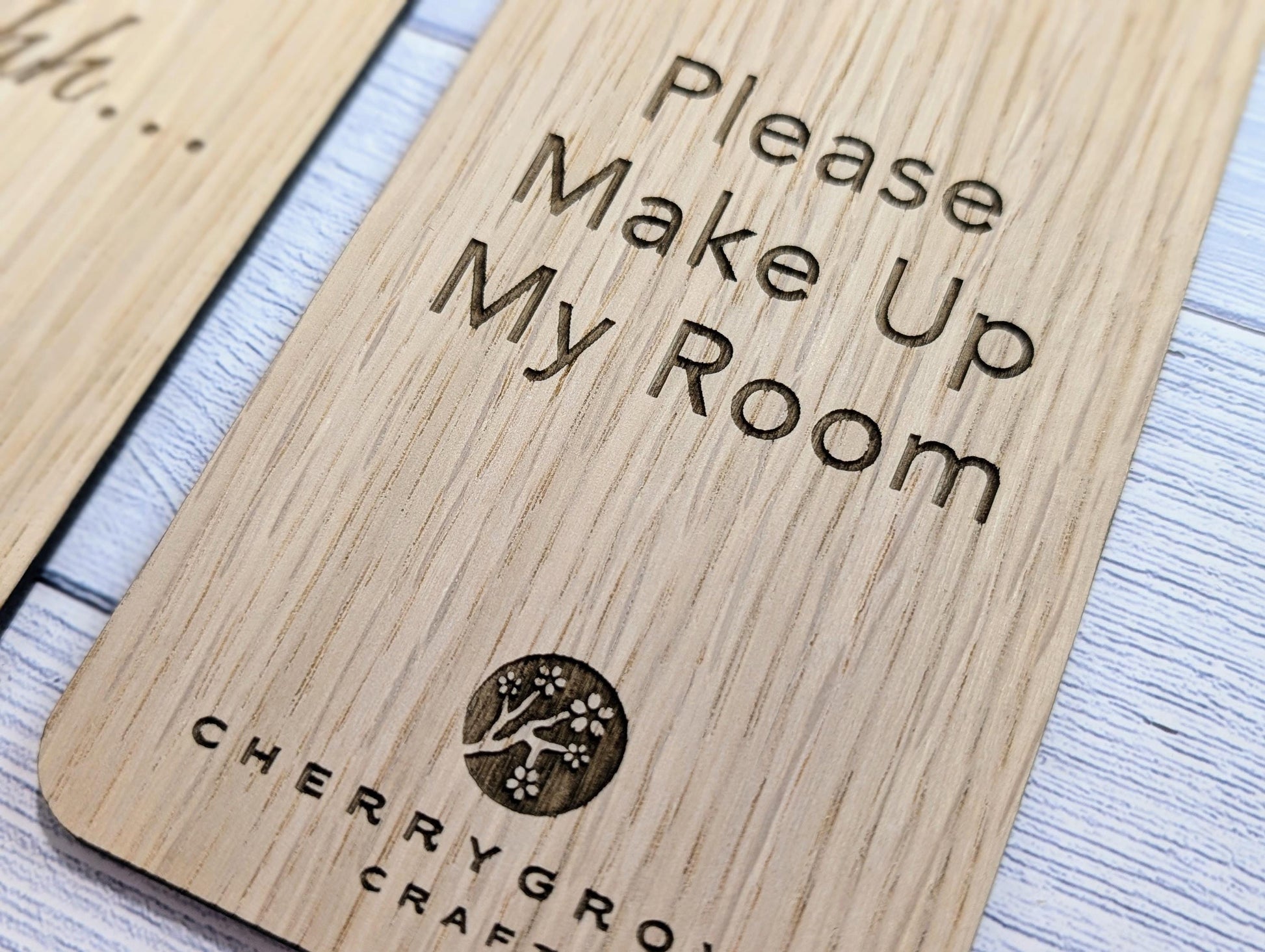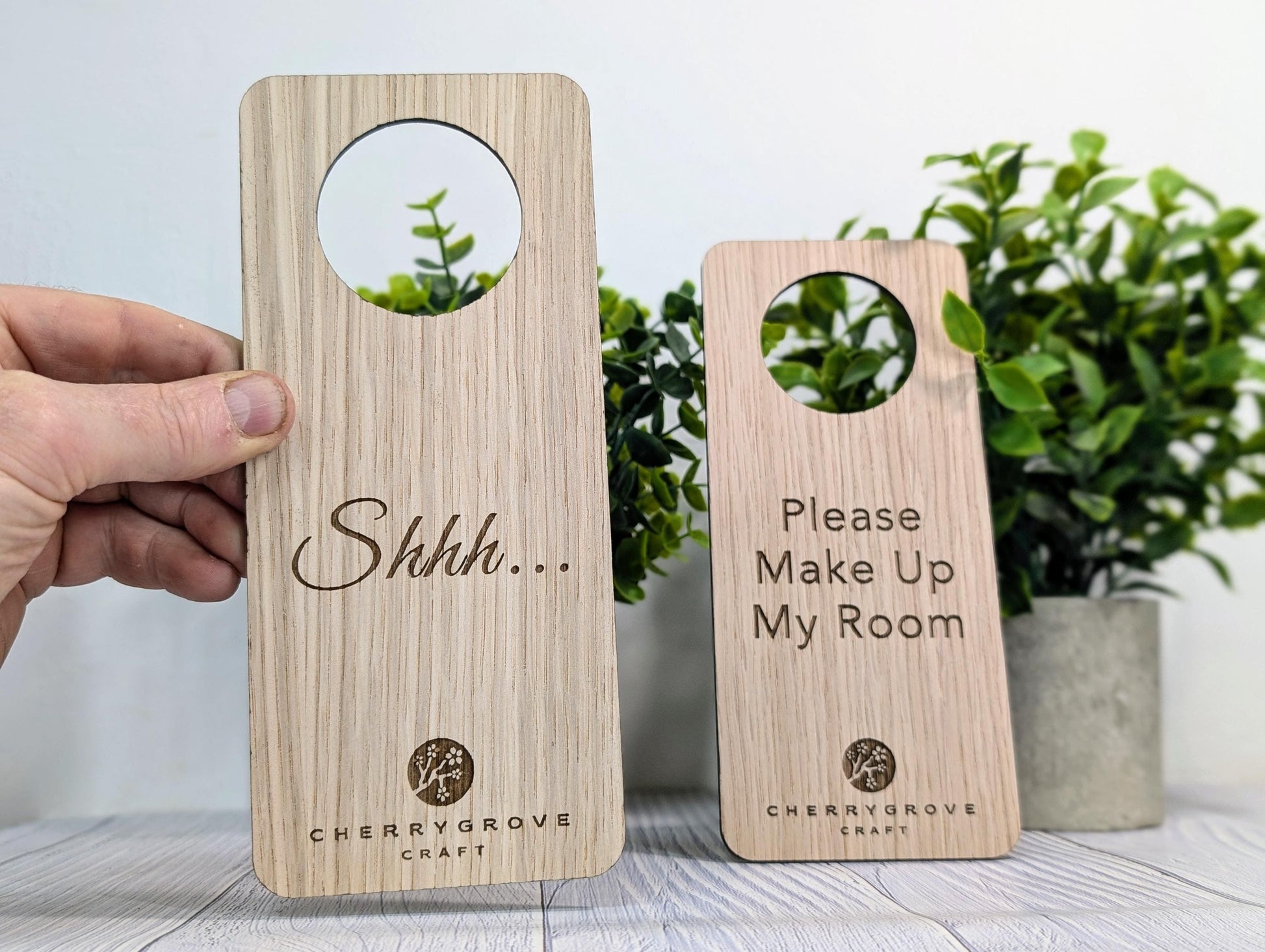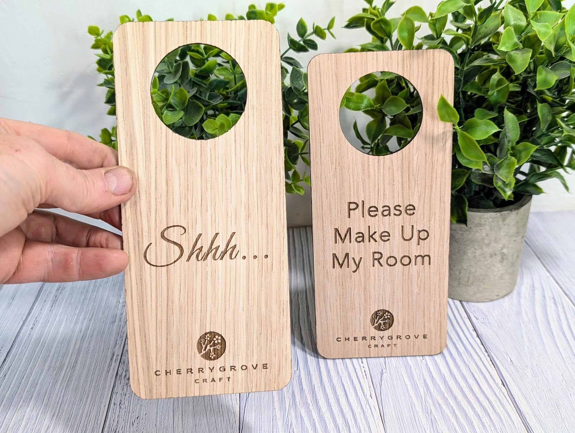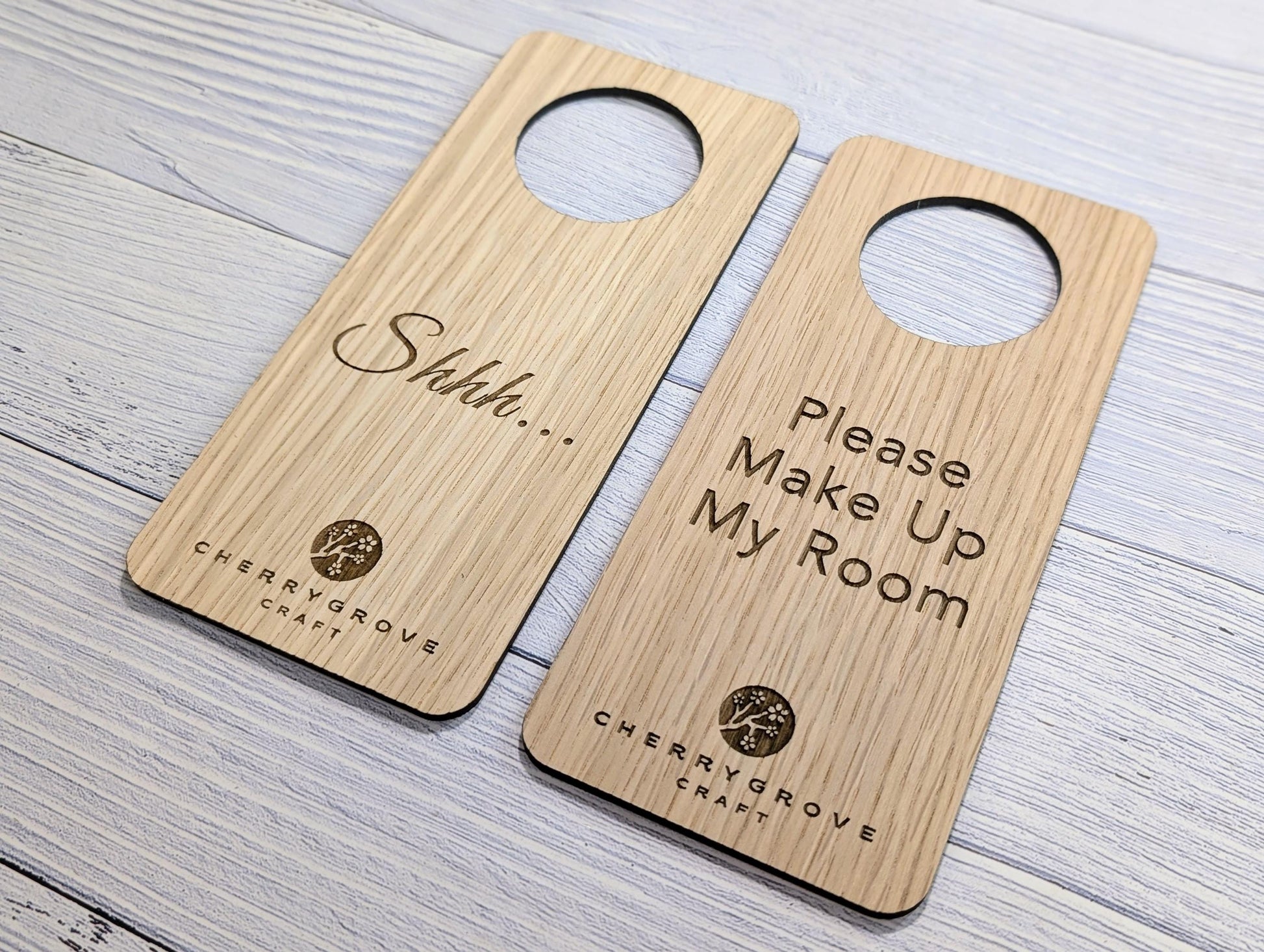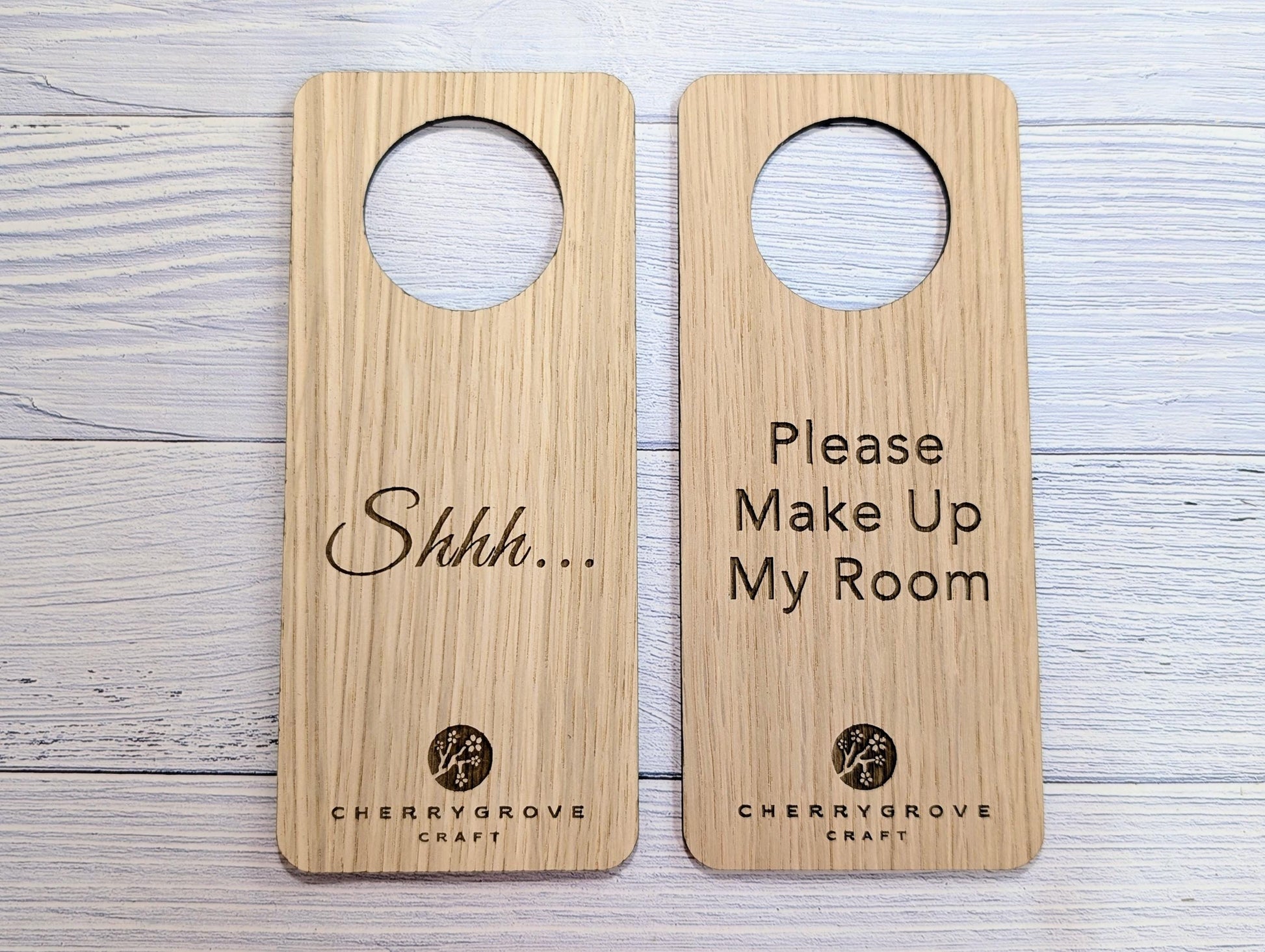 Personalised Wooden Door Hanger – "Shhh..." and "Please Make Up My Room", Custom Logo Option, Eco-Friendly Hotel & BnB Bedroom Sign