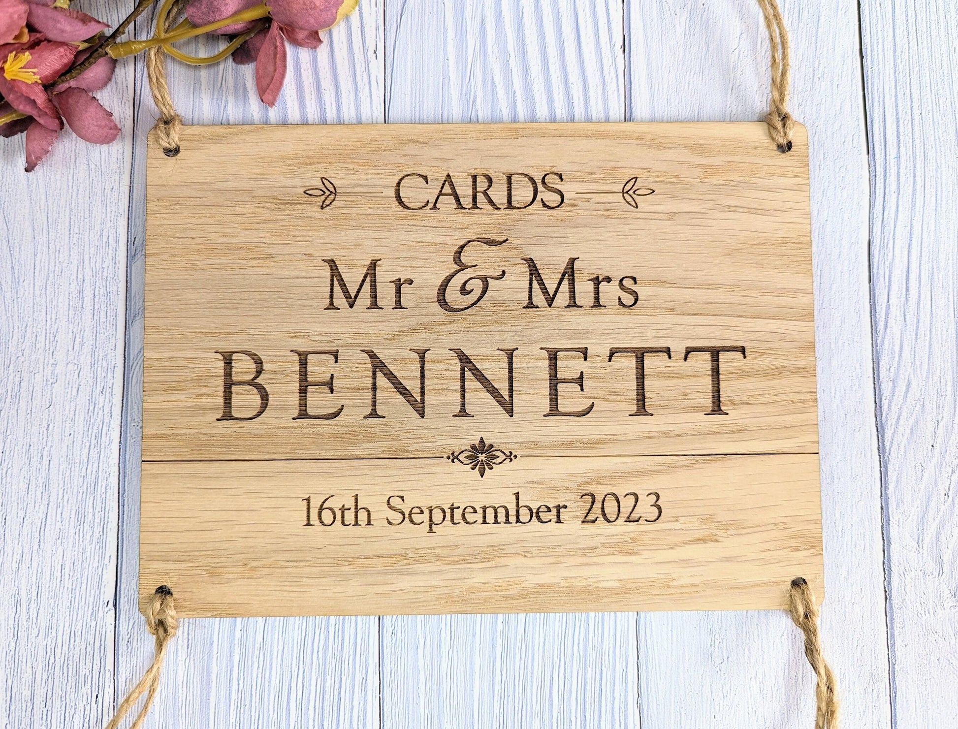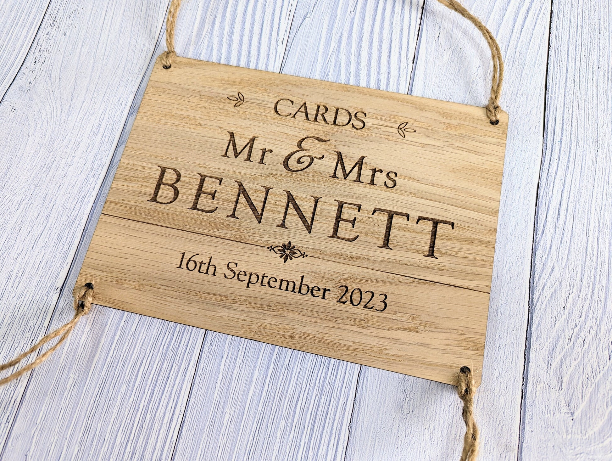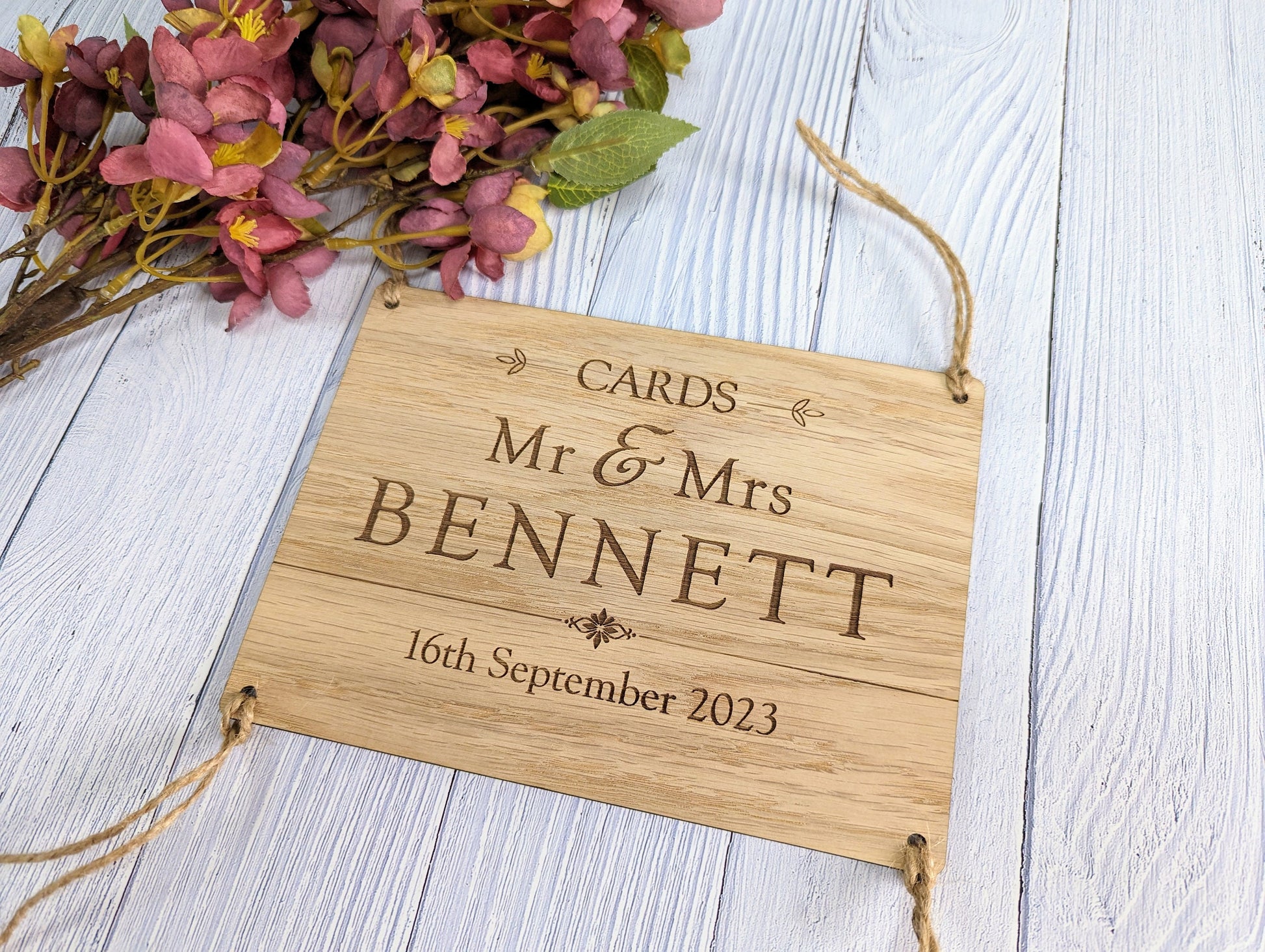 Our sign comes with four holes, one at each corner, and is supplied with a rustic string, making it easy to attach to a wicker case or box where guests can drop their wedding cards. Personalise it with your married name and the date of your wedding to make it uniquely yours!