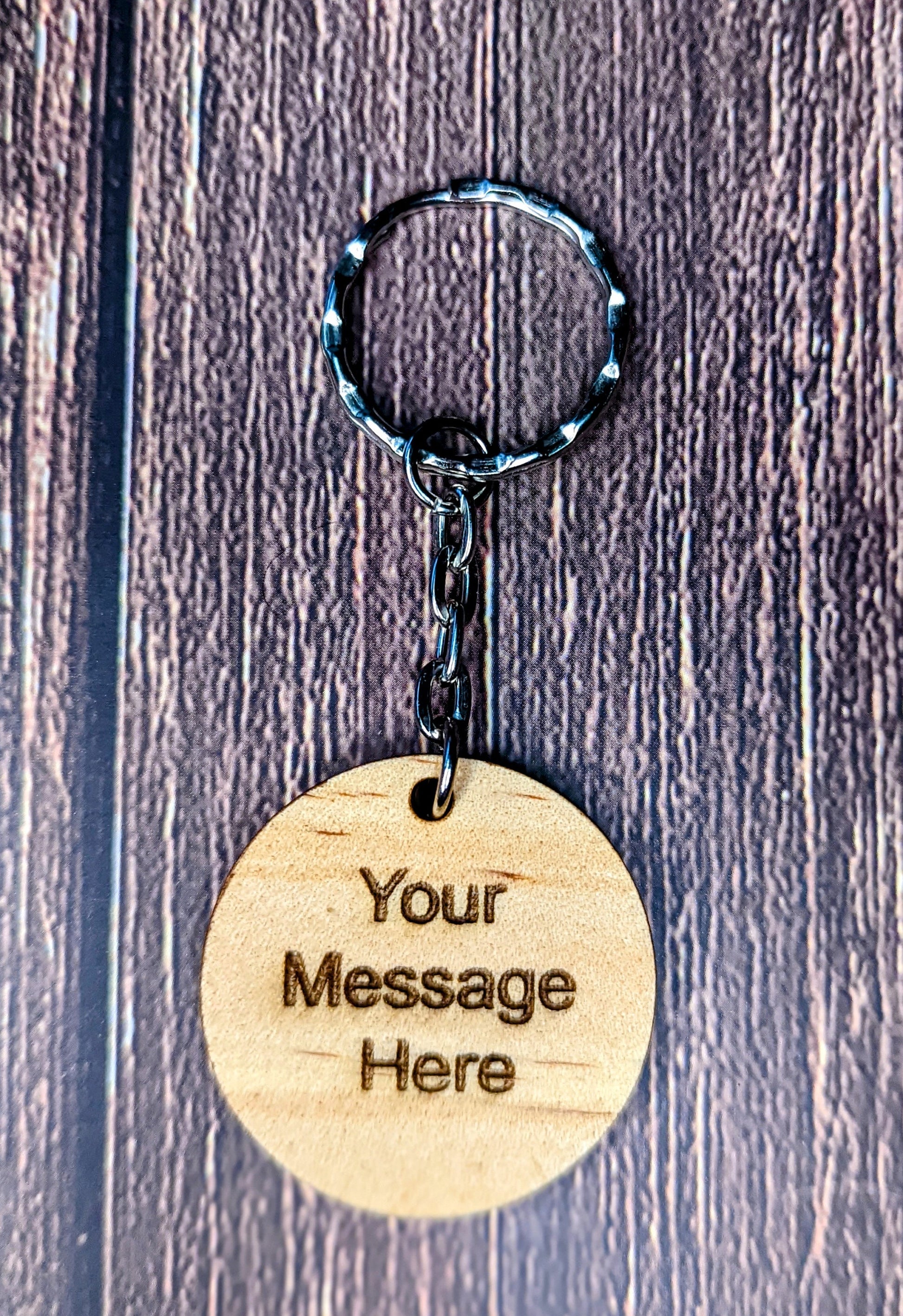 The wooden key fob is made from sustainable wood, and is laser engraved. It measures 35mm in diameter.