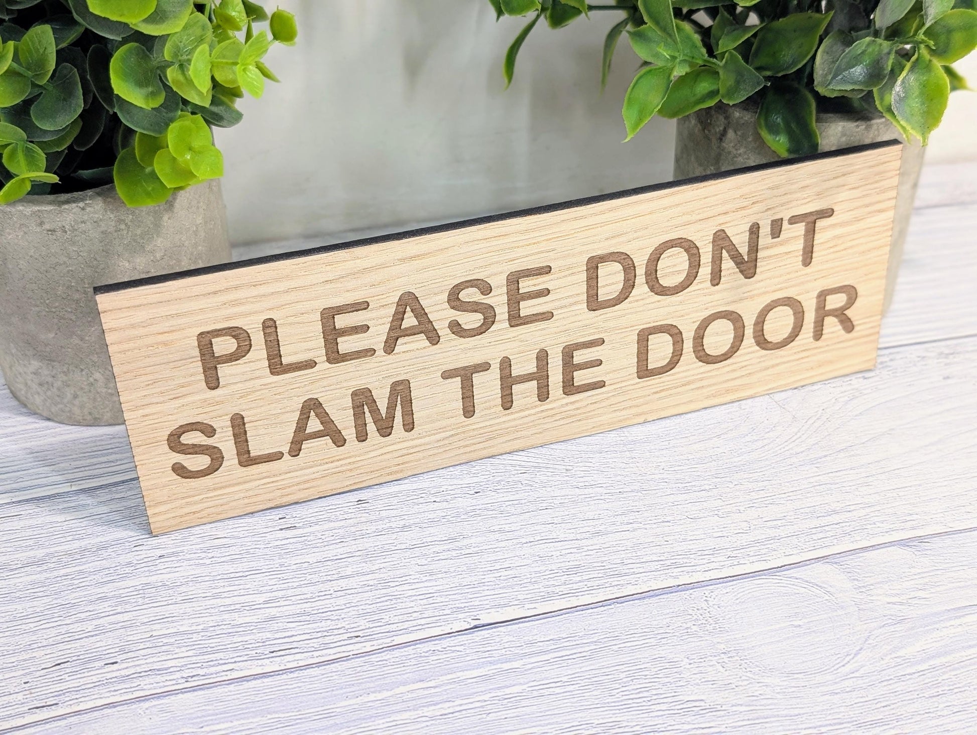 Please Don’t Slam The Door Sign – Personalised Wooden Door Sign | Custom Text Oak Veneer Wall Plaque | Home Office Shed Decor