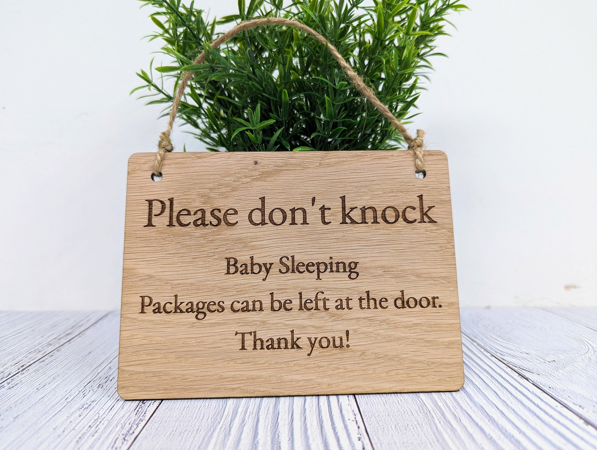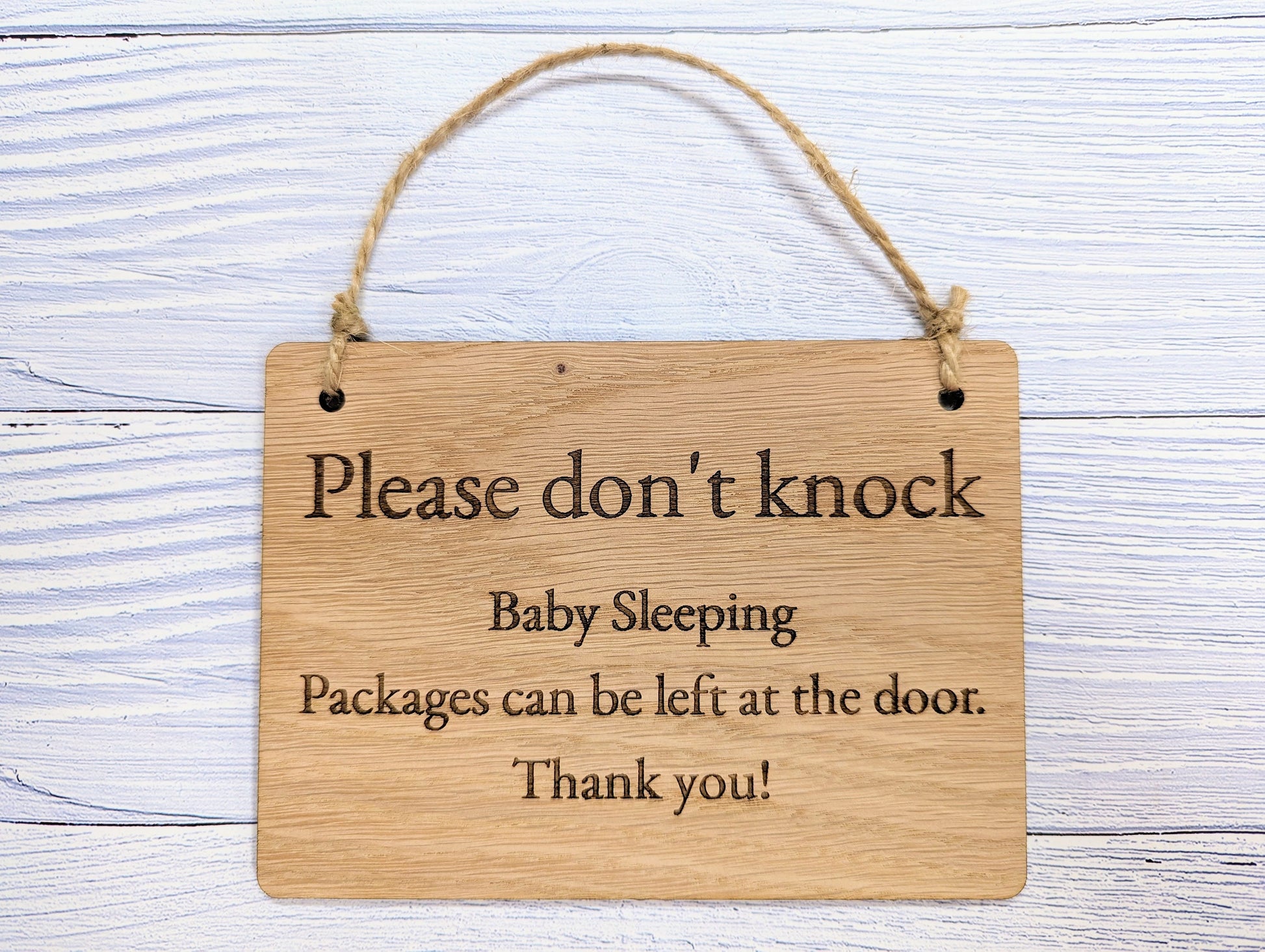 While the standard message reads "Please Don't Knock, Baby Sleeping, Packages can be left at the door," you can personalise this sign with your own text to suit other instances, such as "Working Nights" or "Do Not Disturb."