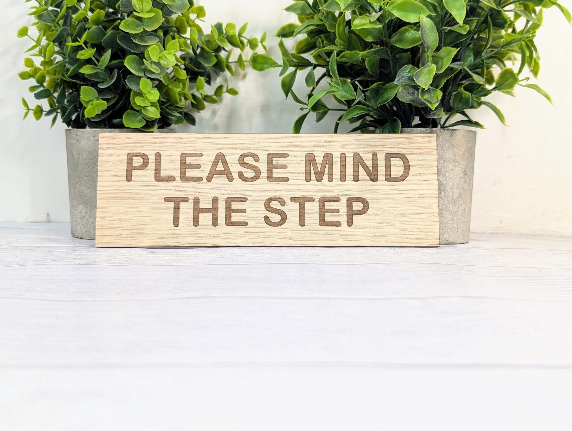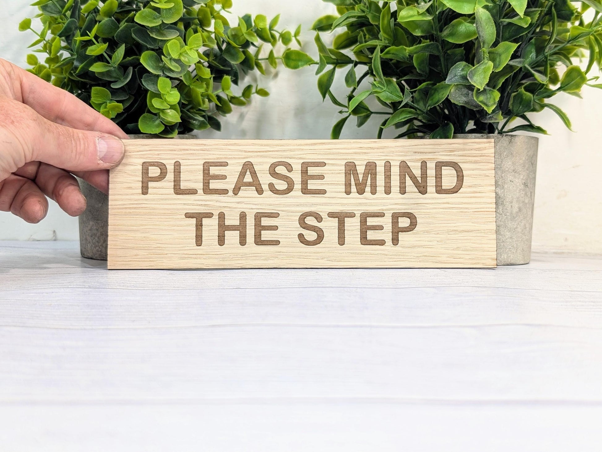 Please Mind The Step Sign – Personalised Wooden Door Sign | Custom Text Oak Veneer Wall Plaque | Private Shop Cafe Warehouse Office Signage