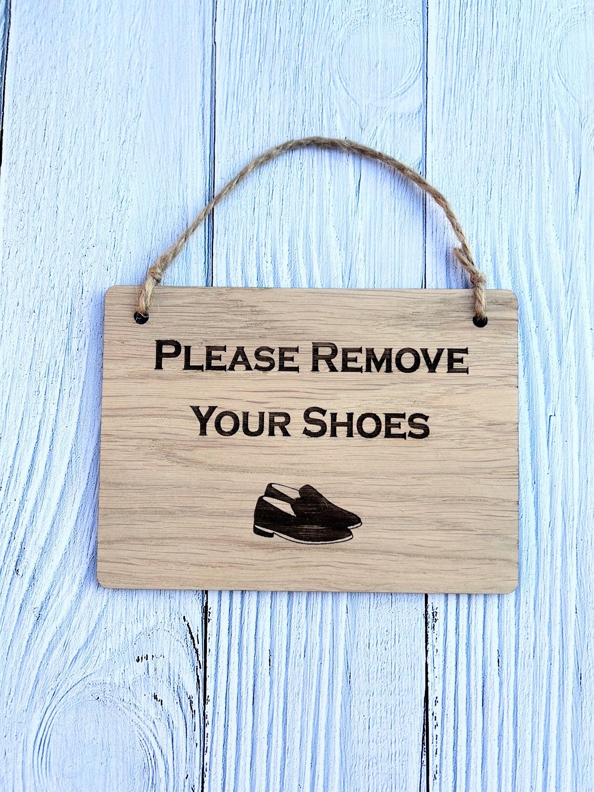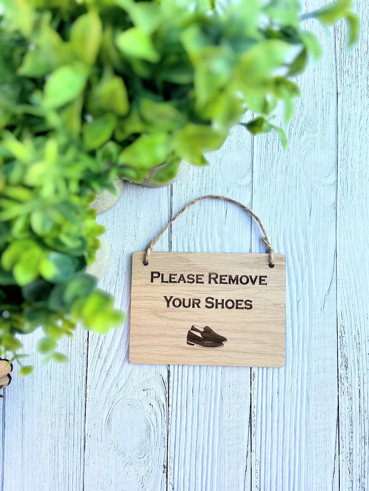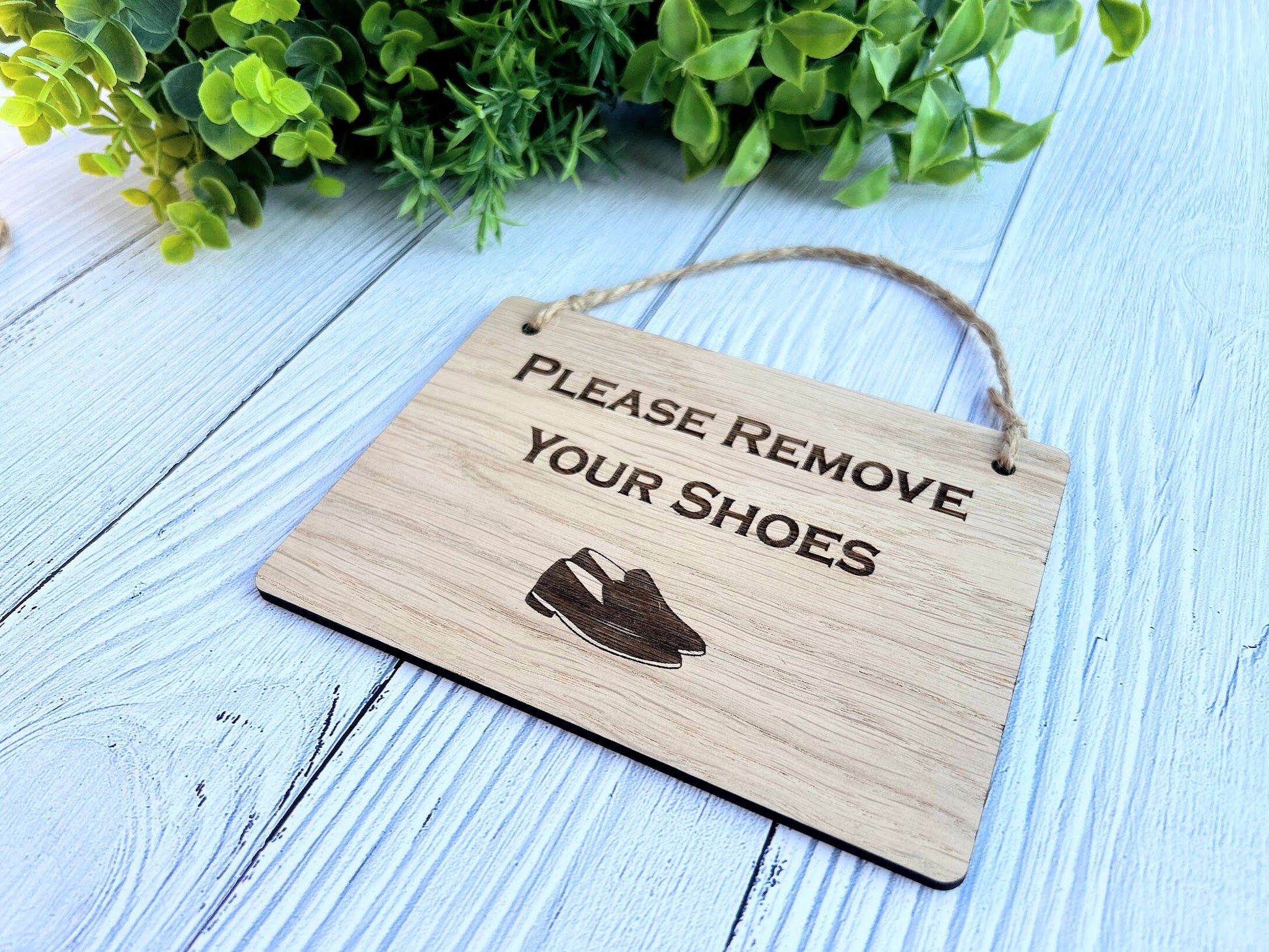 - Made from real Oak veneer and engraved with PLEASE REMOVE YOUR SHOES along with an engraved image of shoes