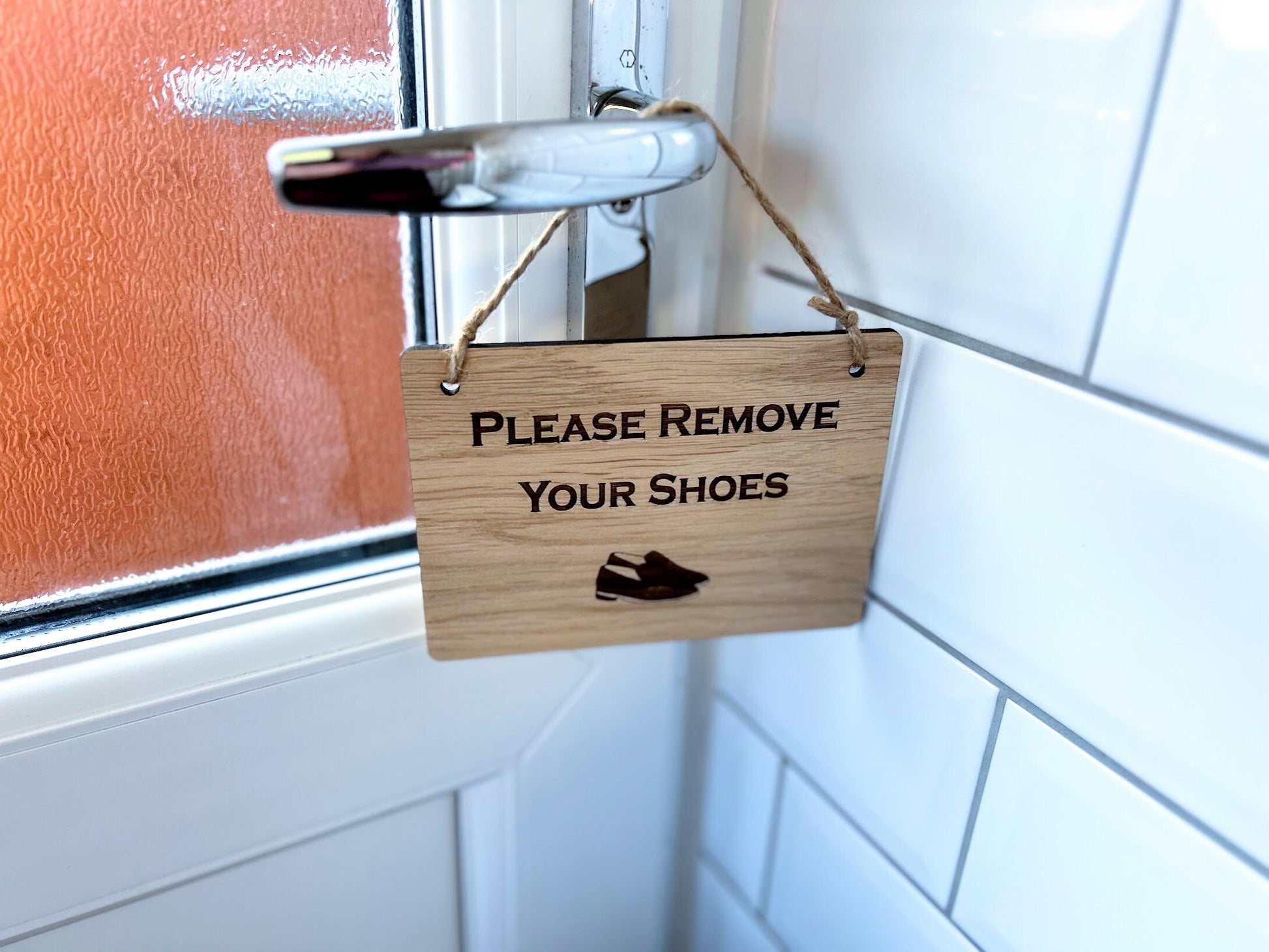 We have custom designed the wooden sign to include an easy to read font accompanied by an engraving of shoes to help standout and remind your friends, family or guests to remove their footwear.