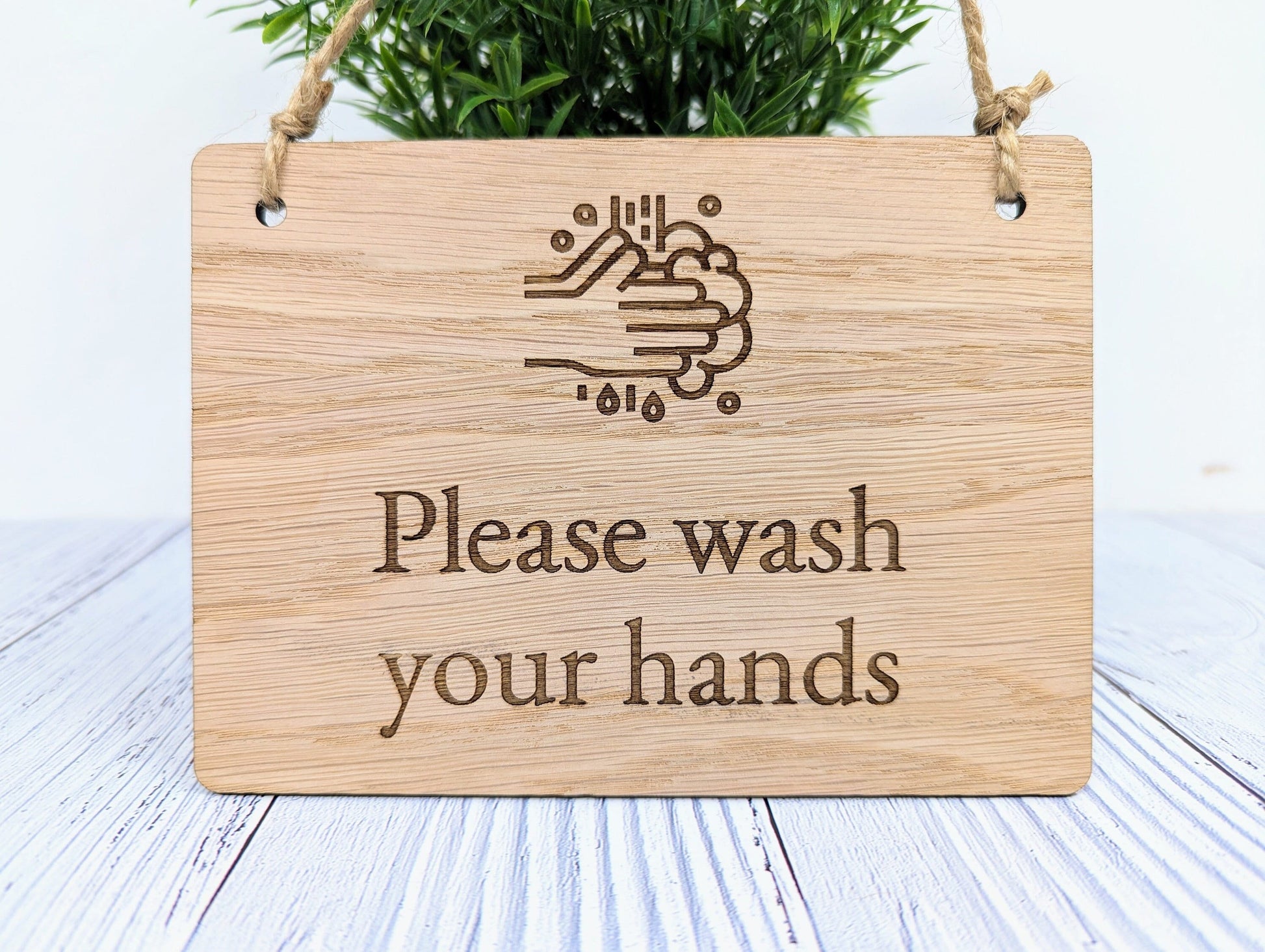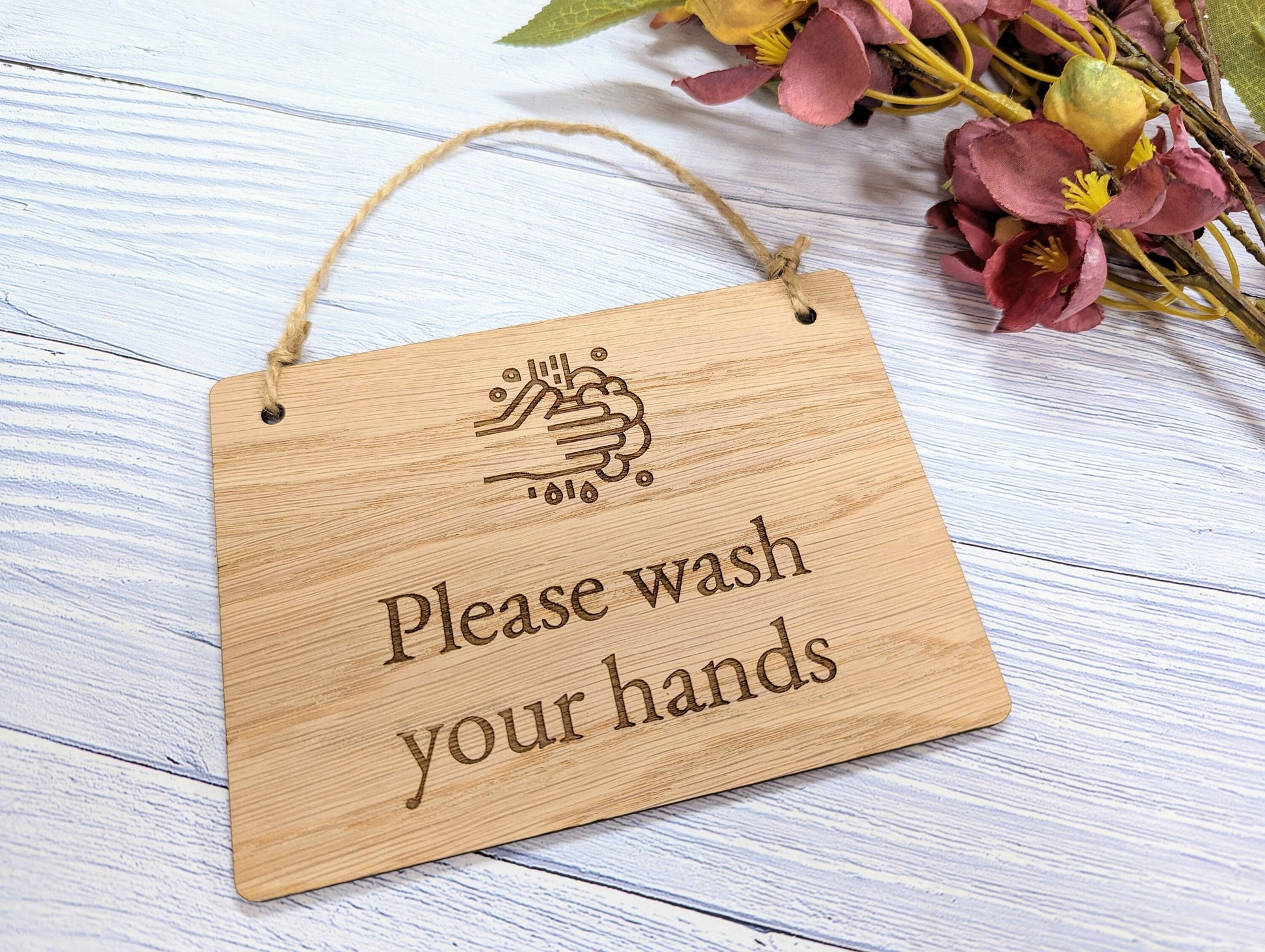 Please Wash Your Hands" Wooden Sign - Oak Veneered MDF - Ideal for Homes, Offices, Restaurants - Hygiene Reminder - Easy to Install