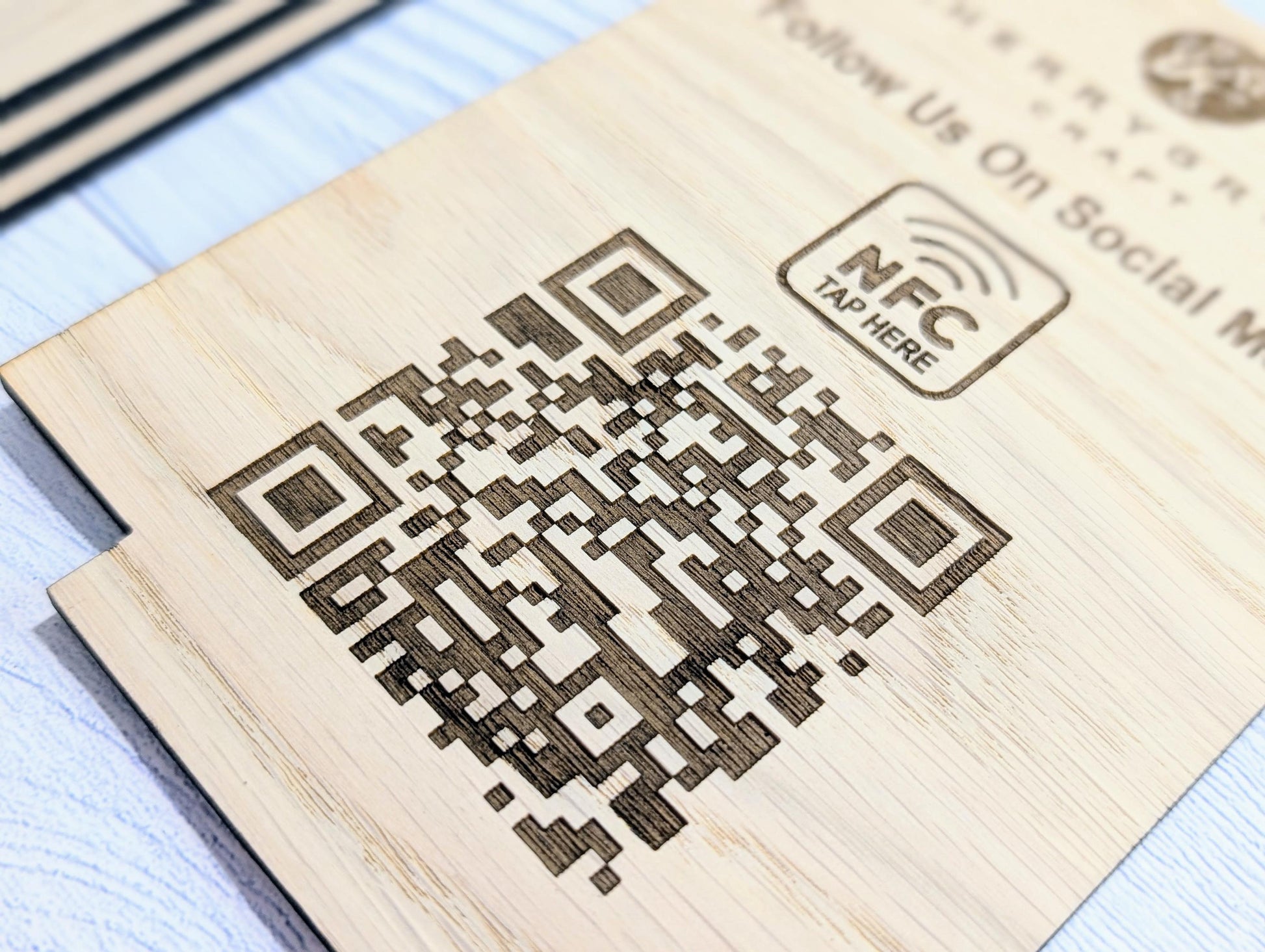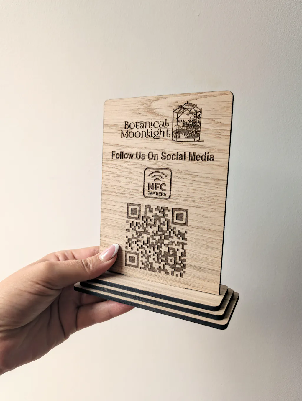 QR Code AND NFC 'Follow Us on Social Media', Tap or Scan Link, Custom Wooden Table Sign, Personalised Logo & Social Media Link, 2 Sizes