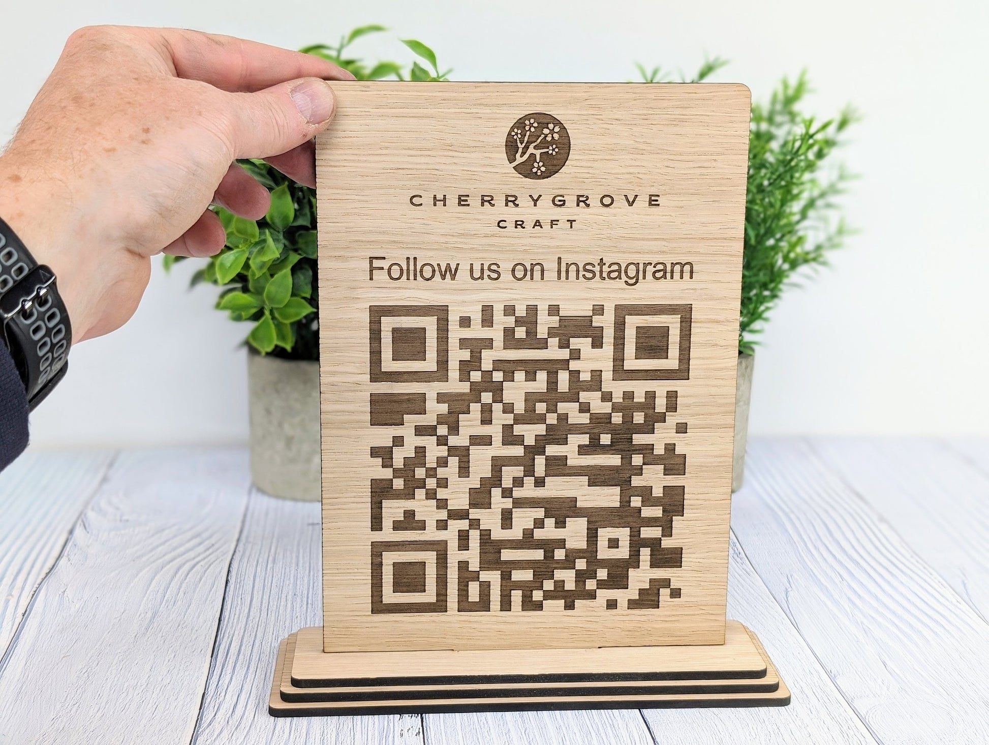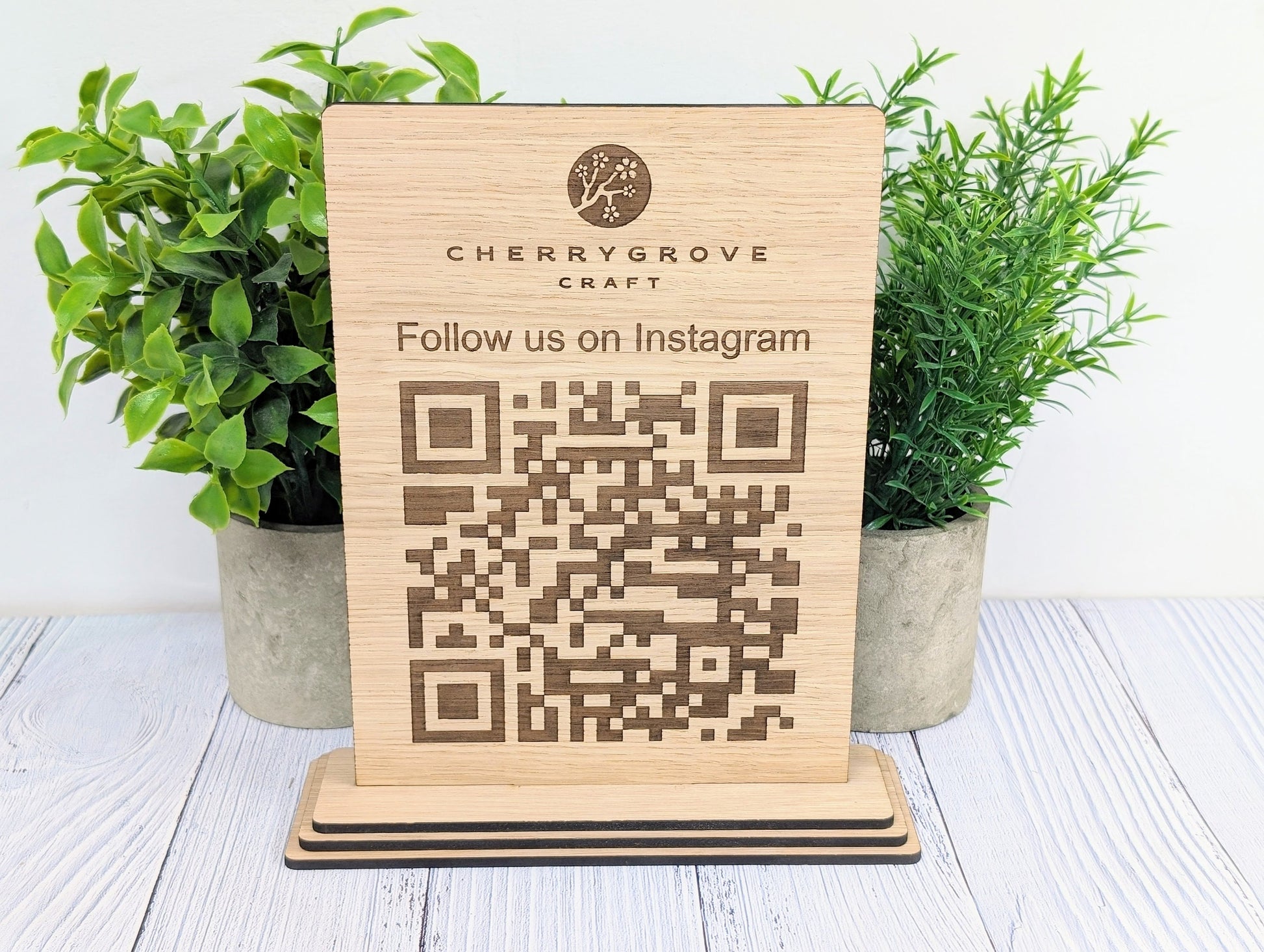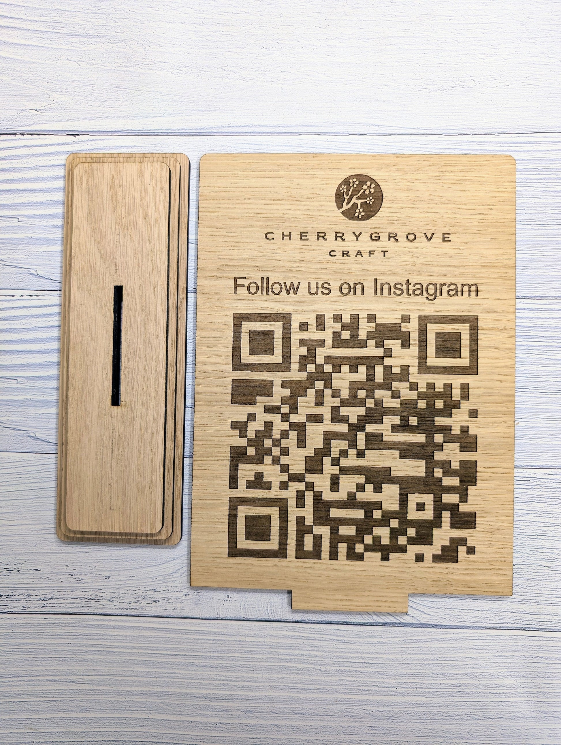 QR Code 'Follow Us on Instagram' Custom XL Wooden Table Sign, Personalised Logo & Social Media Link, Eco-Friendly, Business Use, Extra Large