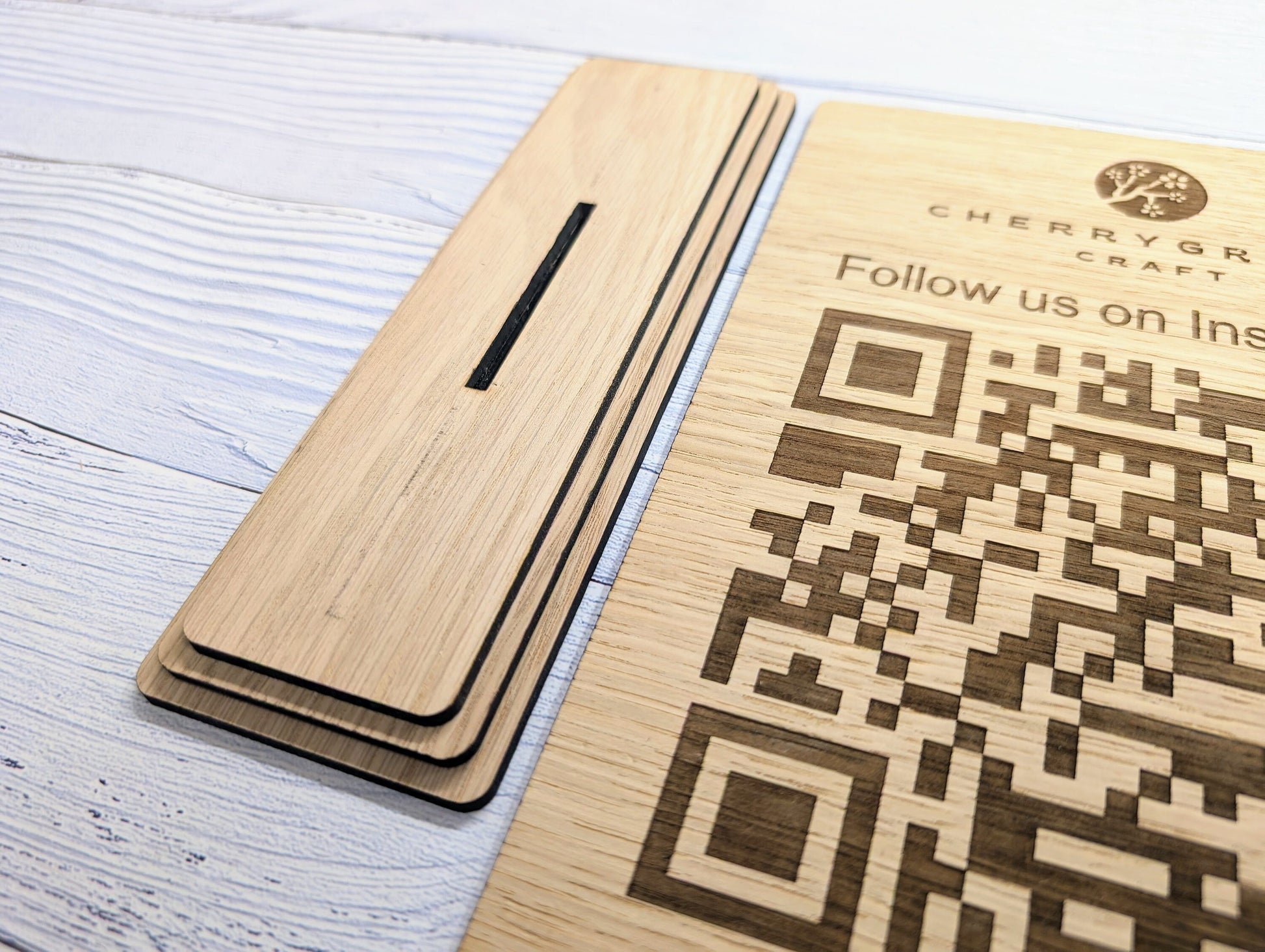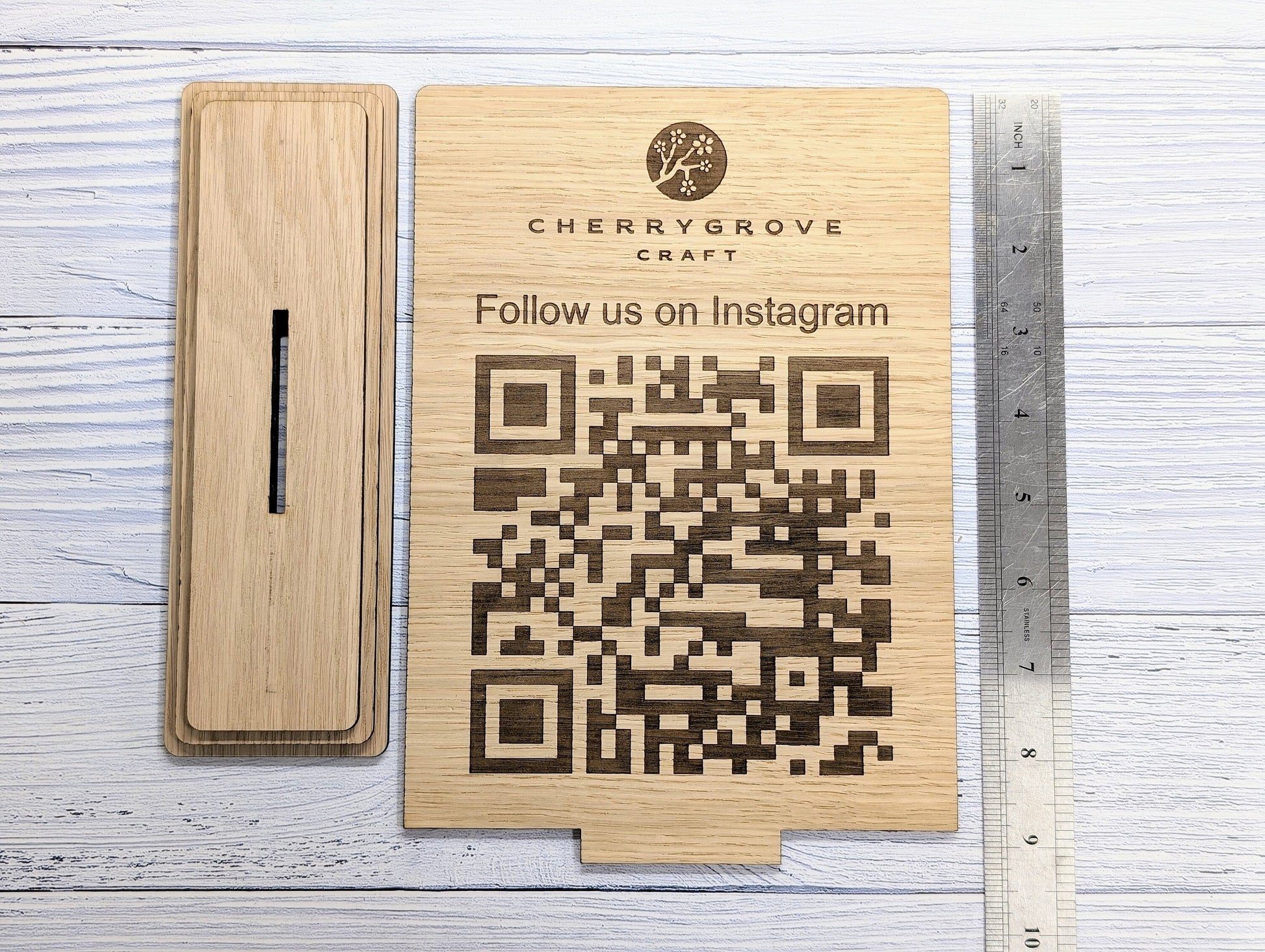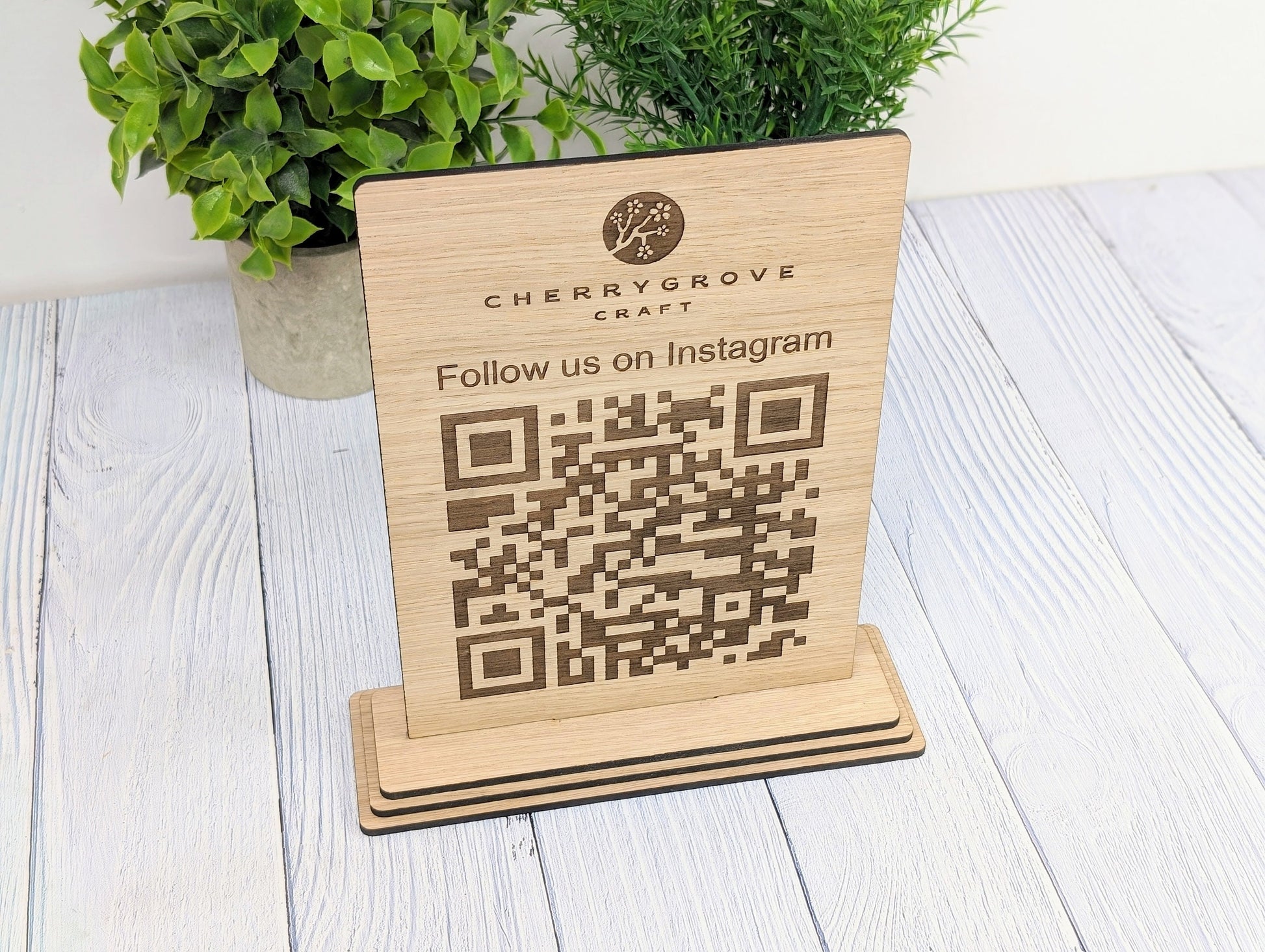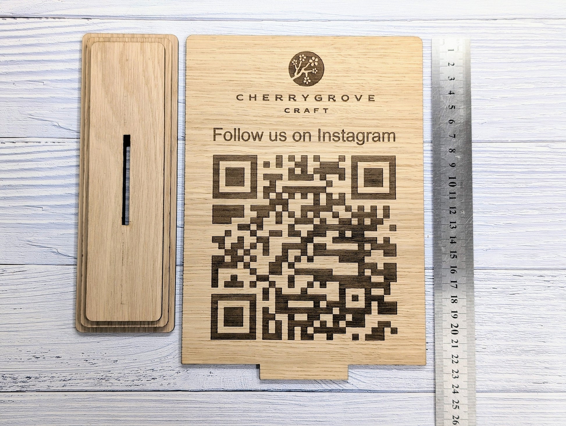 QR Code 'Follow Us on Instagram' Custom XL Wooden Table Sign, Personalised Logo & Social Media Link, Eco-Friendly, Business Use, Extra Large