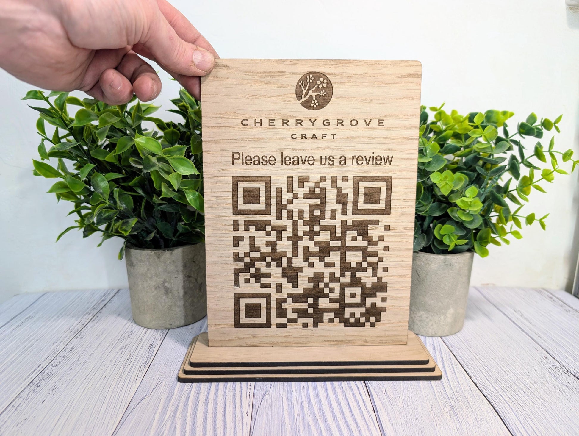 QR Code 'Leave us a review' Custom Wooden Table Sign, Personalised Logo & Link, Eco-Friendly, XL Size | Google, Trustpilot, Tripadvisor etc
