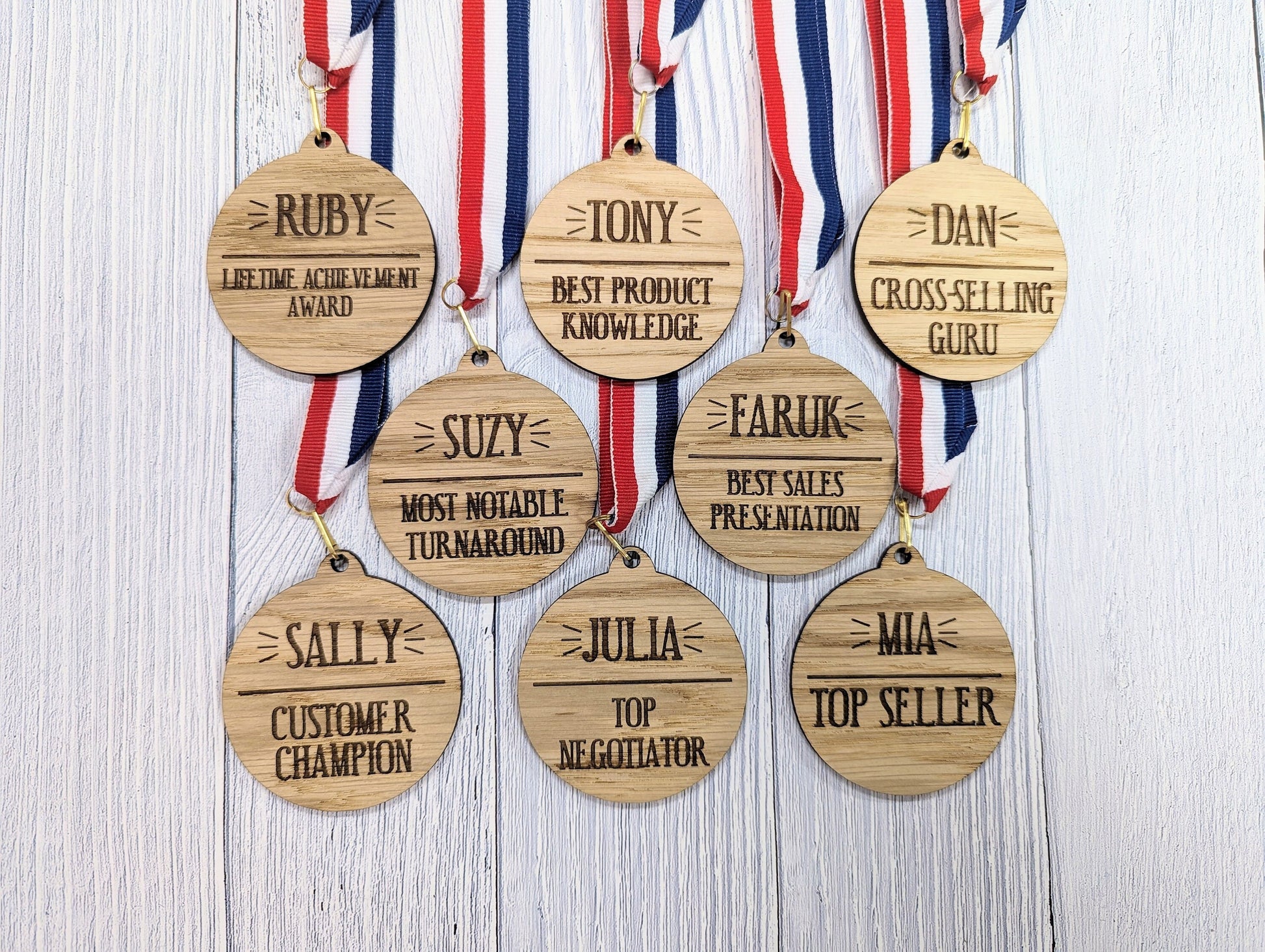 Sales Excellence Wooden Medal: Personalised Award for Motivating Sales Teams with Tri-Coloured Ribbon